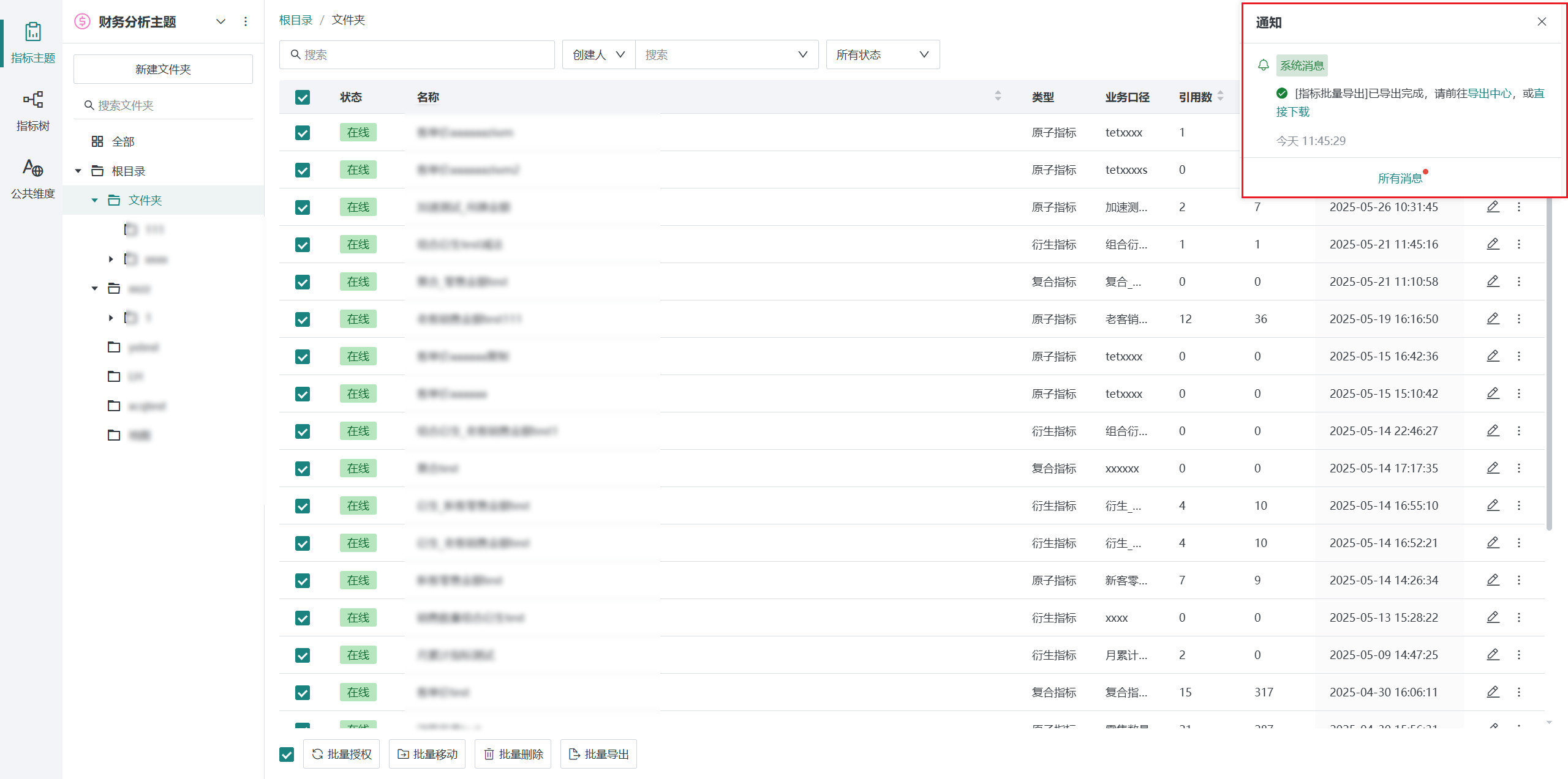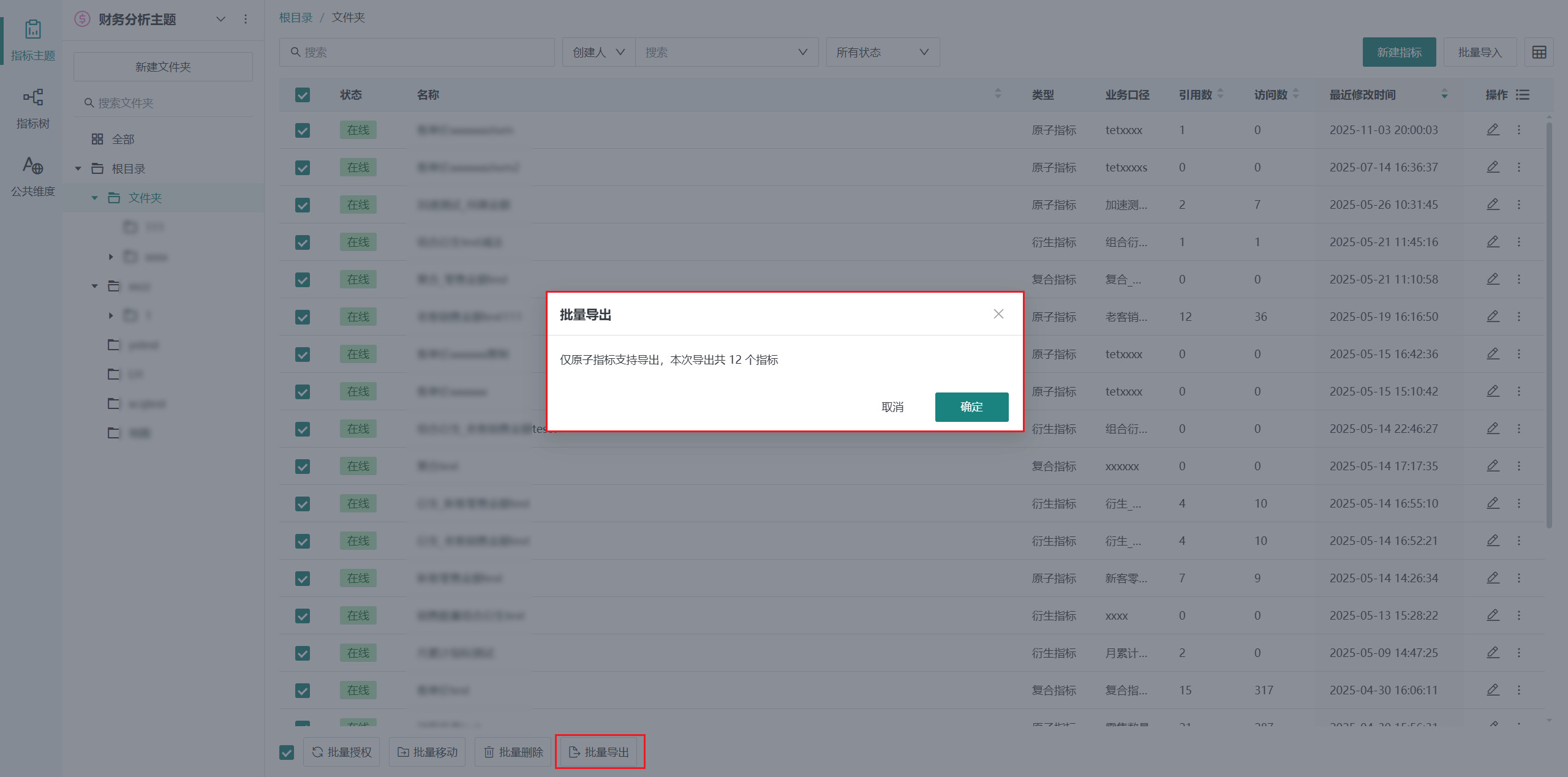 勾选所需导出指标,勾选时如果本批选中的指标中包括原子指标,则展示「批量导出」按钮,点击后弹出本次导出的原子指标数量,确认无误后点击「确定」。