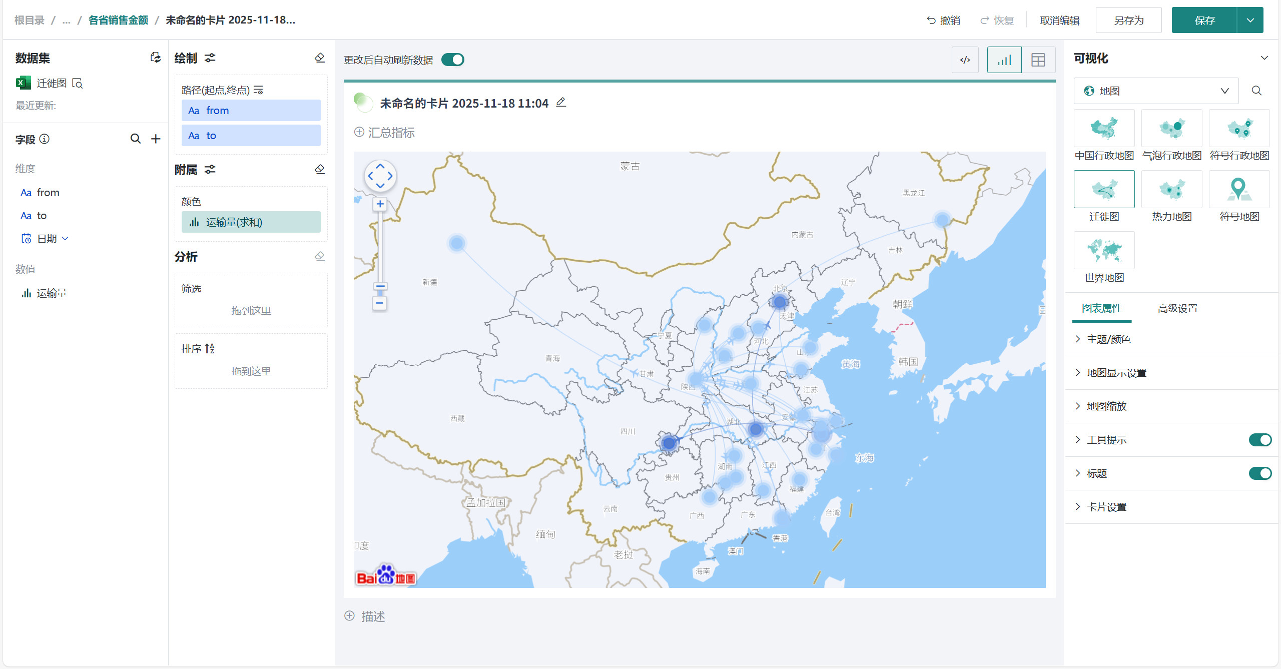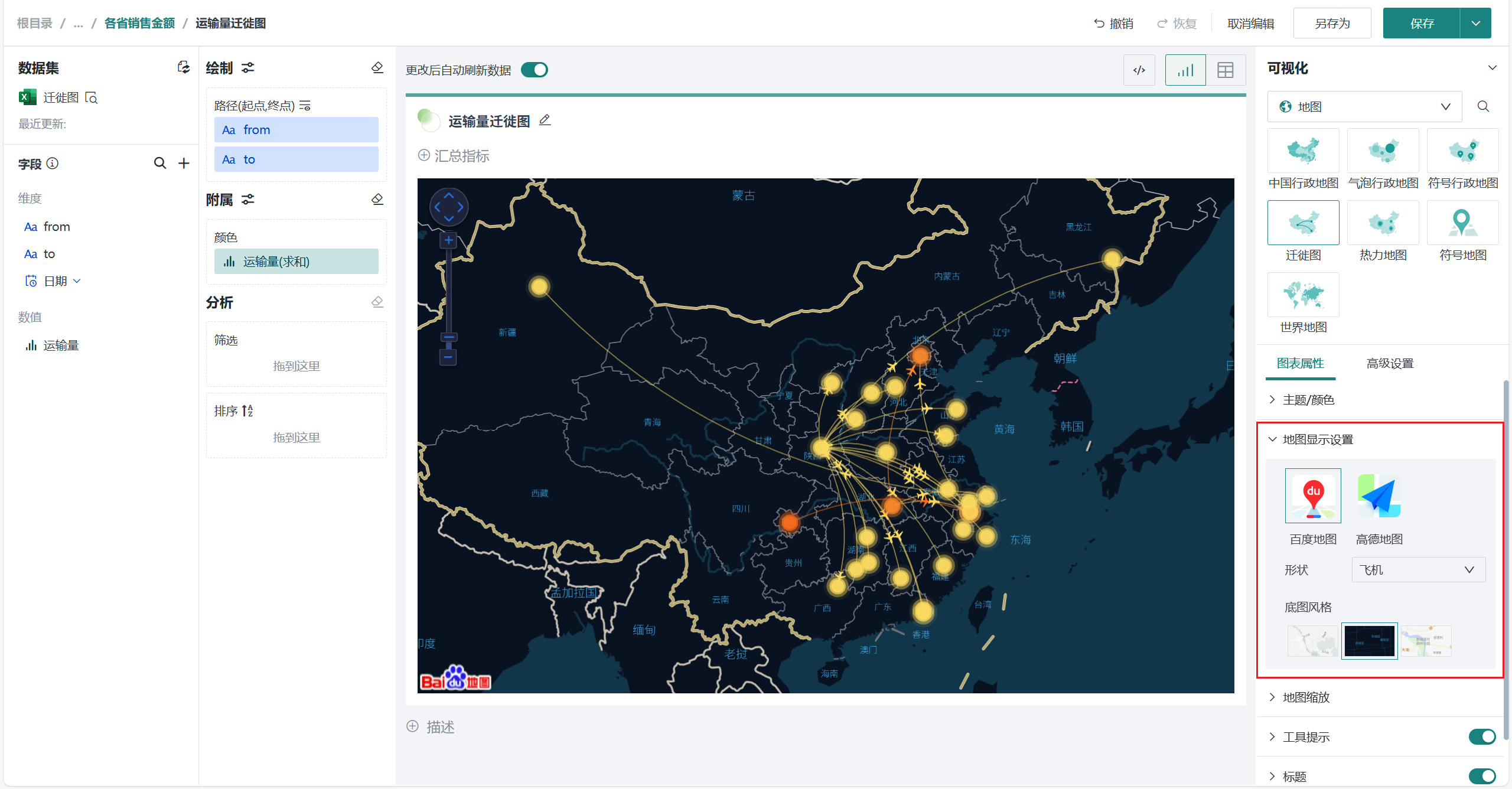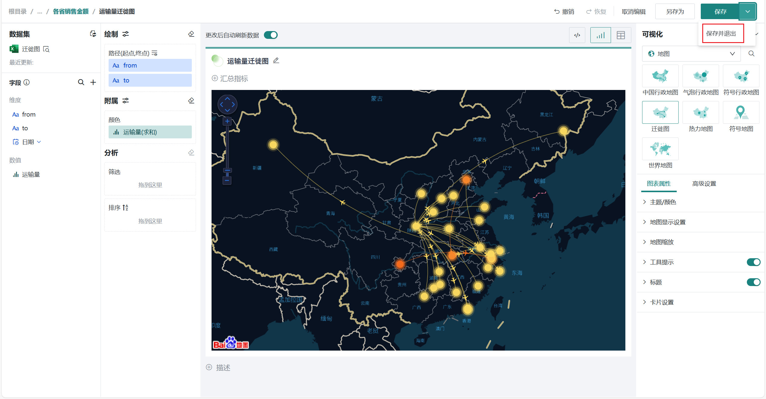 在「可视化」区域「地图」中选择「迁徙图」,将左侧「数据集」区域的起点位置字段和终点位置字段拖至「绘制」区域的「路径」(起点在前,终点在后),将流量数值字段(如「运输量」)拖入「颜色」。