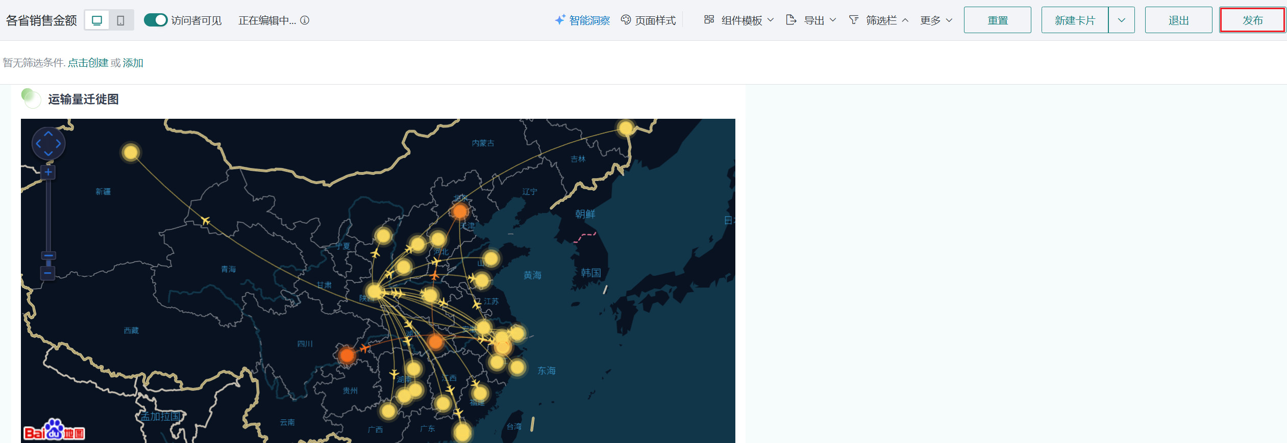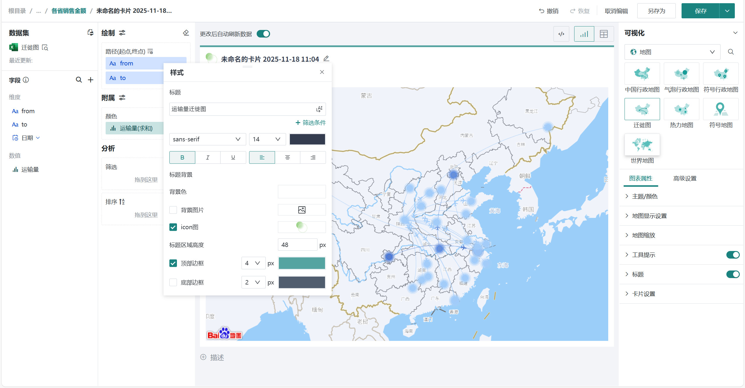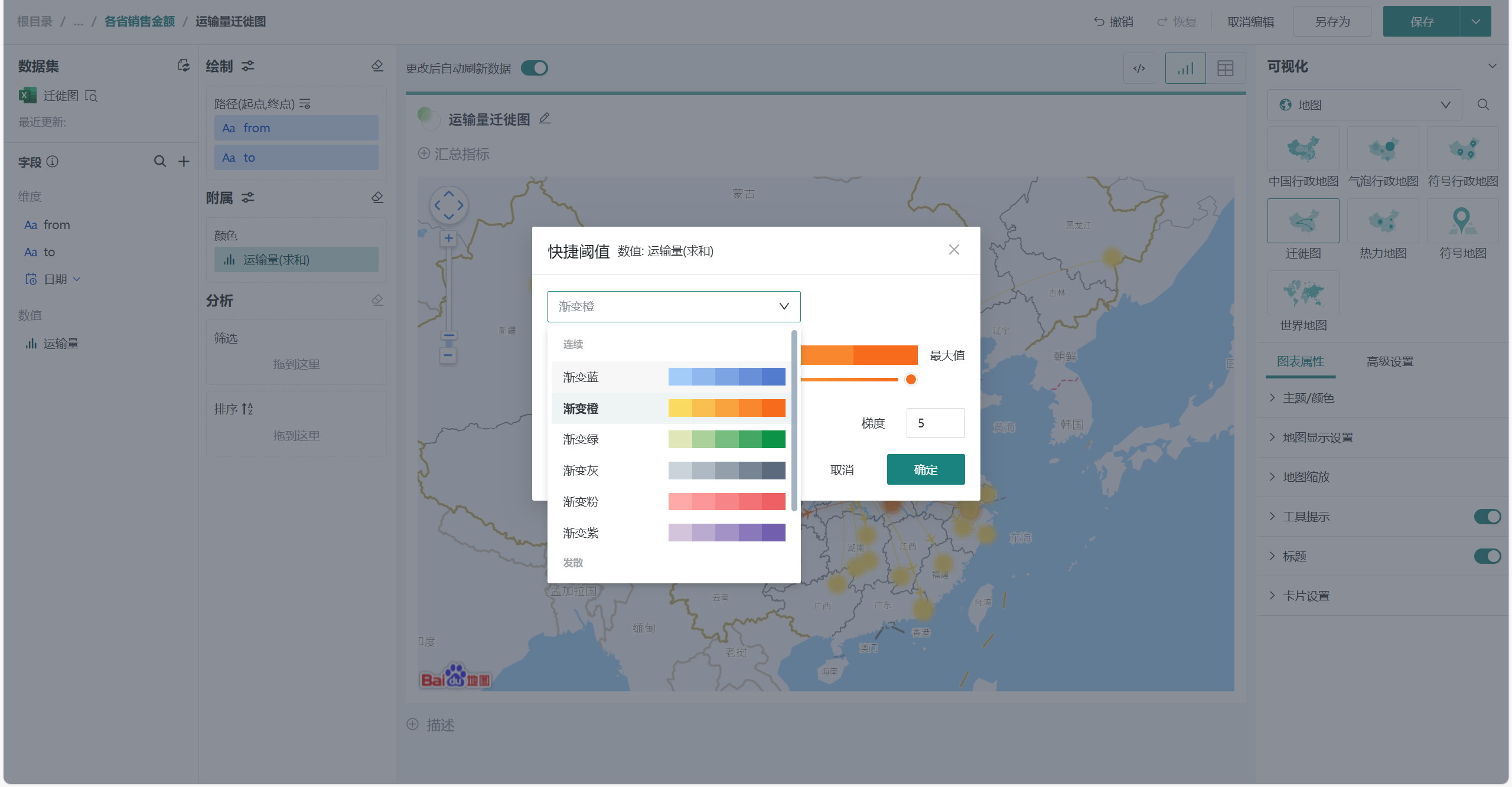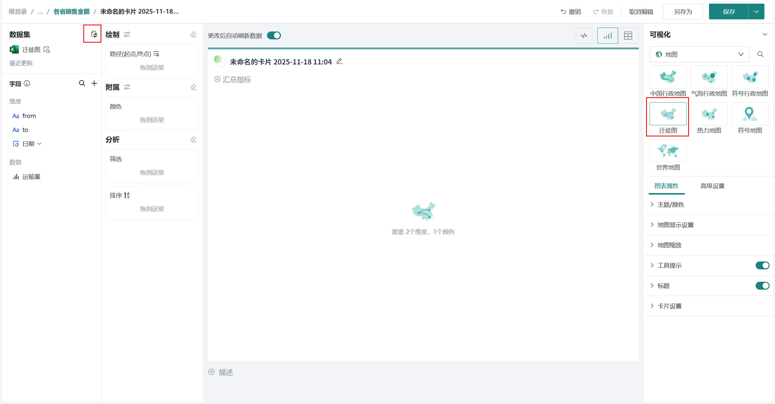 在「可视化」区域「地图」中选择「迁徙图」,将左侧「数据集」区域的起点位置字段和终点位置字段拖至「绘制」区域的「路径」(起点在前,终点在后),将流量数值字段(如「运输量」)拖入「颜色」。