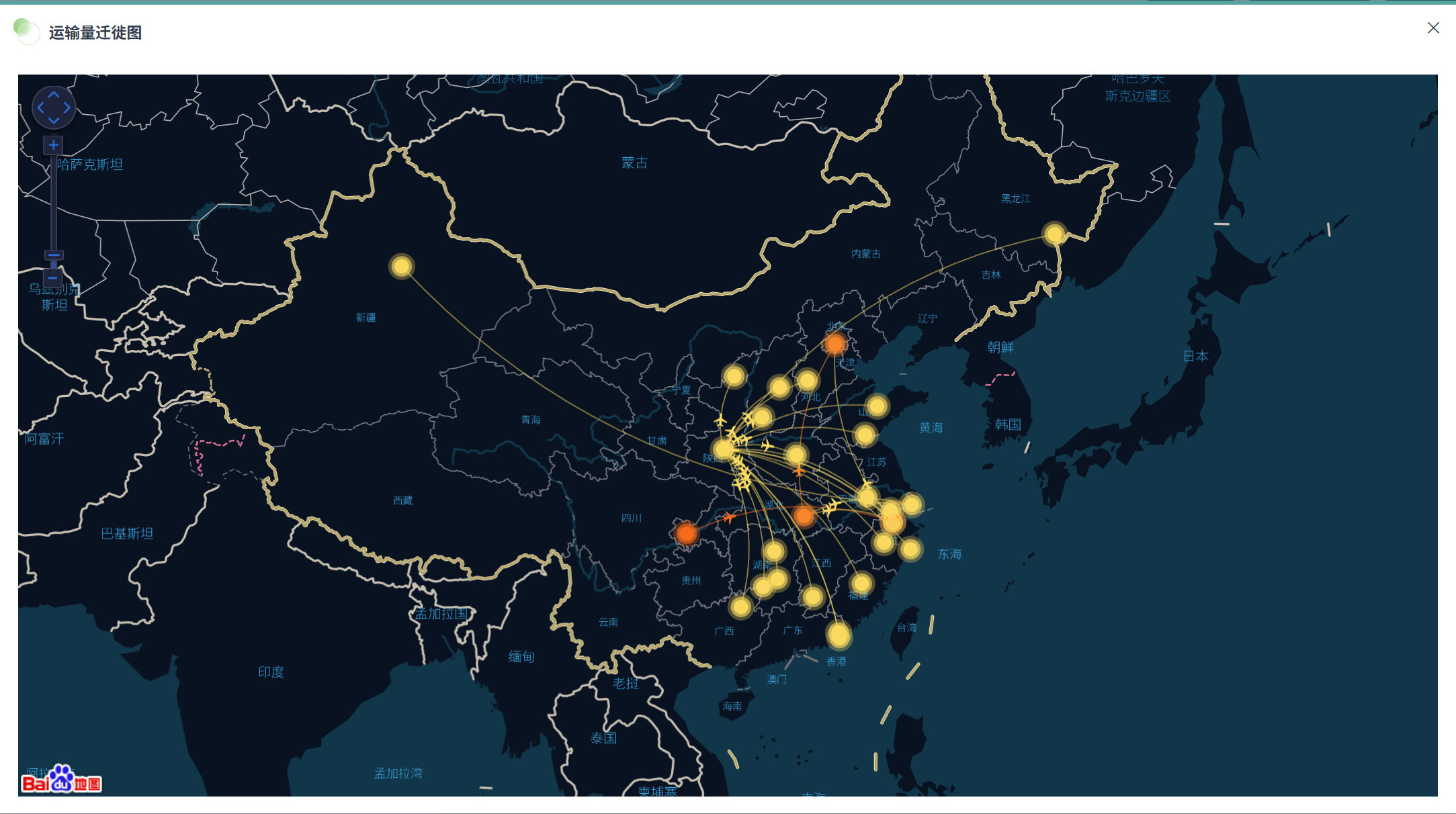 例如:春运人口迁徙流向、物流配送路线流量分布、城市间通勤流、电商订单配送流向、用户行为地域流动路径等,如图所示: