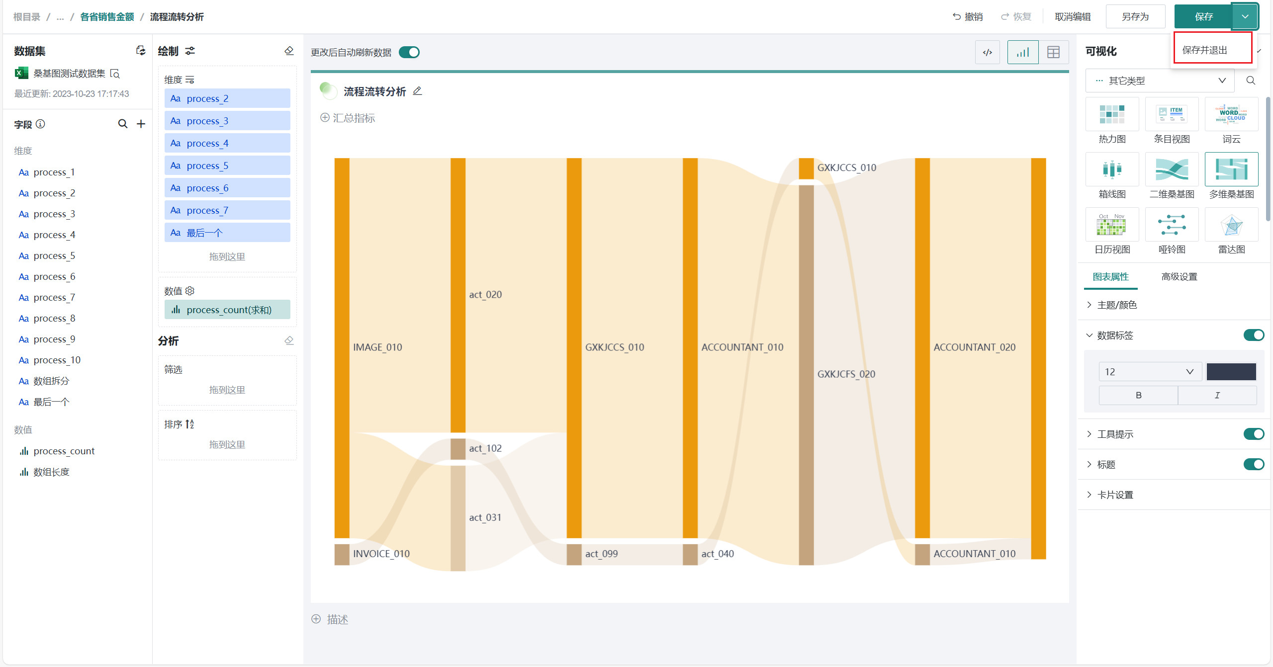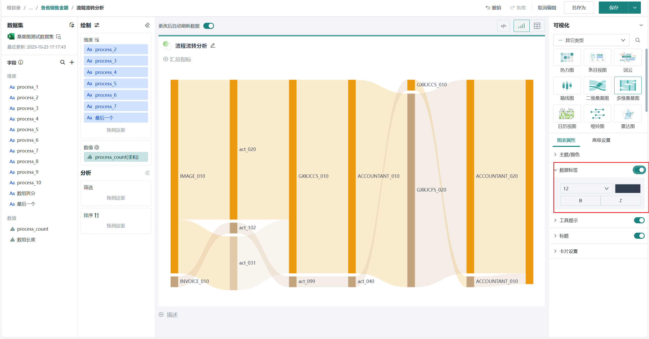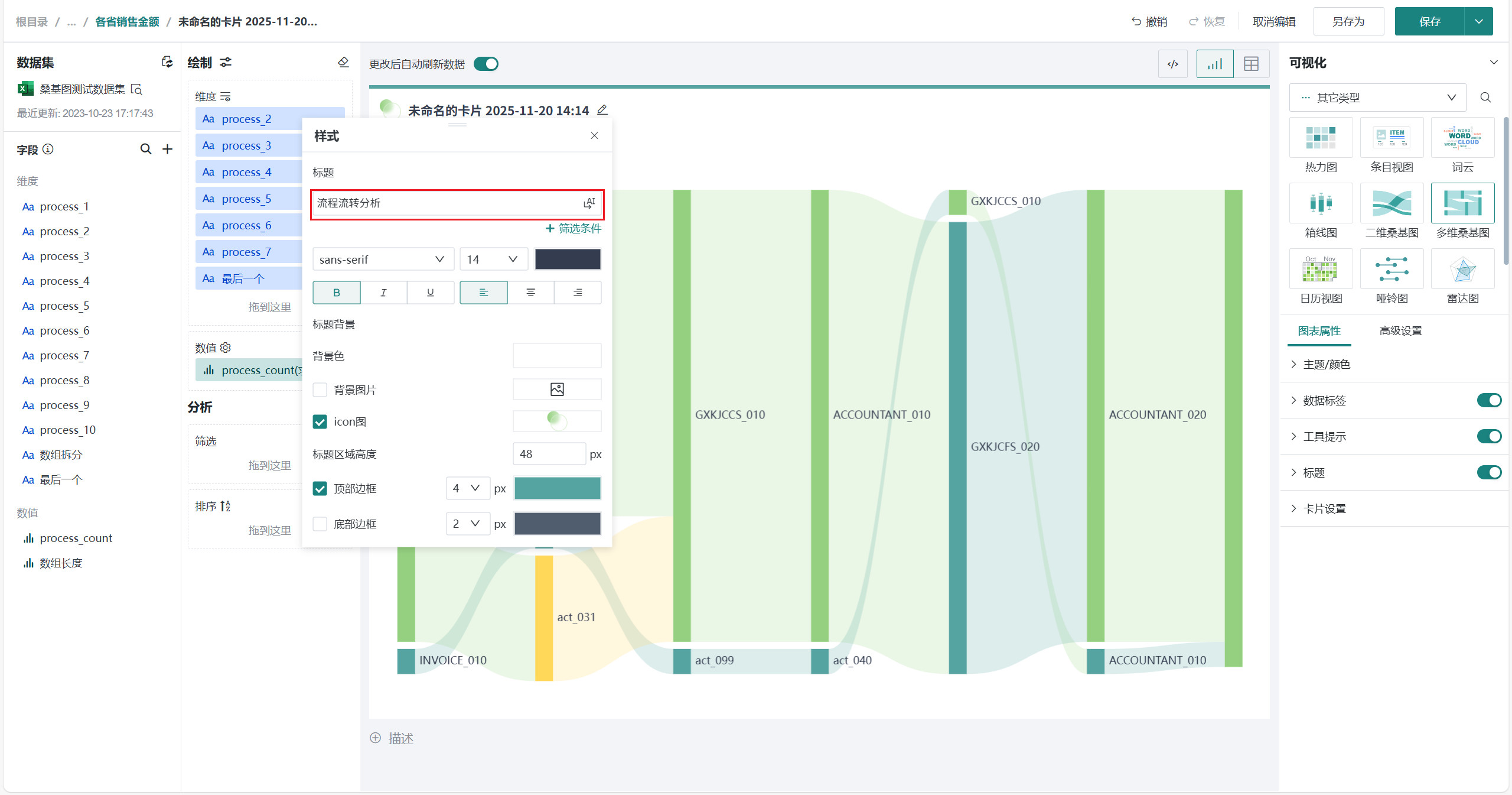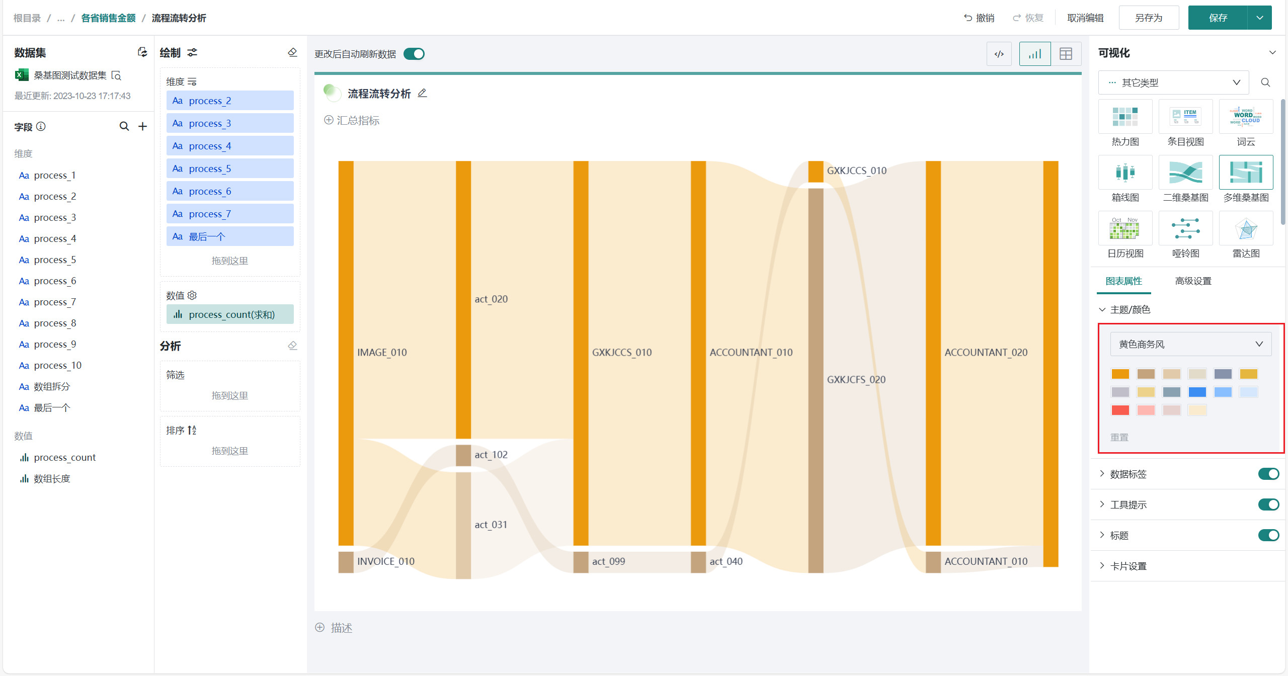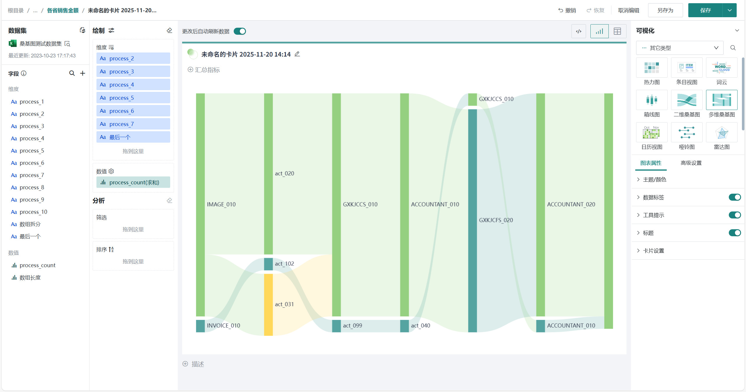 选择「可视化>其它类型>多维桑基图」,将左侧「数据集」区域的维度字段(如「初始渠道」、「中间渠道」、「最终转化」等)依次拖至「绘制」区域的「维度」位置,将流量字段(如「用户数」等)拖入「数值」。