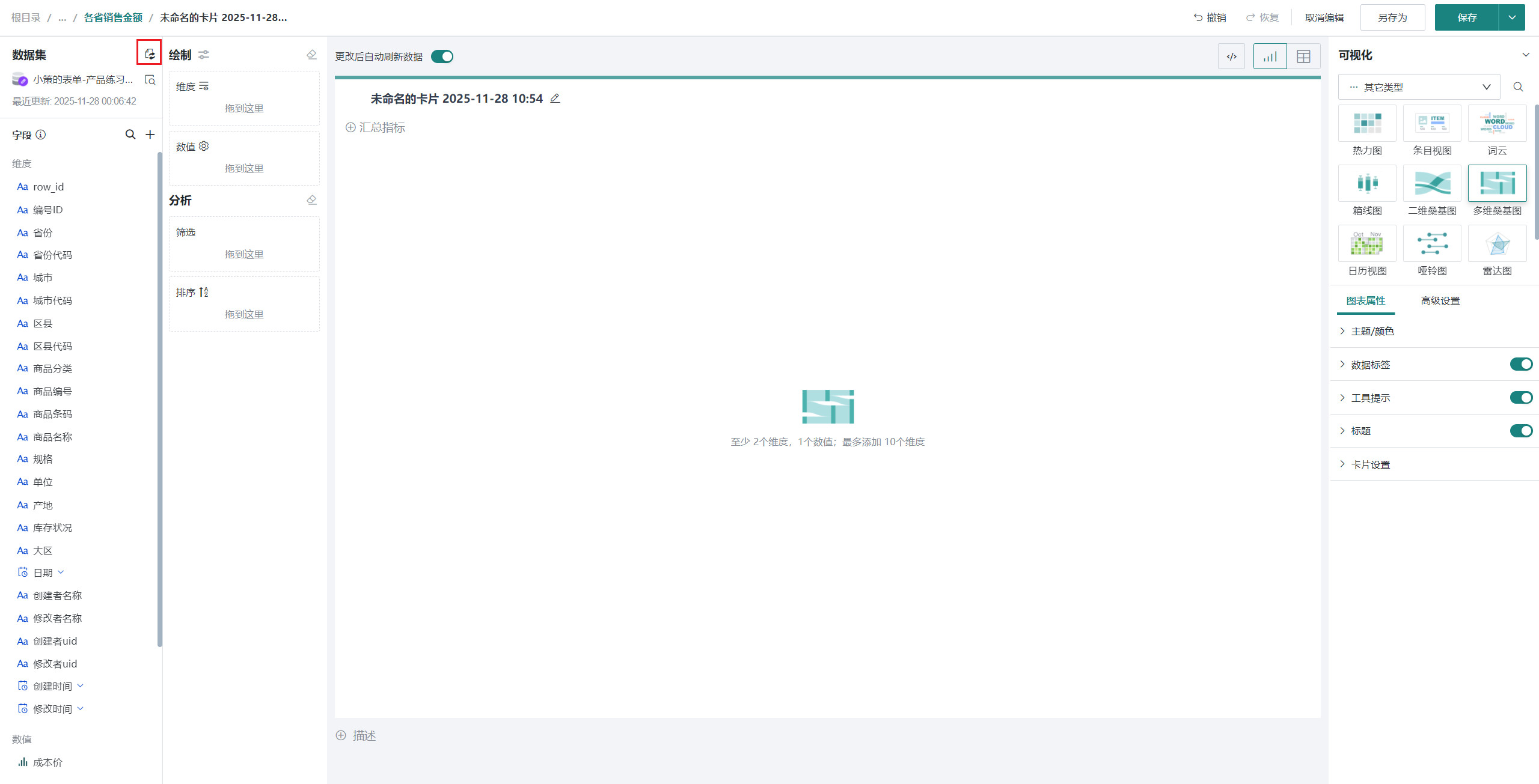 点击「新建卡片 > 可视化图表」,弹出「选择数据集」页面。