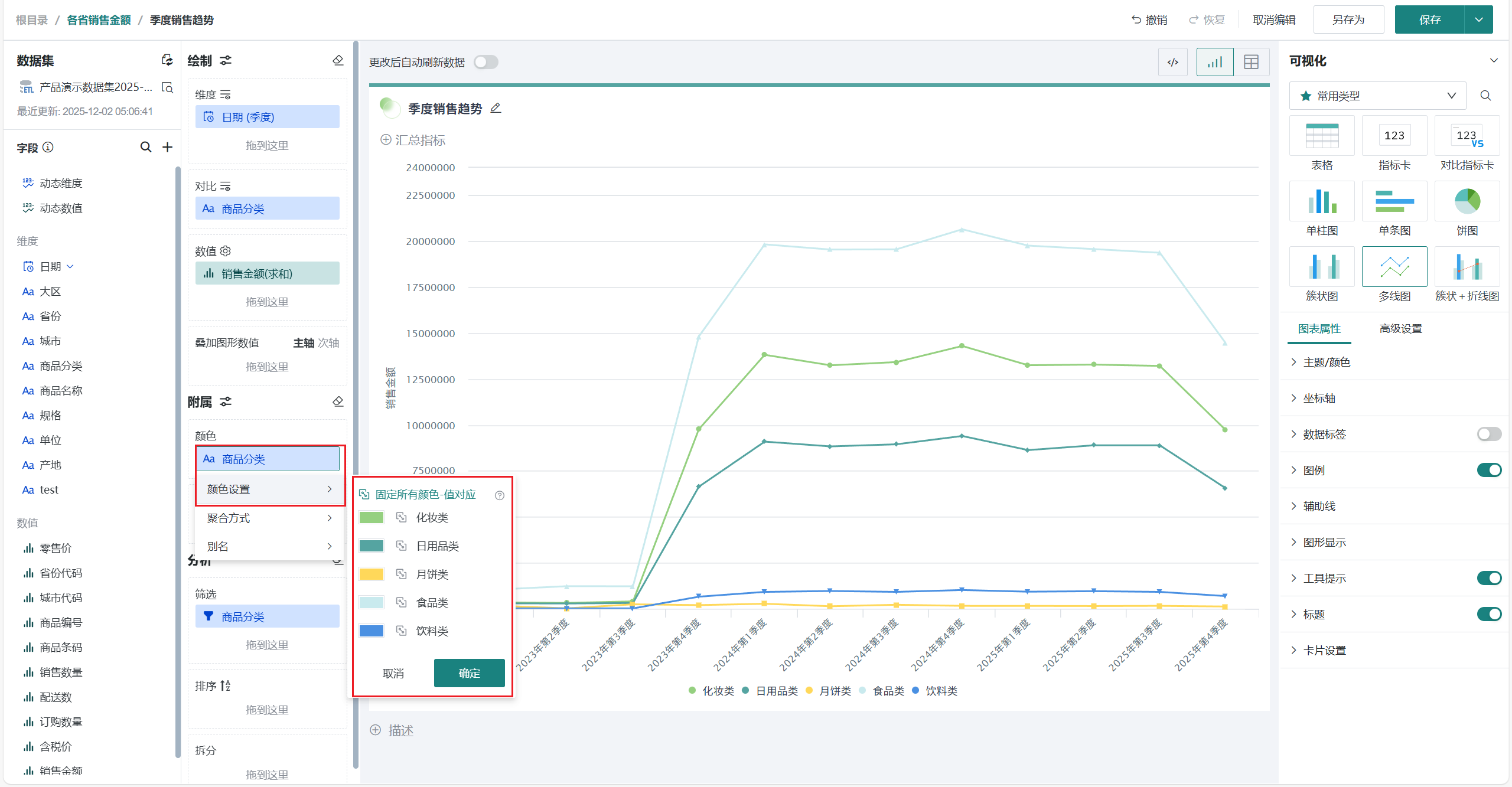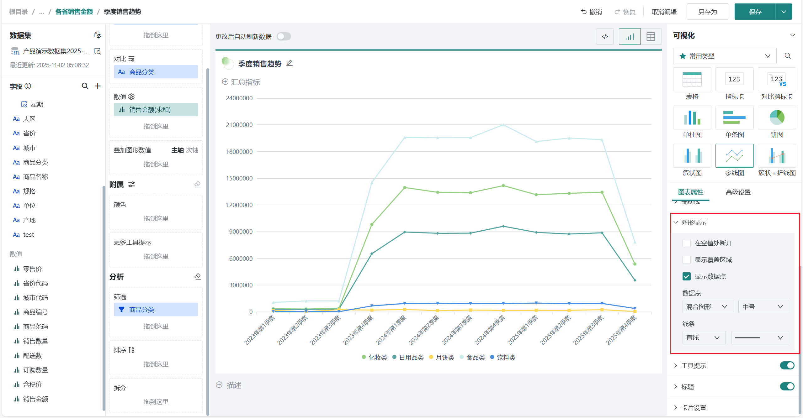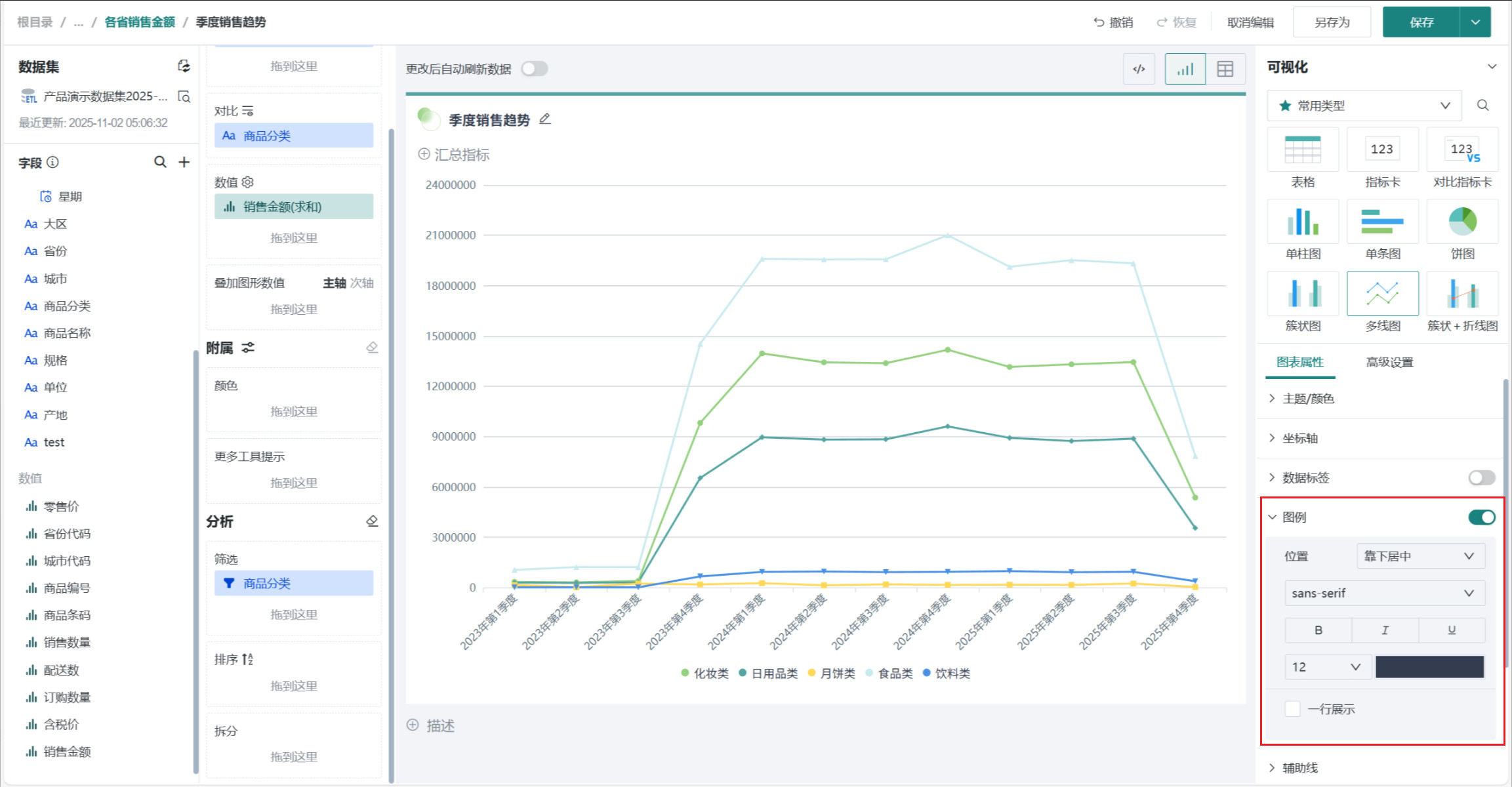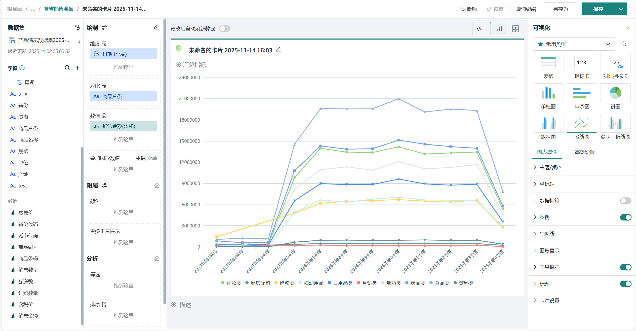 在「可视化」区域中选择「多线图」,将左侧「字段」区域的时间字段(如「日期」)拖至「绘制」区域的「维度」,将分类字段(如「商品分类」)拖至「对比」,将数值字段(如「销售金额」)拖入「数值」区域。