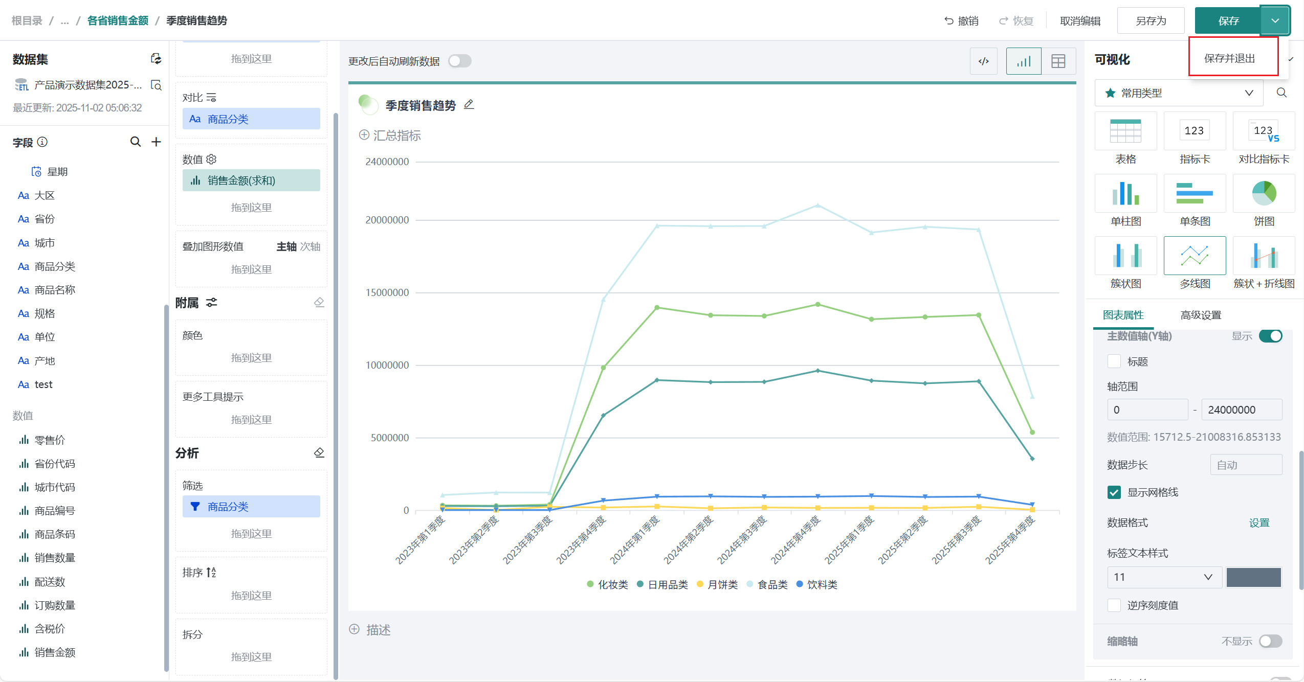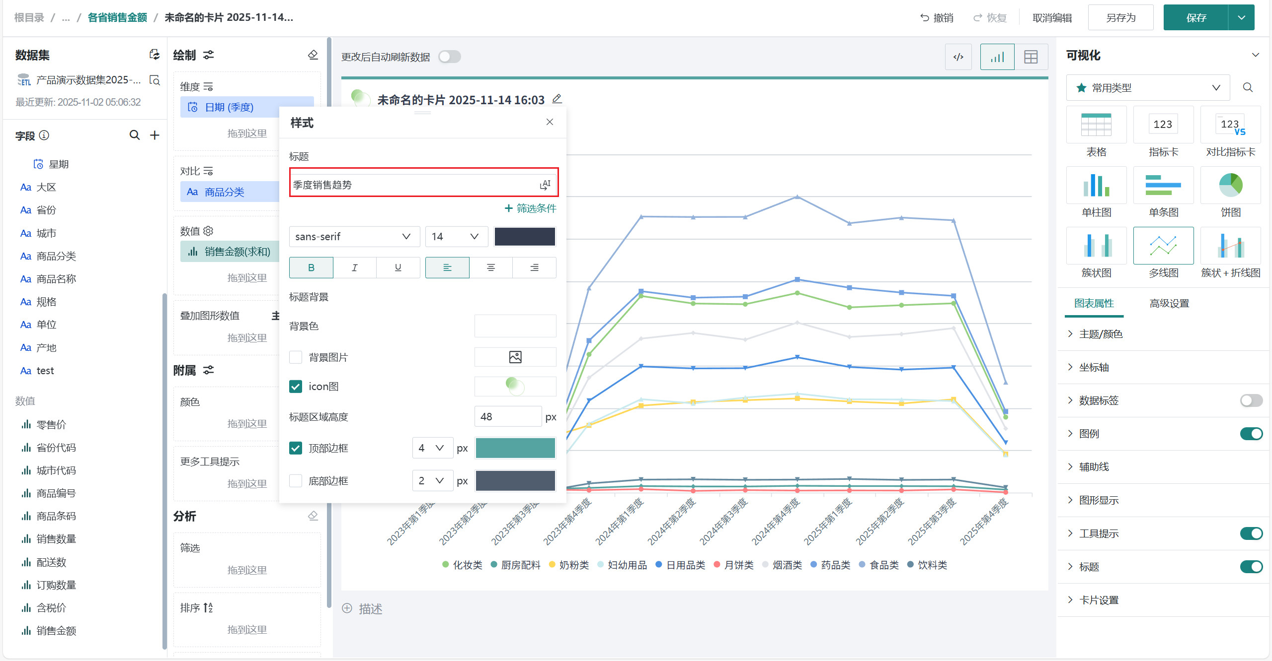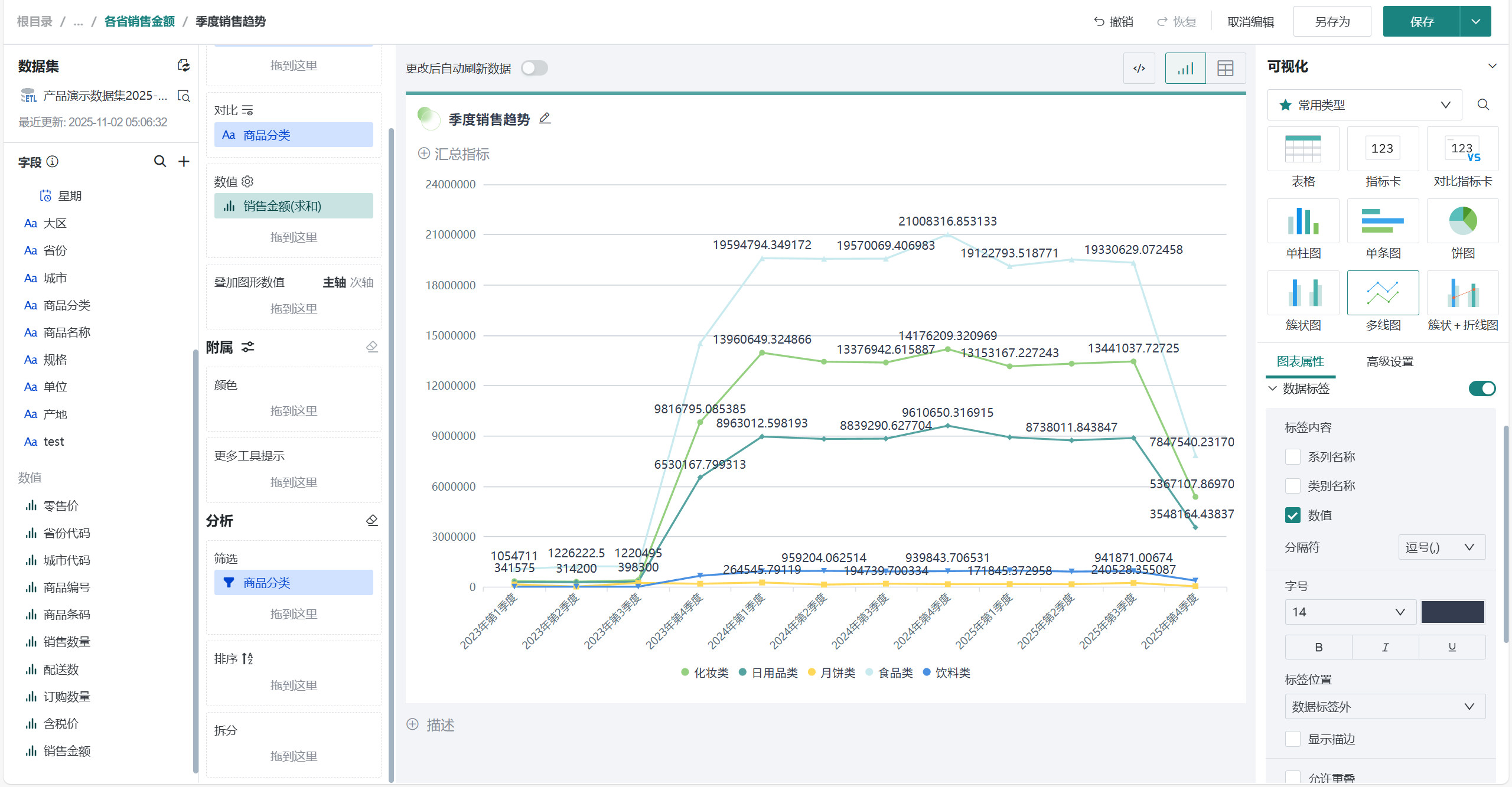 在「可视化」区域中选择「多线图」,将左侧「字段」区域的时间字段(如「日期」)拖至「绘制」区域的「维度」,将分类字段(如「商品分类」)拖至「对比」,将数值字段(如「销售金额」)拖入「数值」区域。