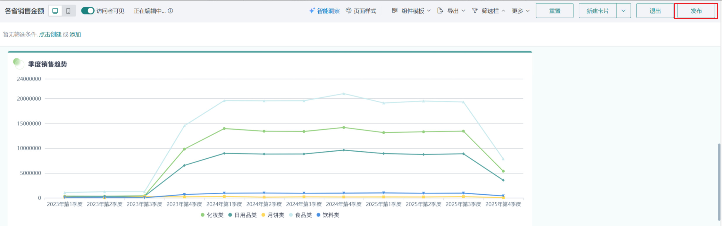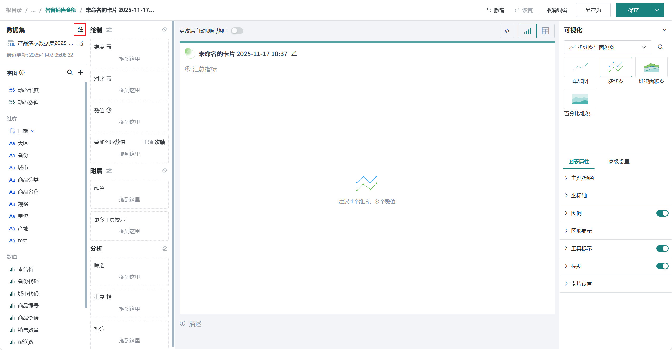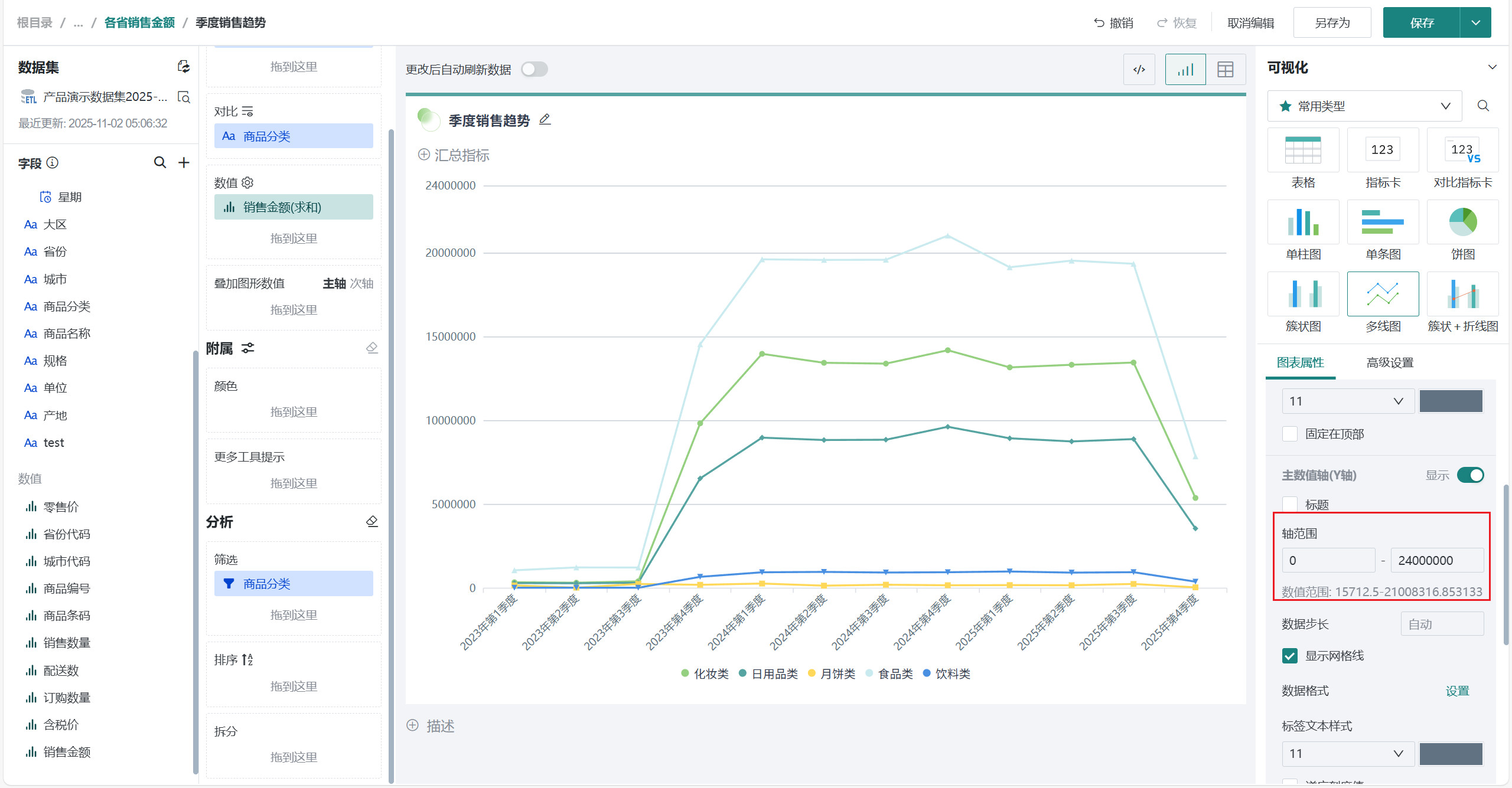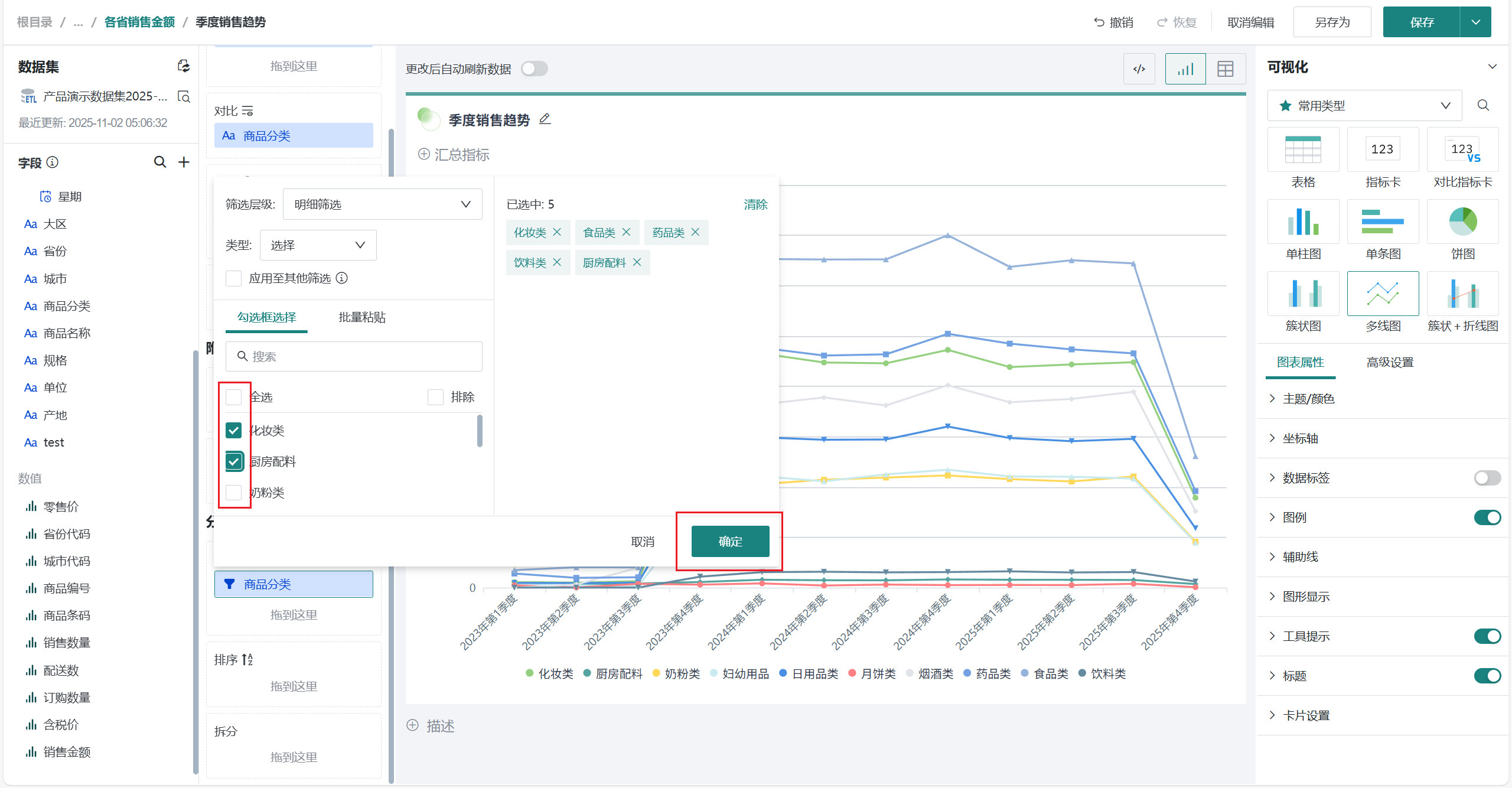 在「可视化」区域中选择「多线图」,将左侧「字段」区域的时间字段(如「日期」)拖至「绘制」区域的「维度」,将分类字段(如「商品分类」)拖至「对比」,将数值字段(如「销售金额」)拖入「数值」区域。