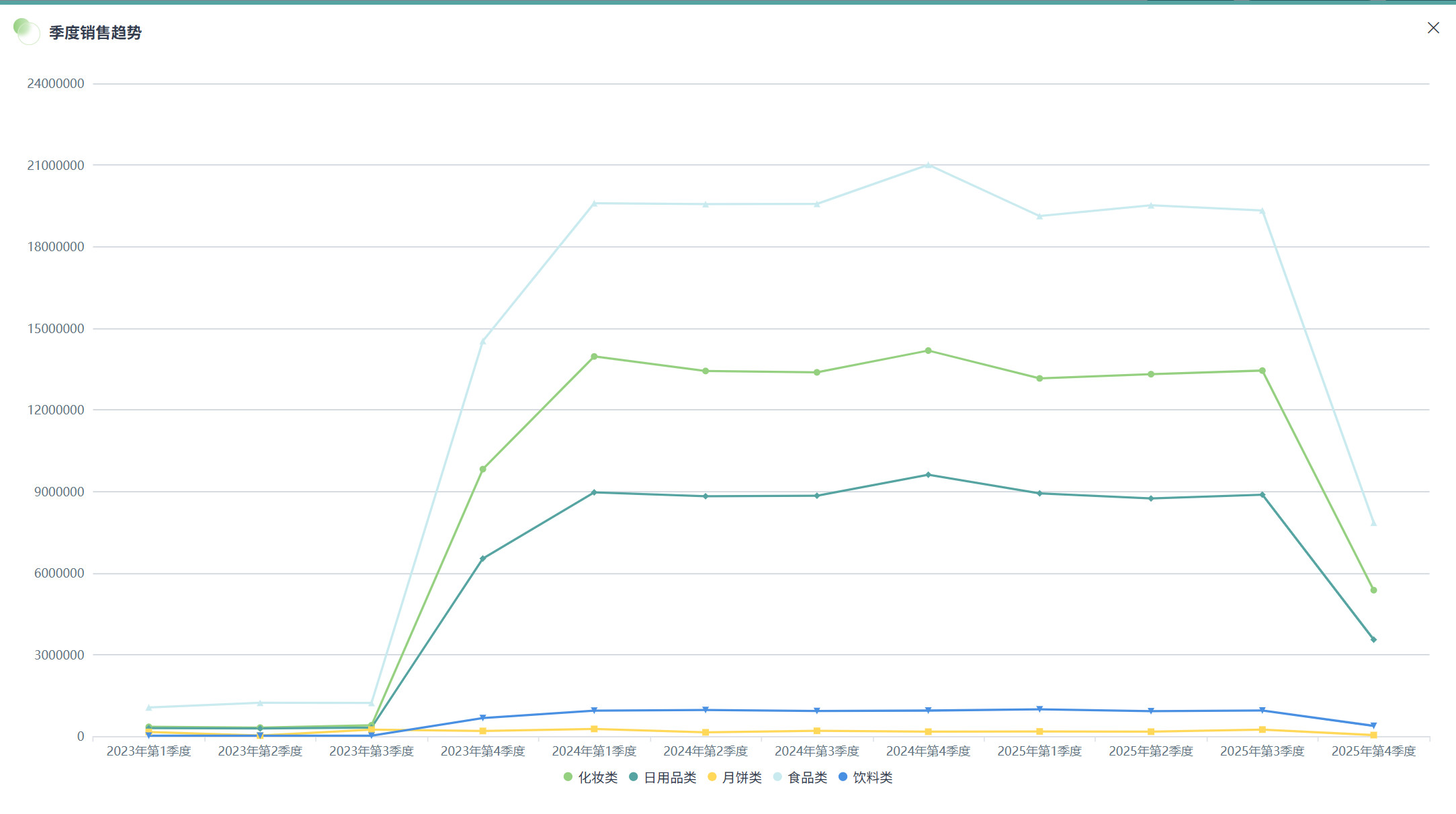 多线图是一种强大的可视化图表,它在同一坐标系中展示多条数据线条,每条线条代表一个数据系列。多线图通过连接各个数据点的线条,不仅能够展示各数据系列随时间或其他有序变量的变化趋势,还能直观地进行多维度数据的对比分析,帮助用户识别不同数据系列之间的关系、差异和变化模式。