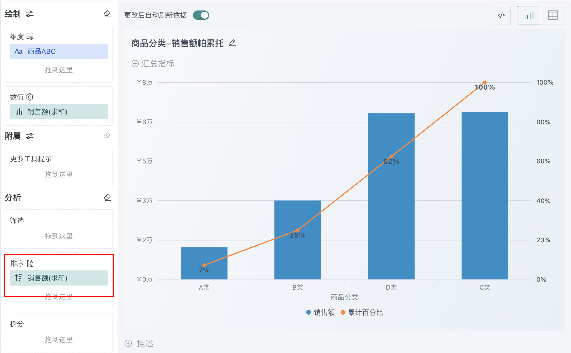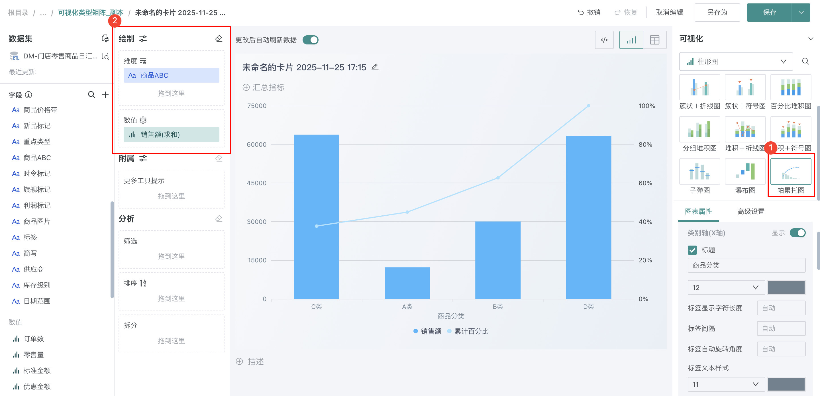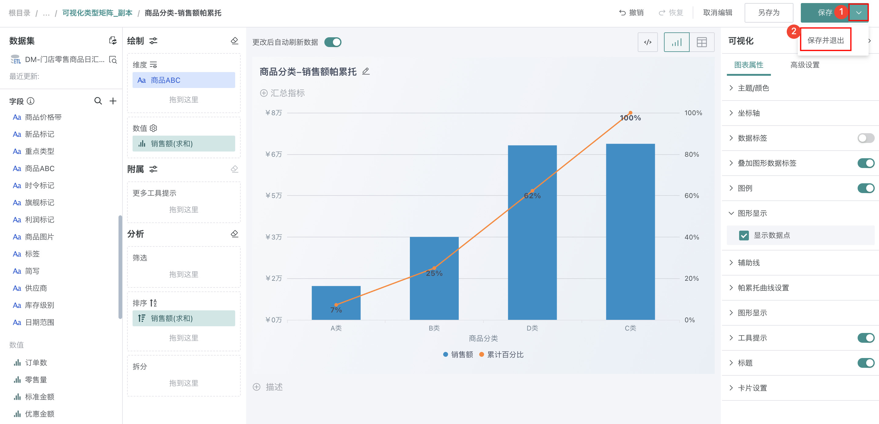 在「可视化」区域中选择「帕累托图」,将左侧「数据集」区域的「商品ABC」拖至「绘制」区域的「维度」,「销售额」拖至「数值」。