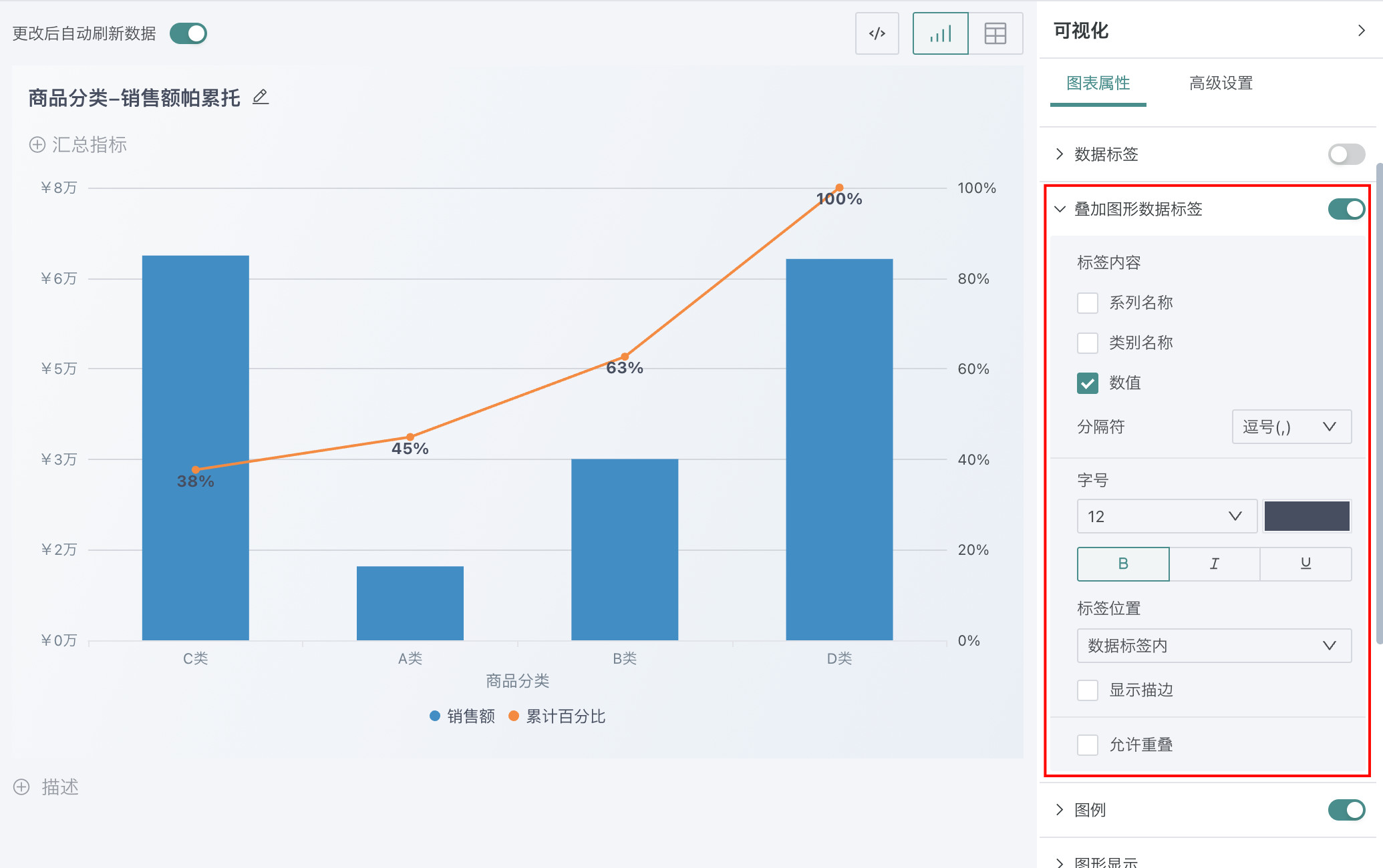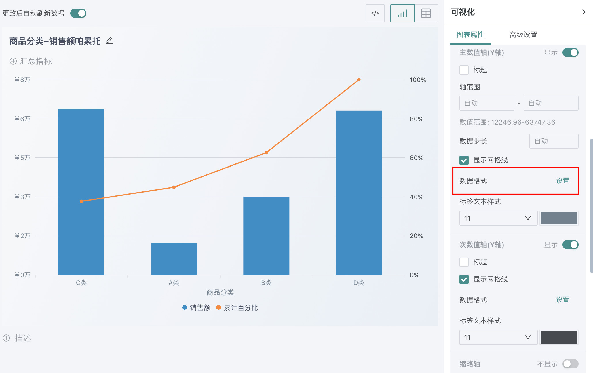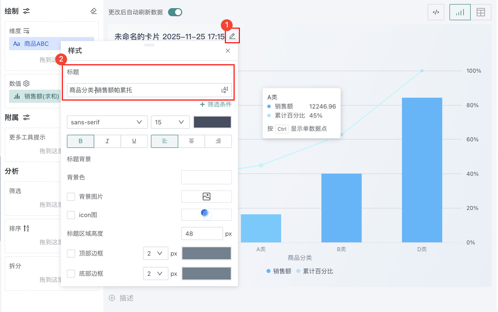 在「可视化」区域中选择「帕累托图」,将左侧「数据集」区域的「商品ABC」拖至「绘制」区域的「维度」,「销售额」拖至「数值」。