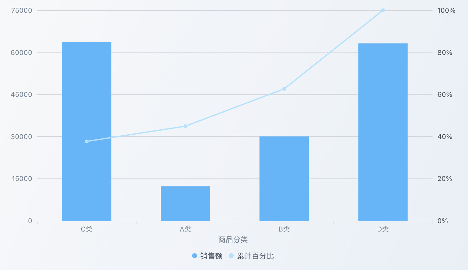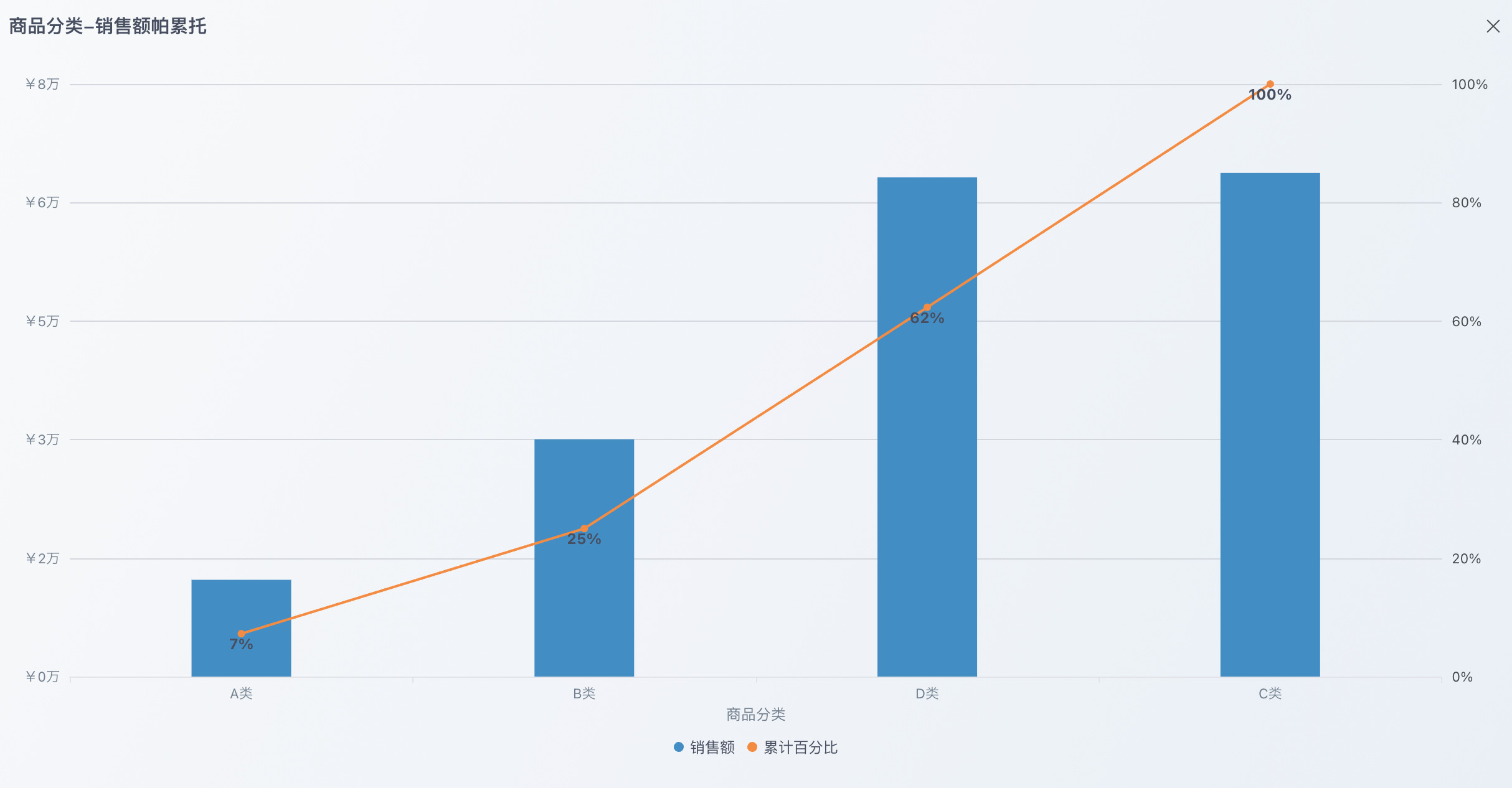 通过商品分类(如A类、B类、C类、D类商品)与销售额的组合分析,直观识别出贡献80%销售额的核心商品类别,帮助企业聚焦于高价值产品,优化库存和营销策略。