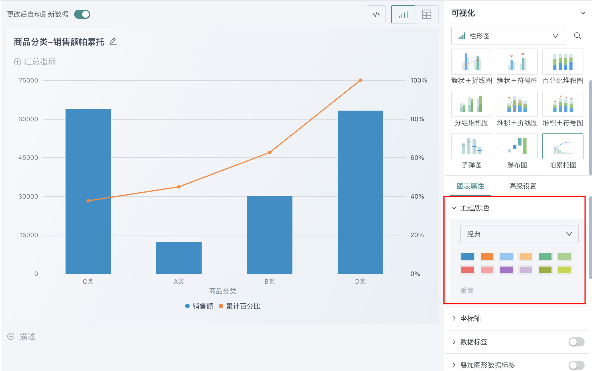 在「图表属性」区域的「主题/颜色」中,可以根据需求和偏好选择颜色。