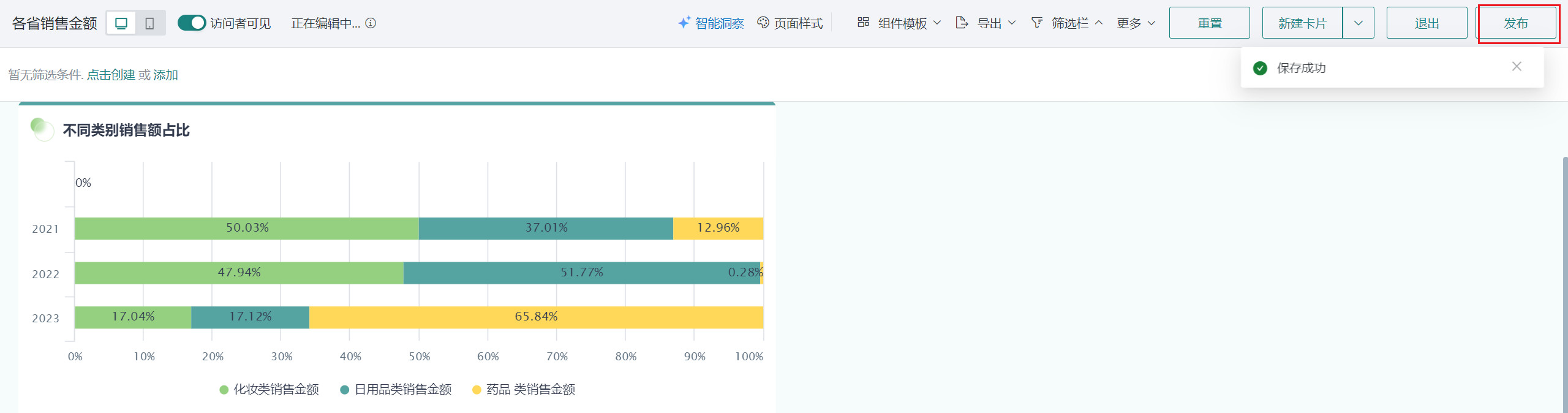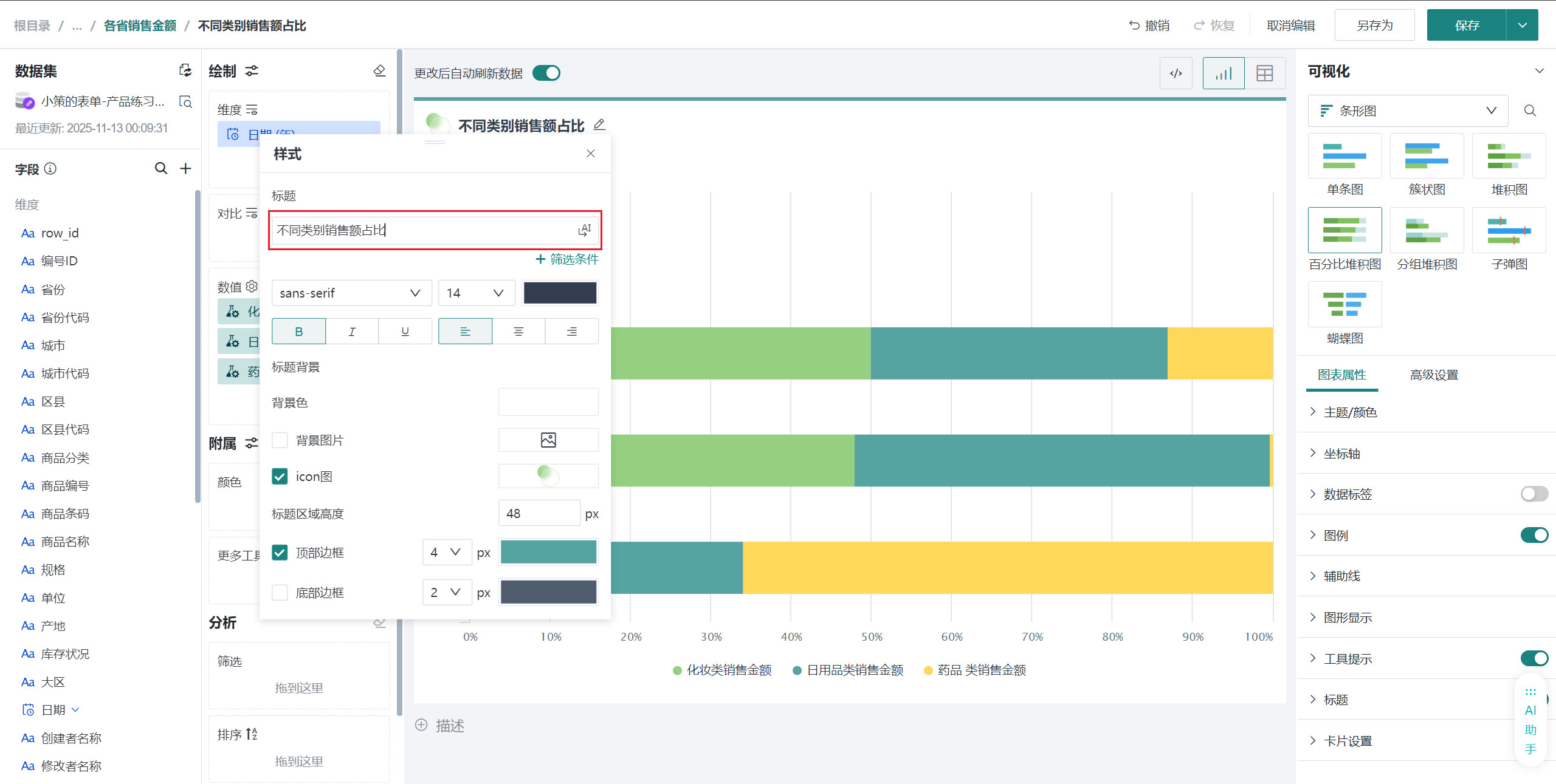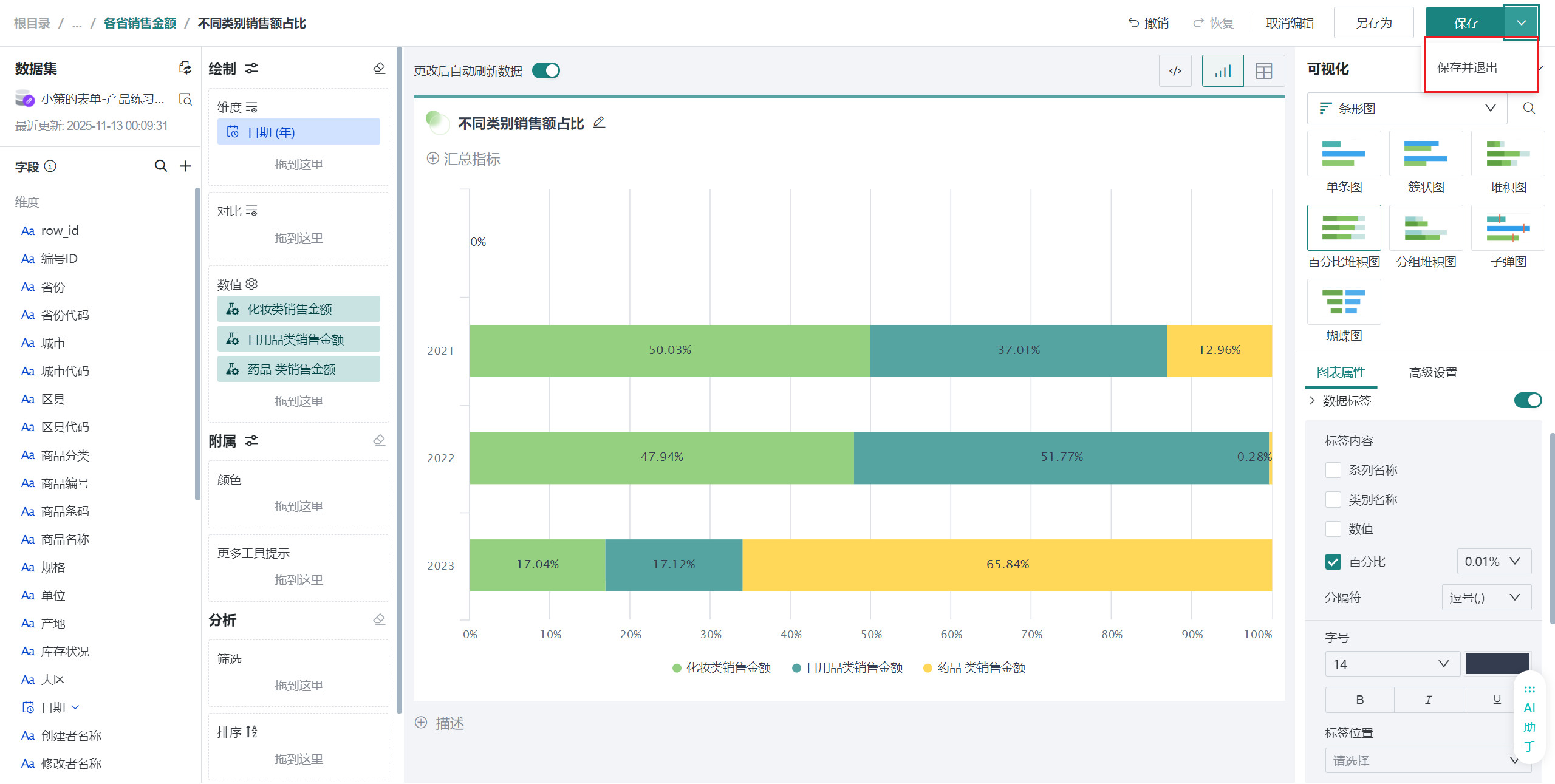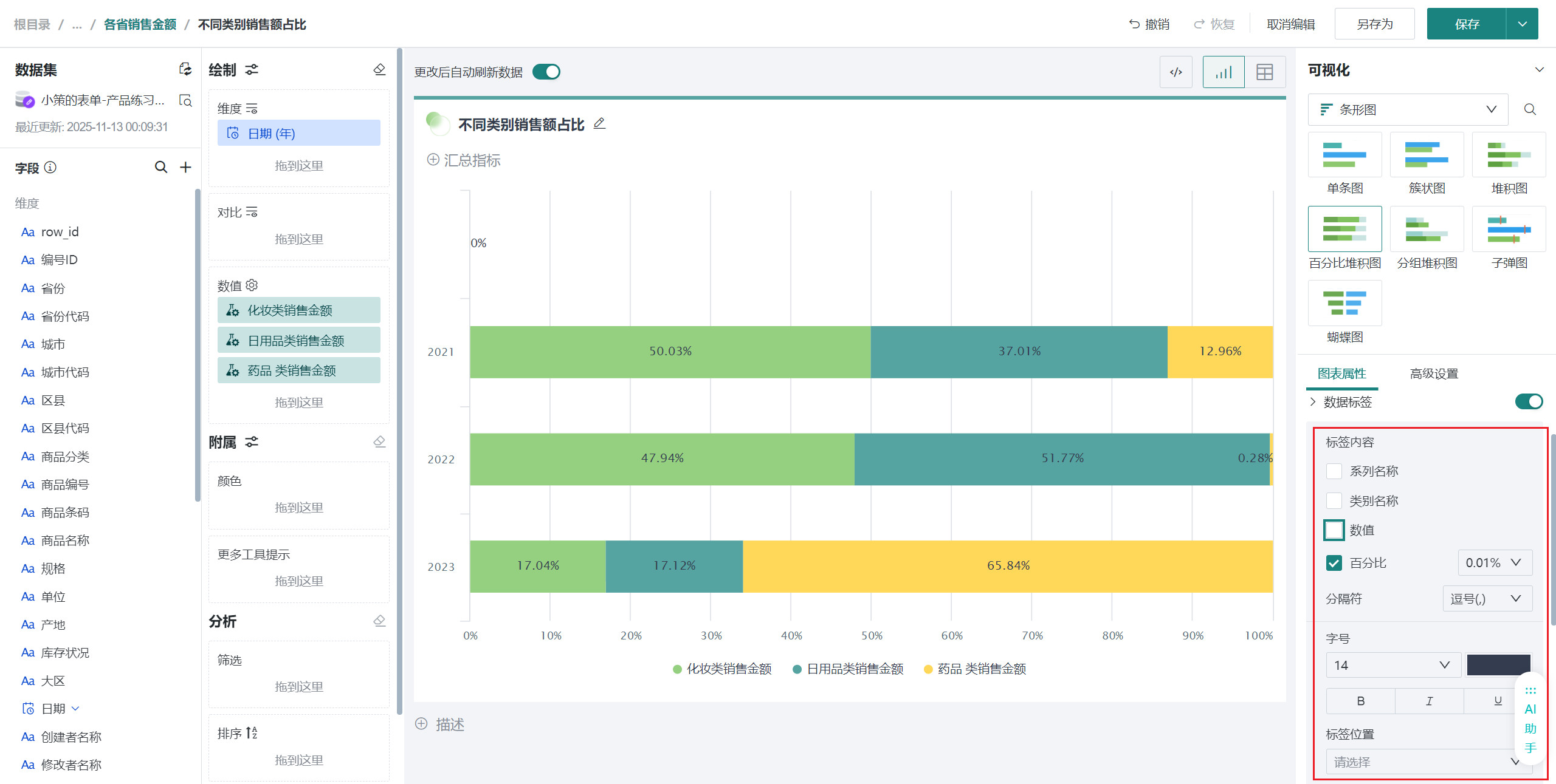 在「图表属性」区域打开「数据标签」按钮,选中「百分比」,即可看到每根柱子显示不同分类对应的销售金额数值的百分比,也可以选中「数值」等。