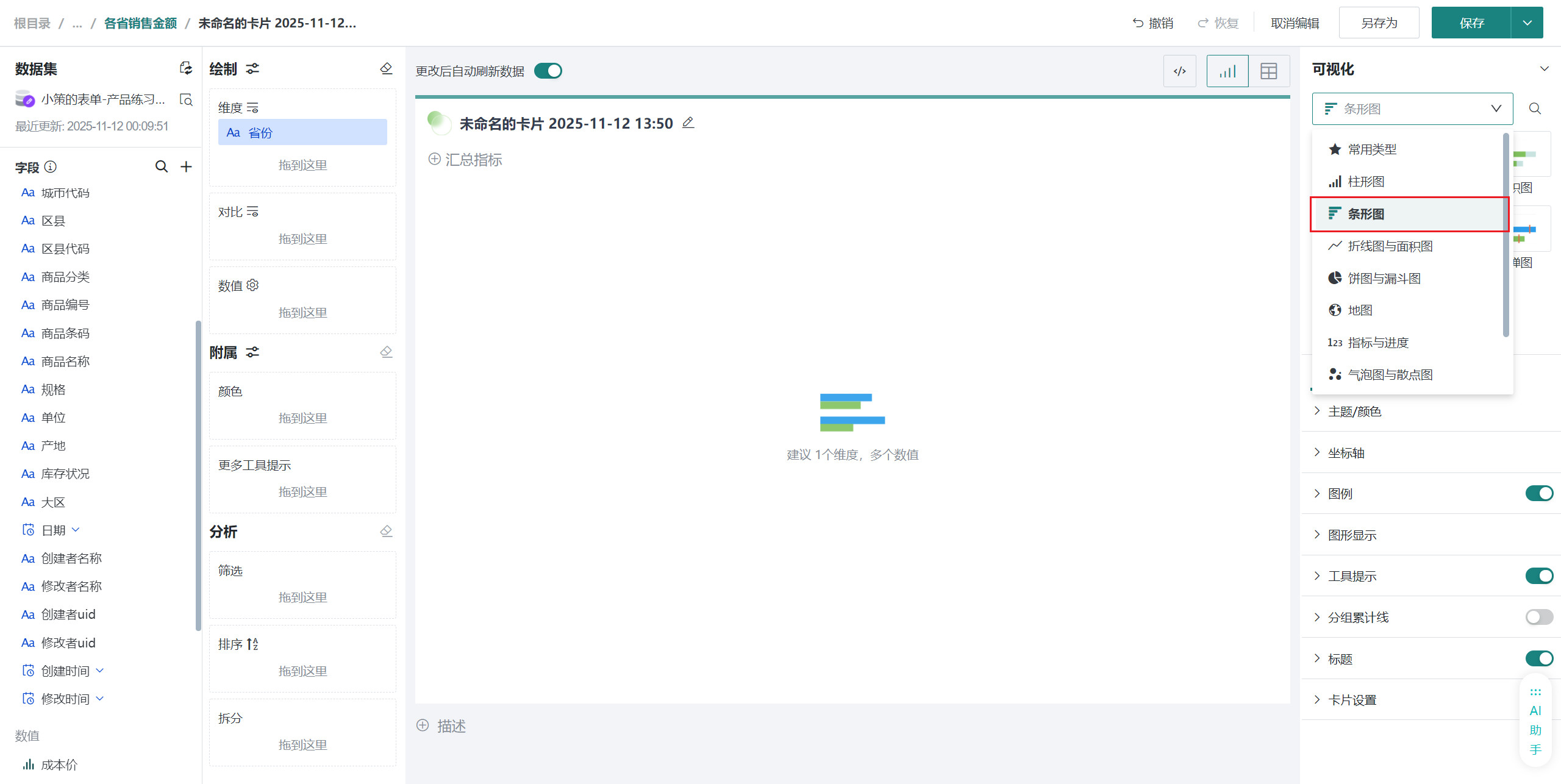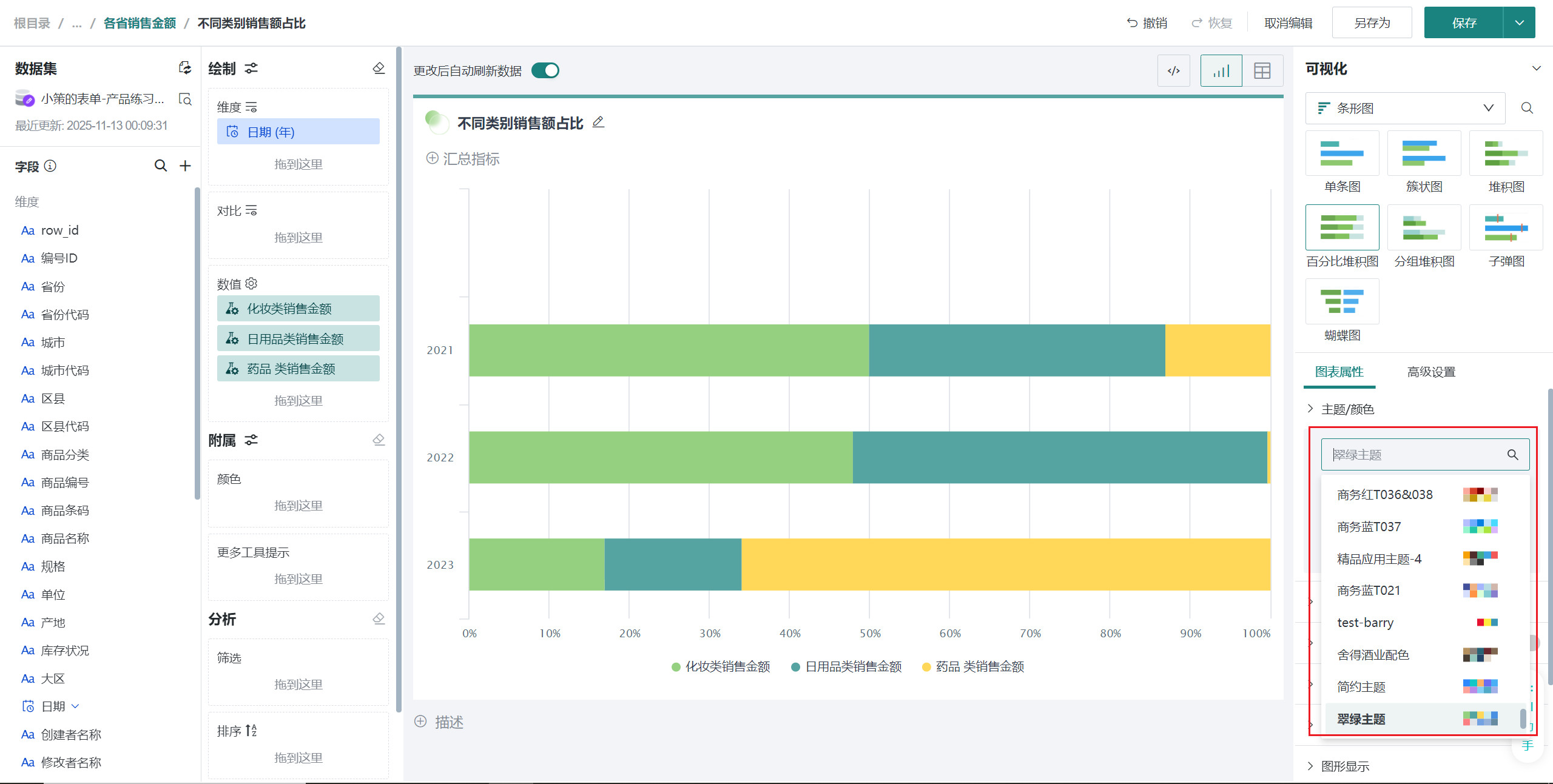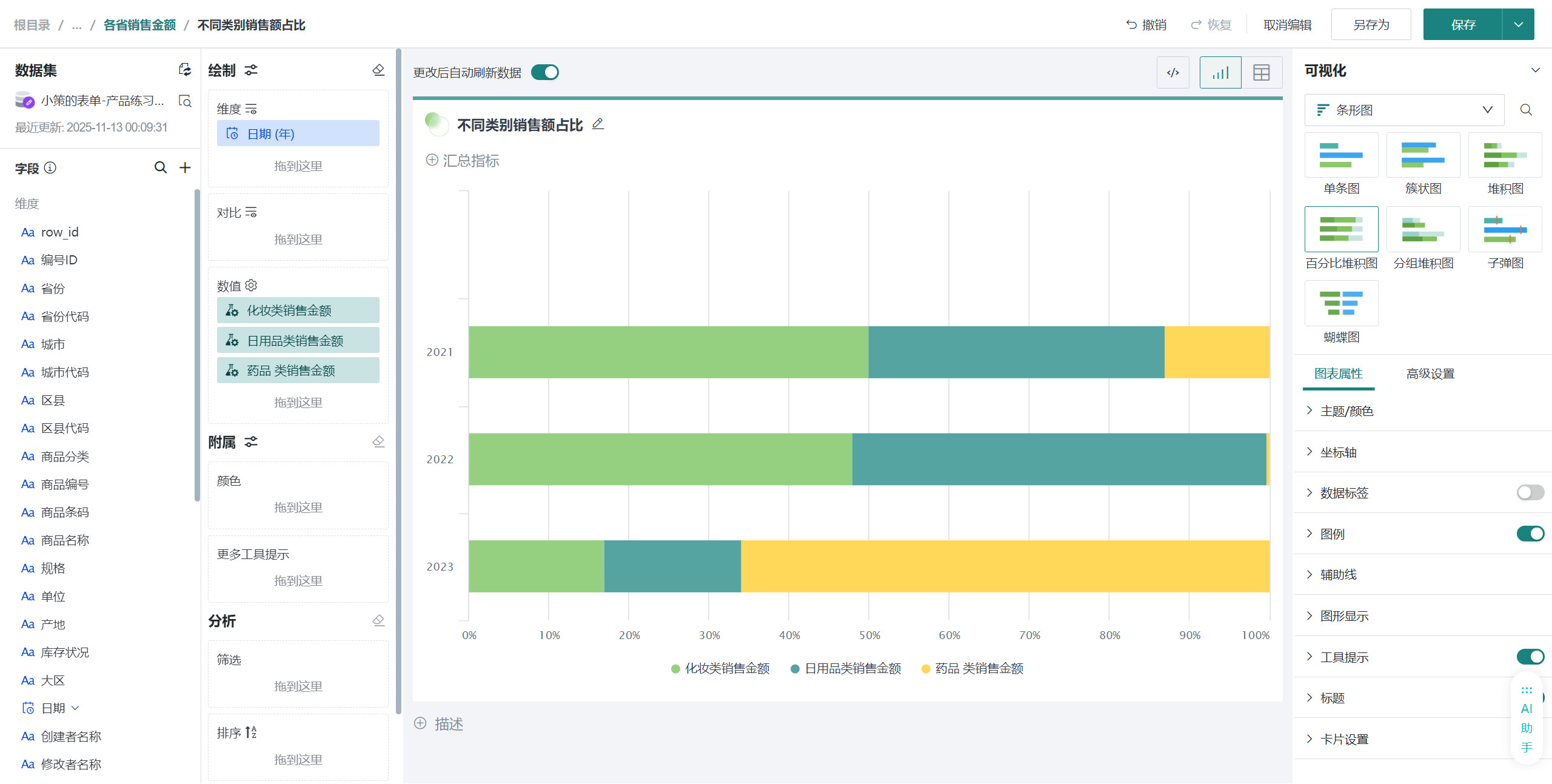 将左侧「数据集」区域的「日期(年)」拖至「绘制」区域的「维度」。 将我们需要的「化妆类销售金额」、「药品类销售金额」、「日用品类销售金额」拖至「绘制」区域的「数值」。