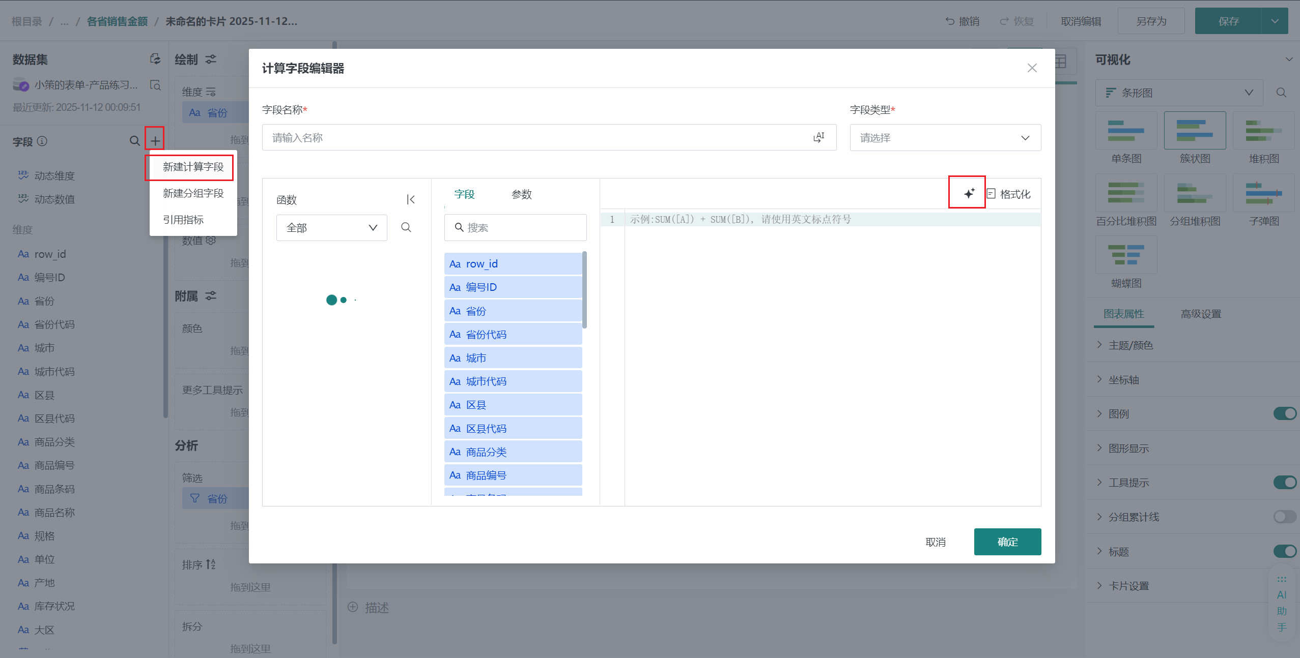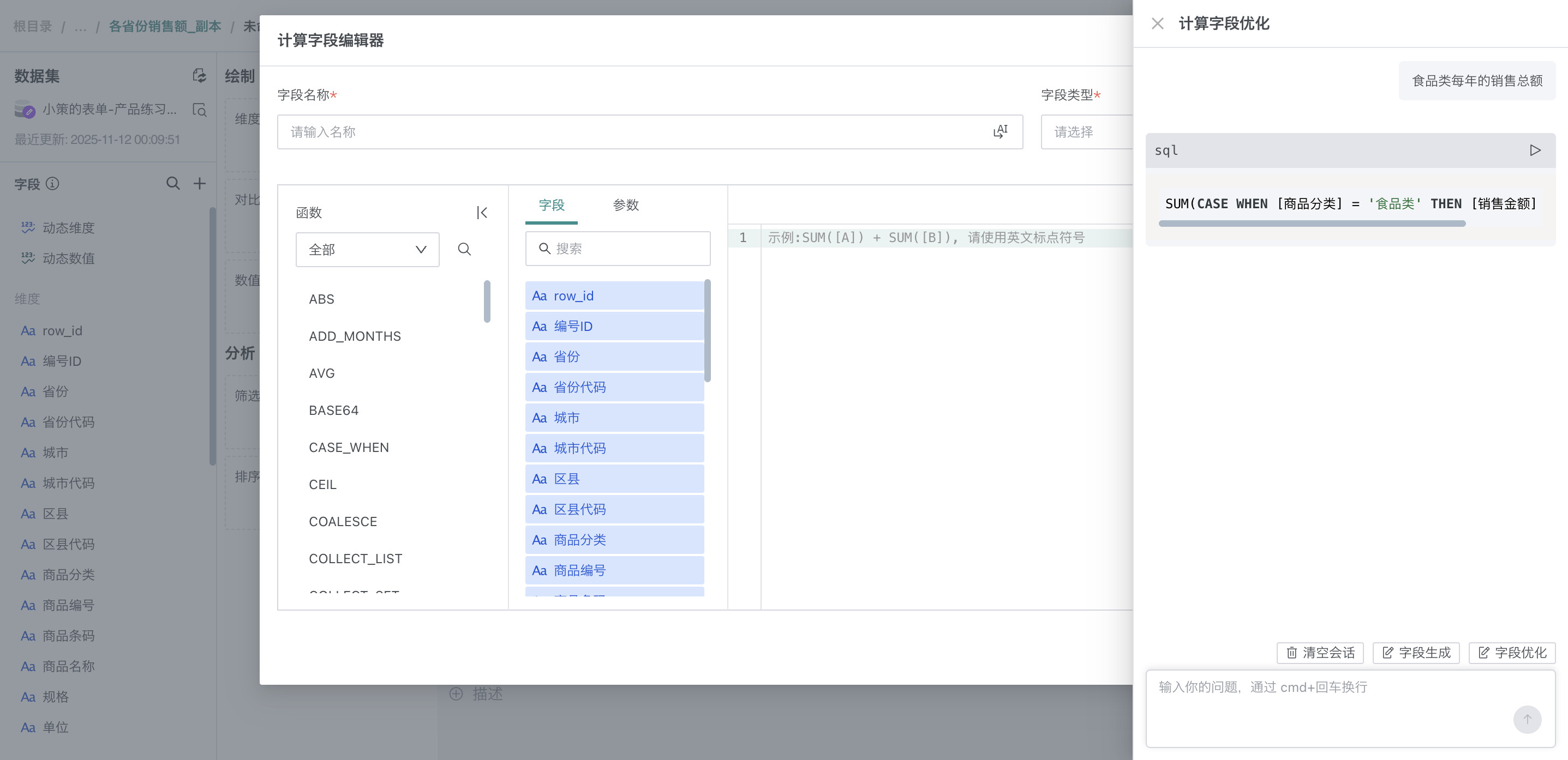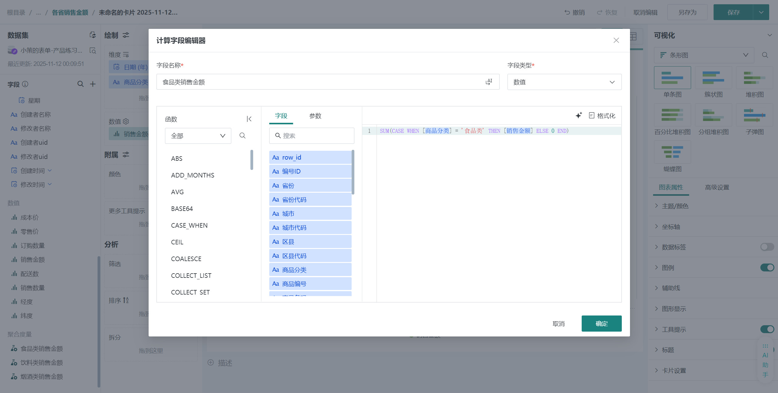 点击字段「+」号,「新建计算字段」。在此情境中我们需要21~23年每年不同种类的销售金额进行比较,所以需要新建三个字段来表示化妆类、日用品类、药品类销售金额。