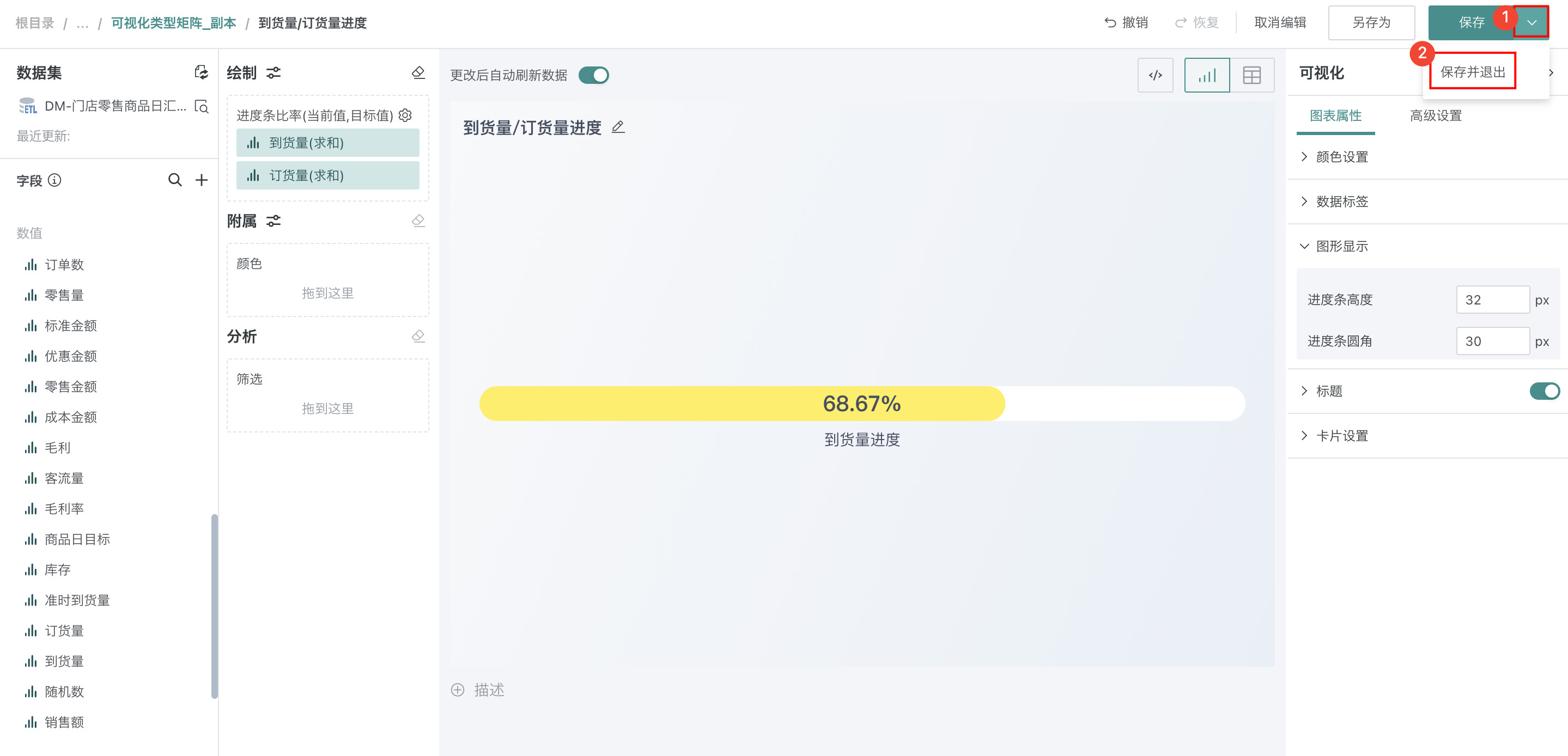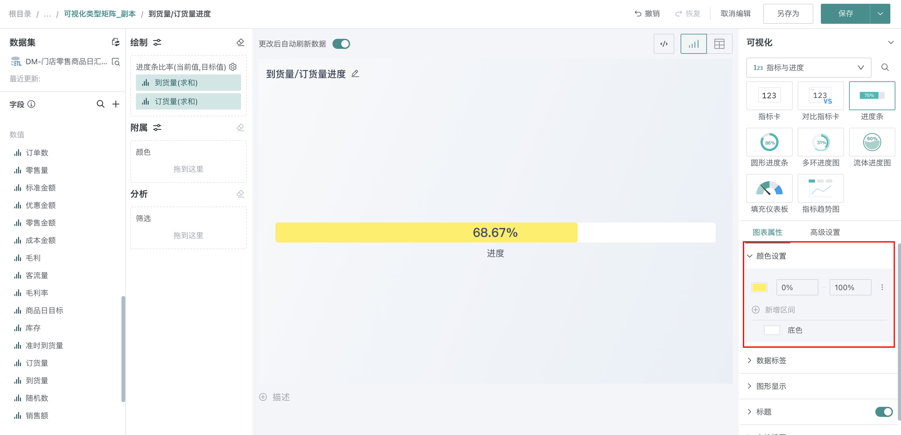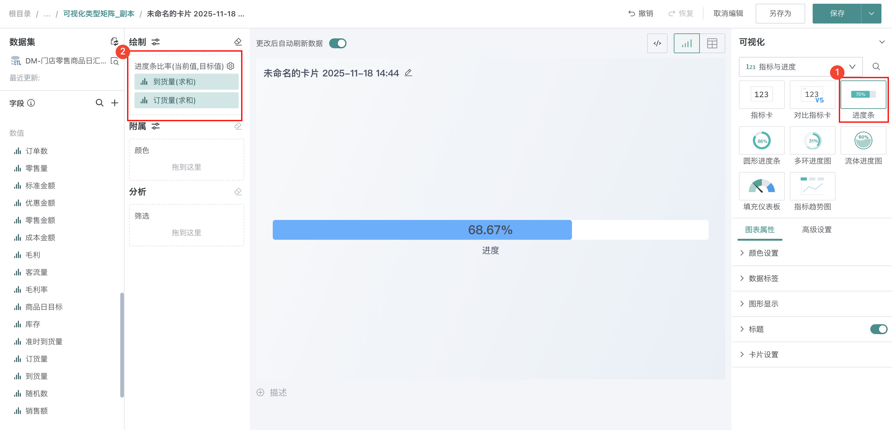 在「可视化」区域中选择「进度条」,将左侧「数据集」区域的「到货量」和「订货量」拖至「绘制」区域的「数值」。