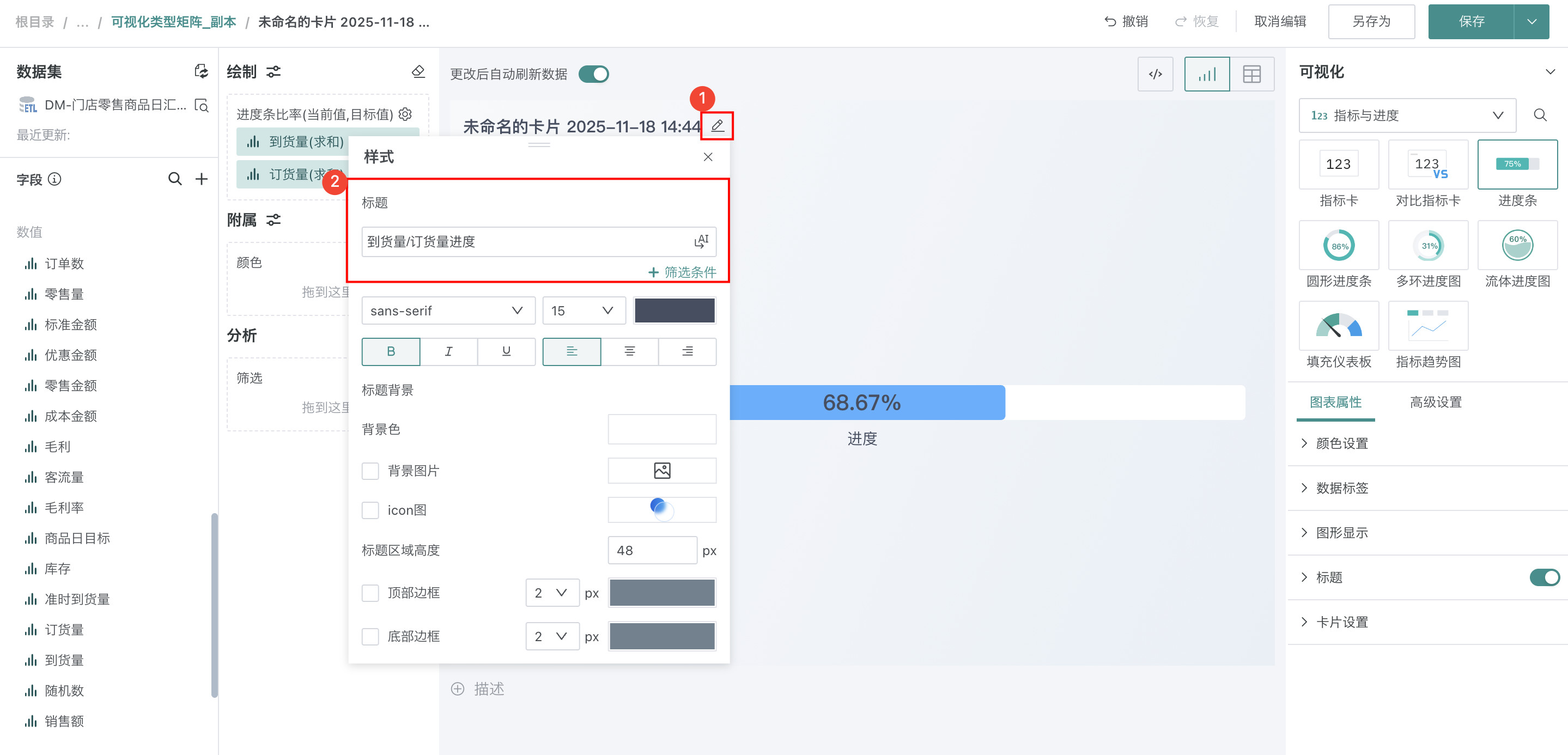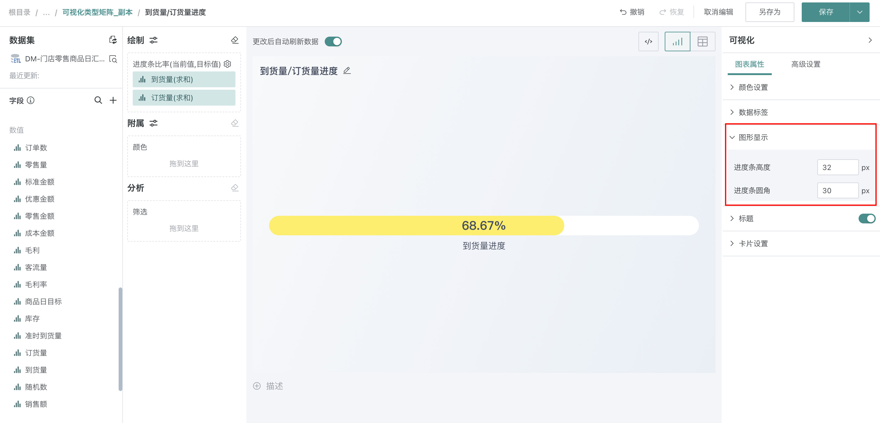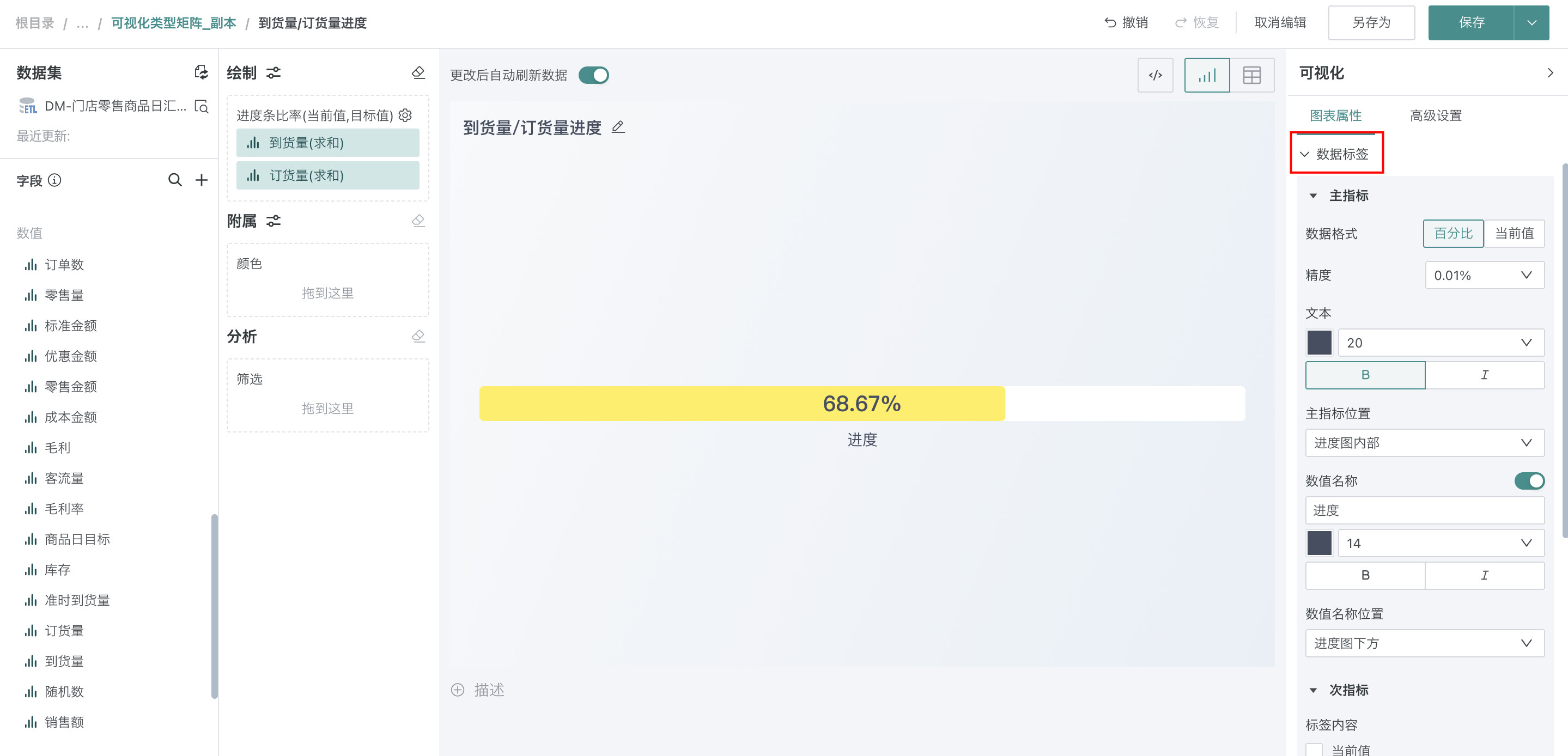 在「可视化」区域中选择「进度条」,将左侧「数据集」区域的「到货量」和「订货量」拖至「绘制」区域的「数值」。