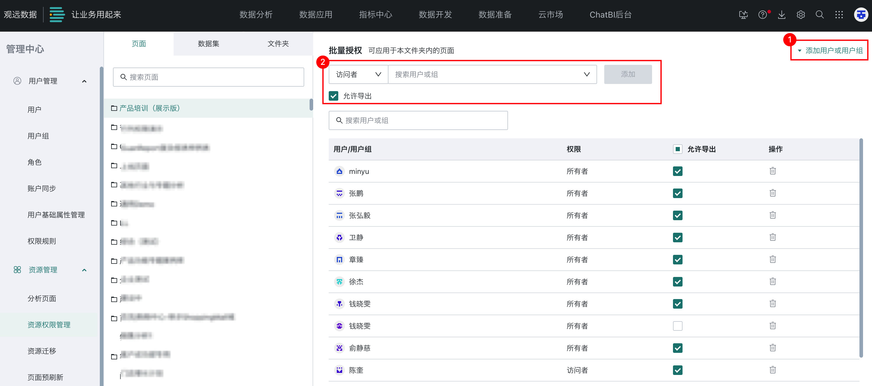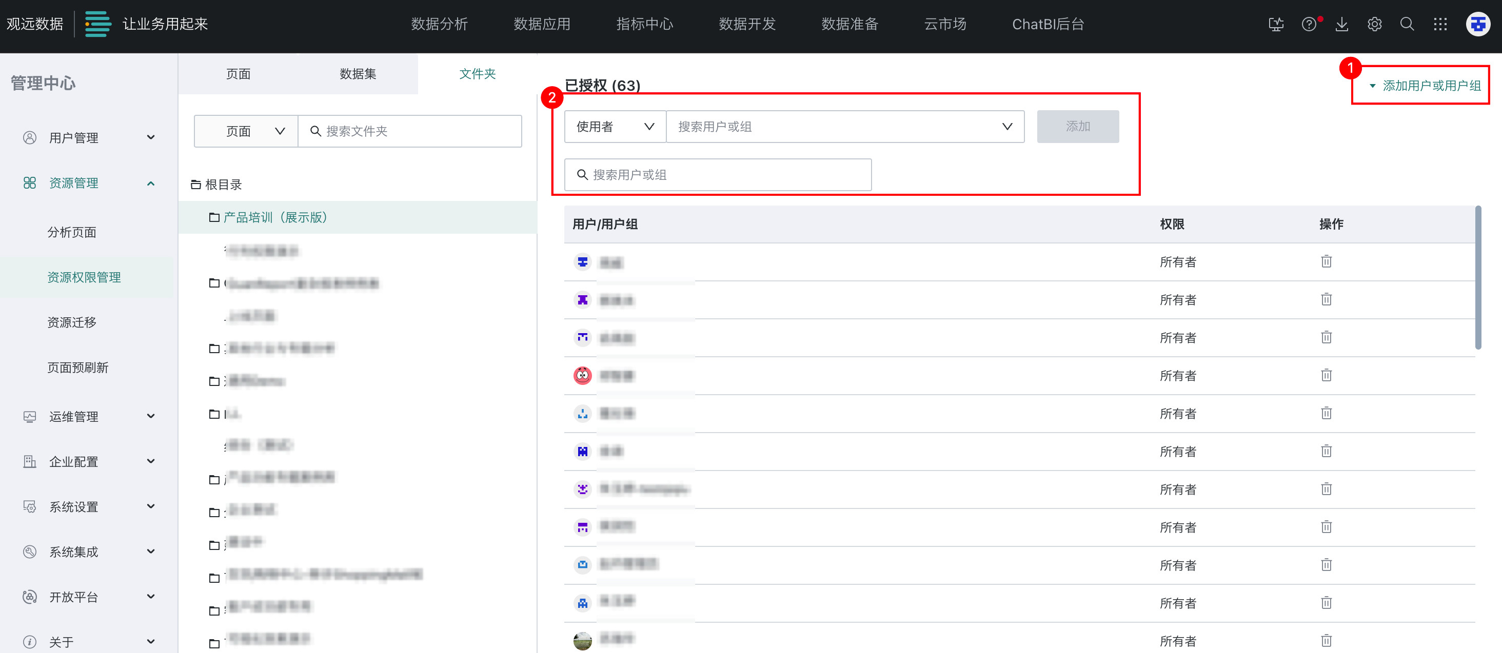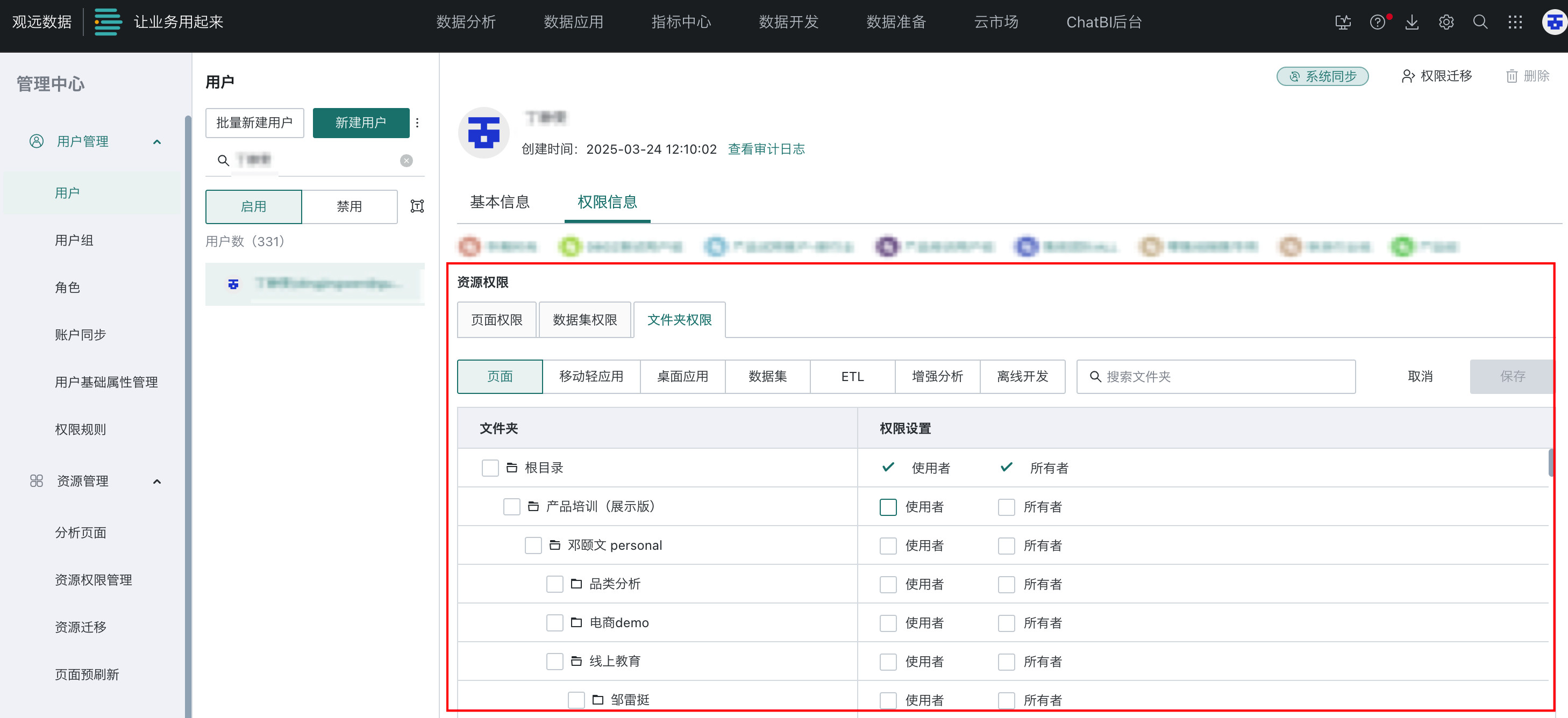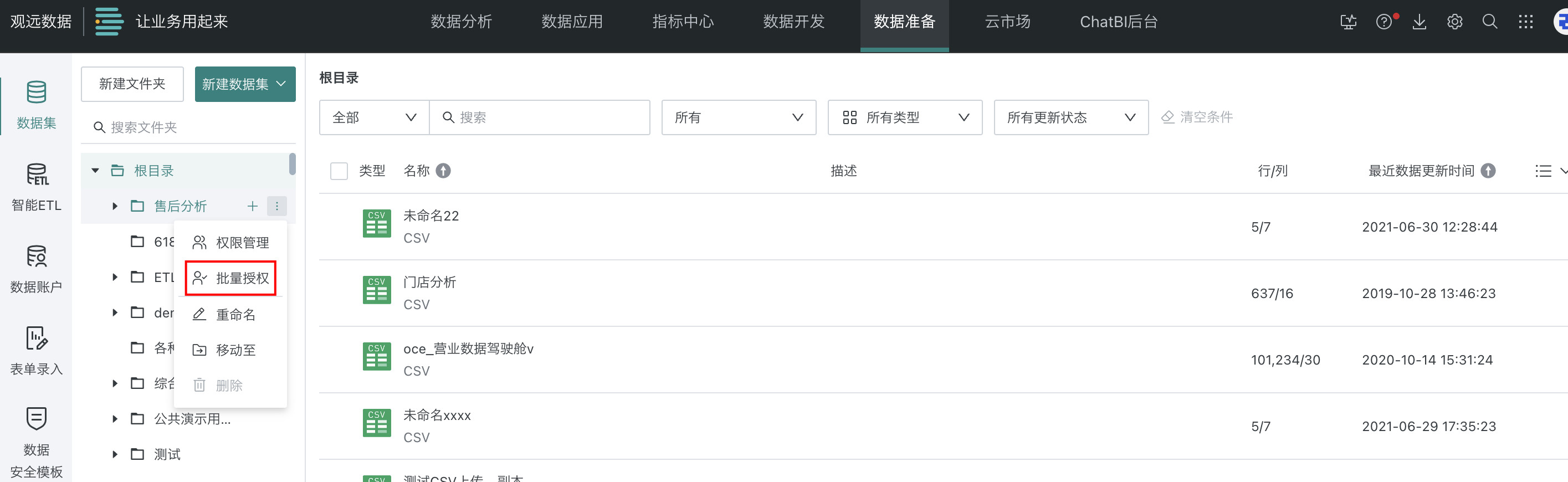 文件夹包含仪表板文件夹、数据集文件夹、ETL 文件夹、桌面应用文件夹等多种分类,可赋予所有者和使用者权限。
