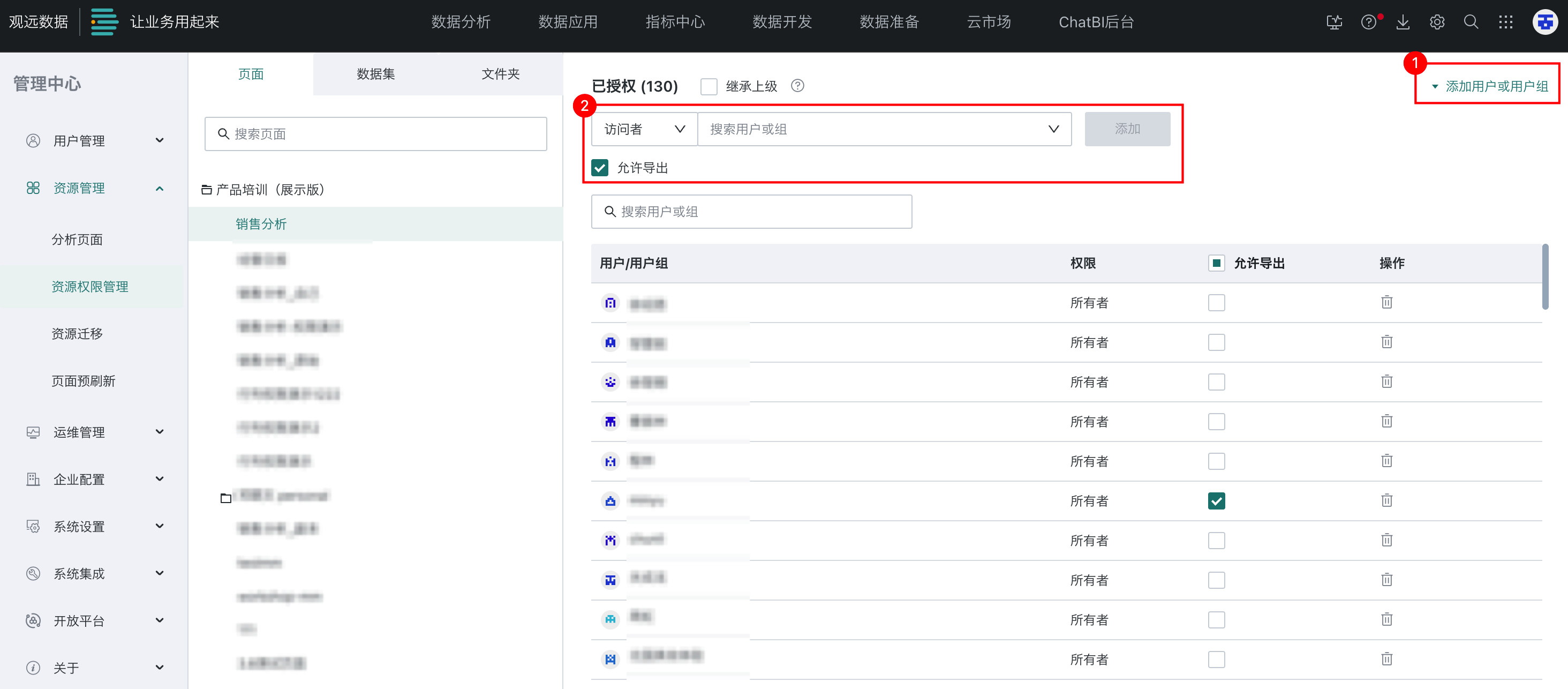 | 通过资源权限管理页面授权获取 | 在「资源权限管理」页面,找到需要授权的数据集,为该数据集添加所有者/使用者![]() | 管理员 | / |