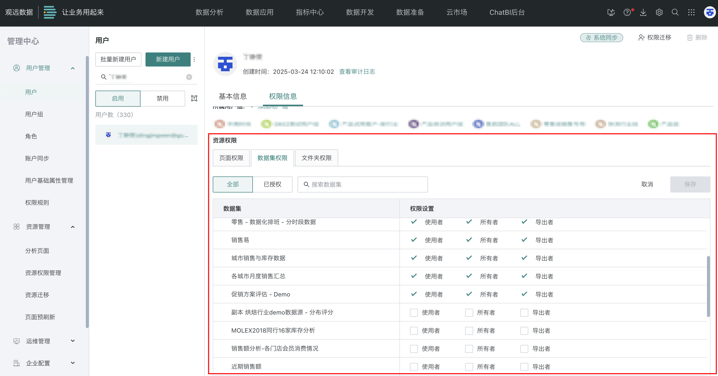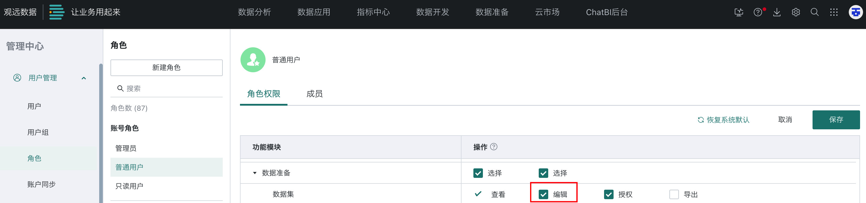 A:需要查看下普通用户角色设置的具体权限是否有数据集的编辑权限,入口:管理中心 > 用户管理 > 角色 > 普通用户 > 角色权限 > 数据集。