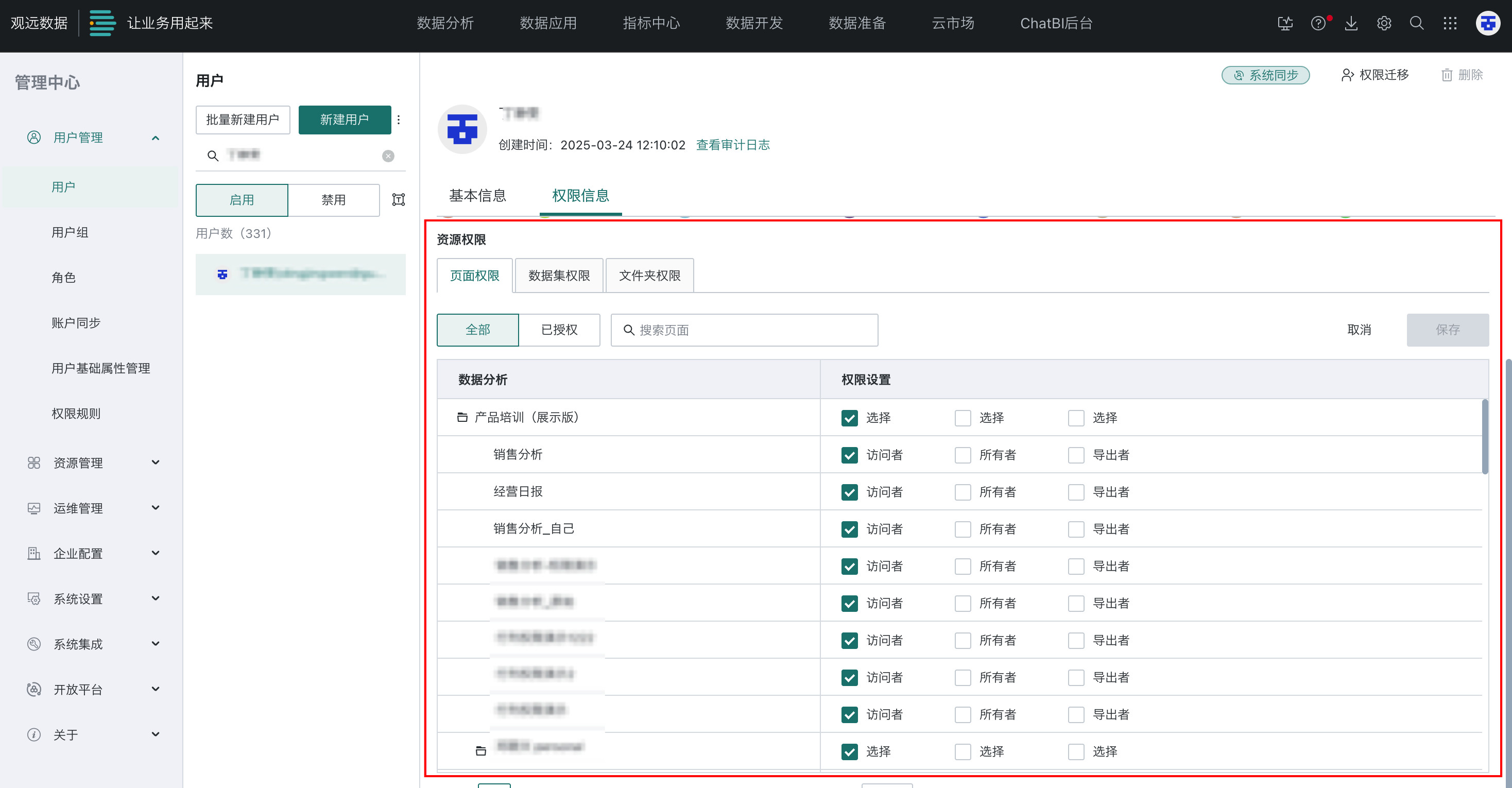 | 通过用户配置获取 | 在用户详情页的「权限信息 > 资源权限 > 数据集权限」页签,为用户分配数据集权限![]() | 管理员 | / |