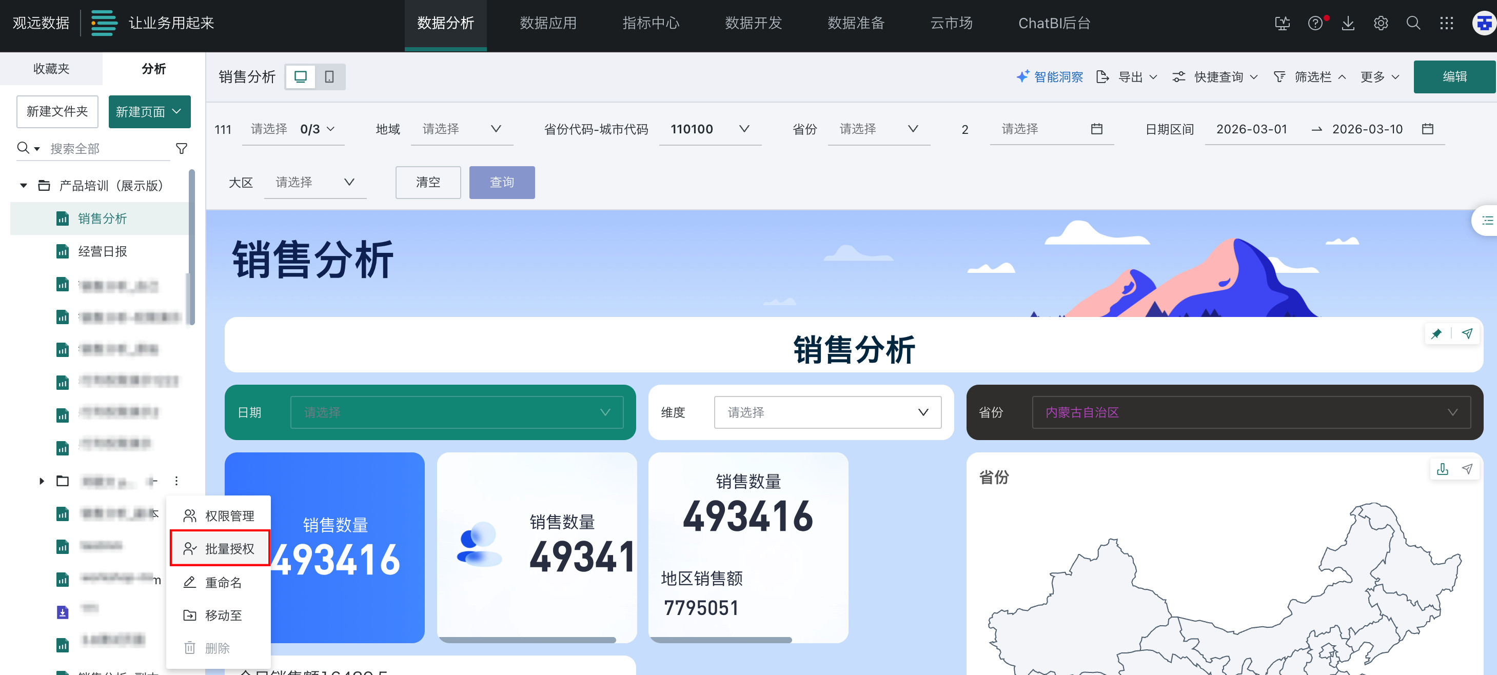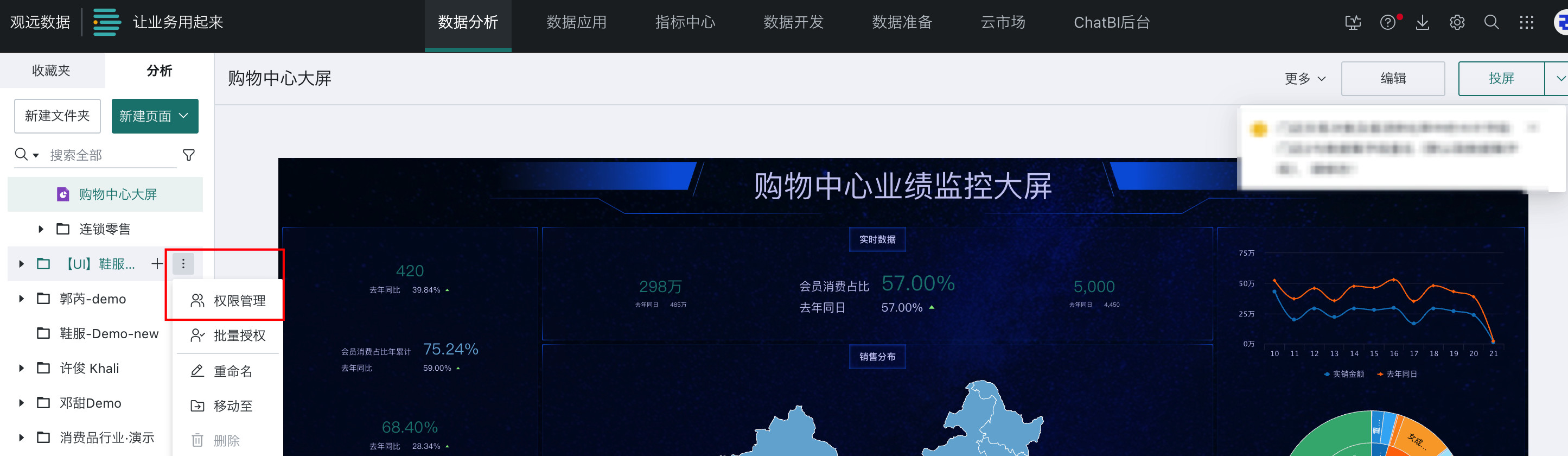 - 管理操作:即对文件夹本身进行操作,包括在新建资源(仪表板、数据集等)、目录管理(在当前文件夹里新建子文件夹)、权限管理、重命名、移动至、删除。