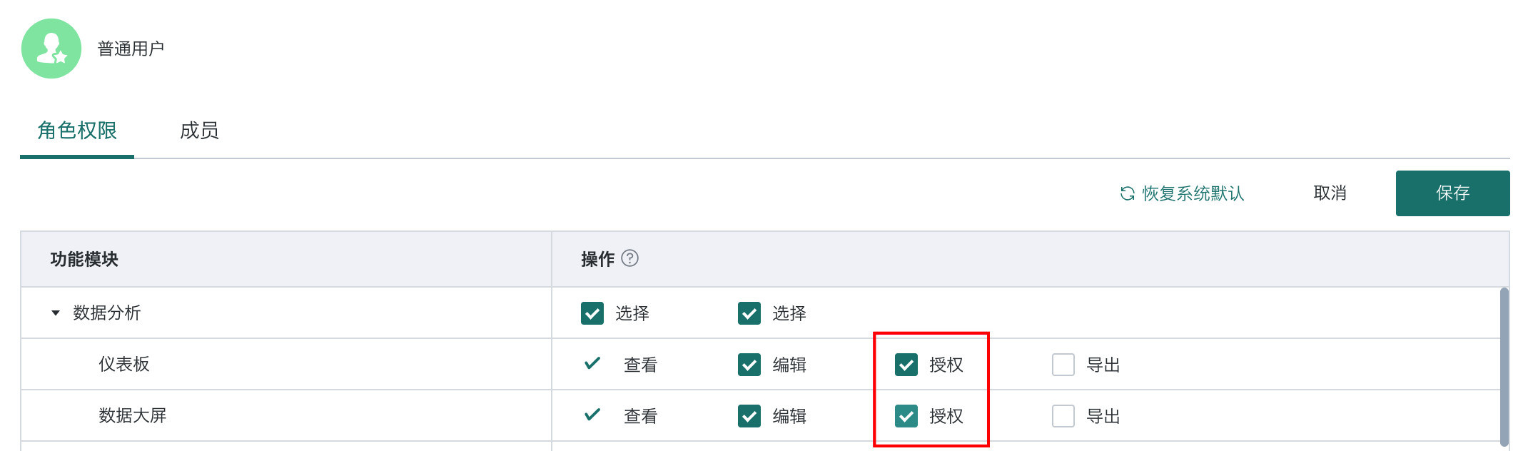 | 导出 | ✅ | ✅(需开启普通用户仪表板导出功能权限) | ✅(需开启普通用户仪表板导出功能权限) |