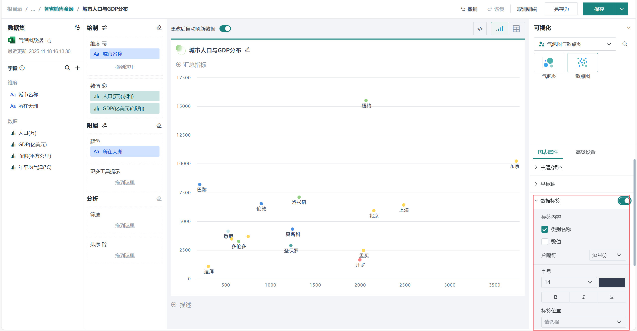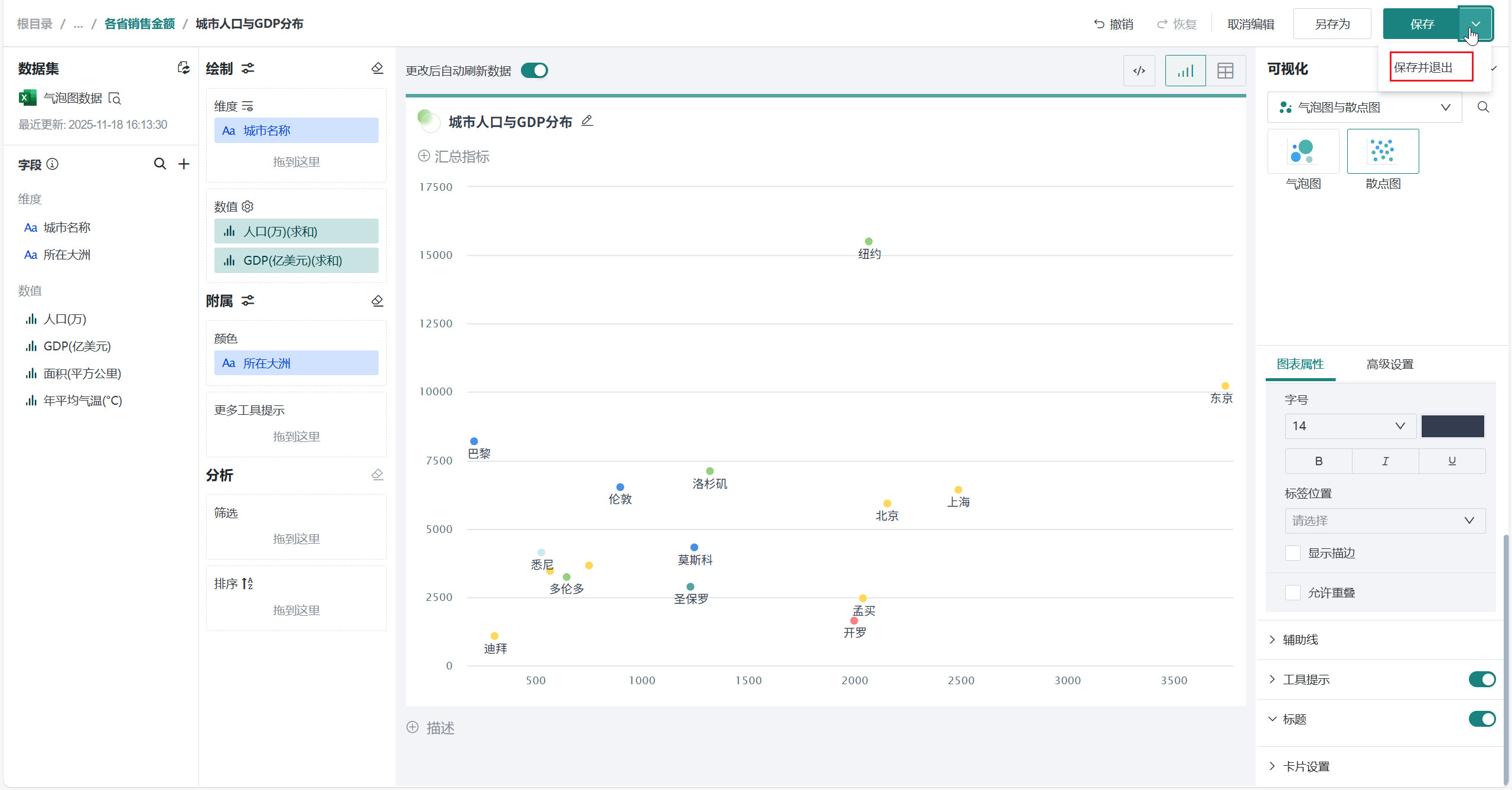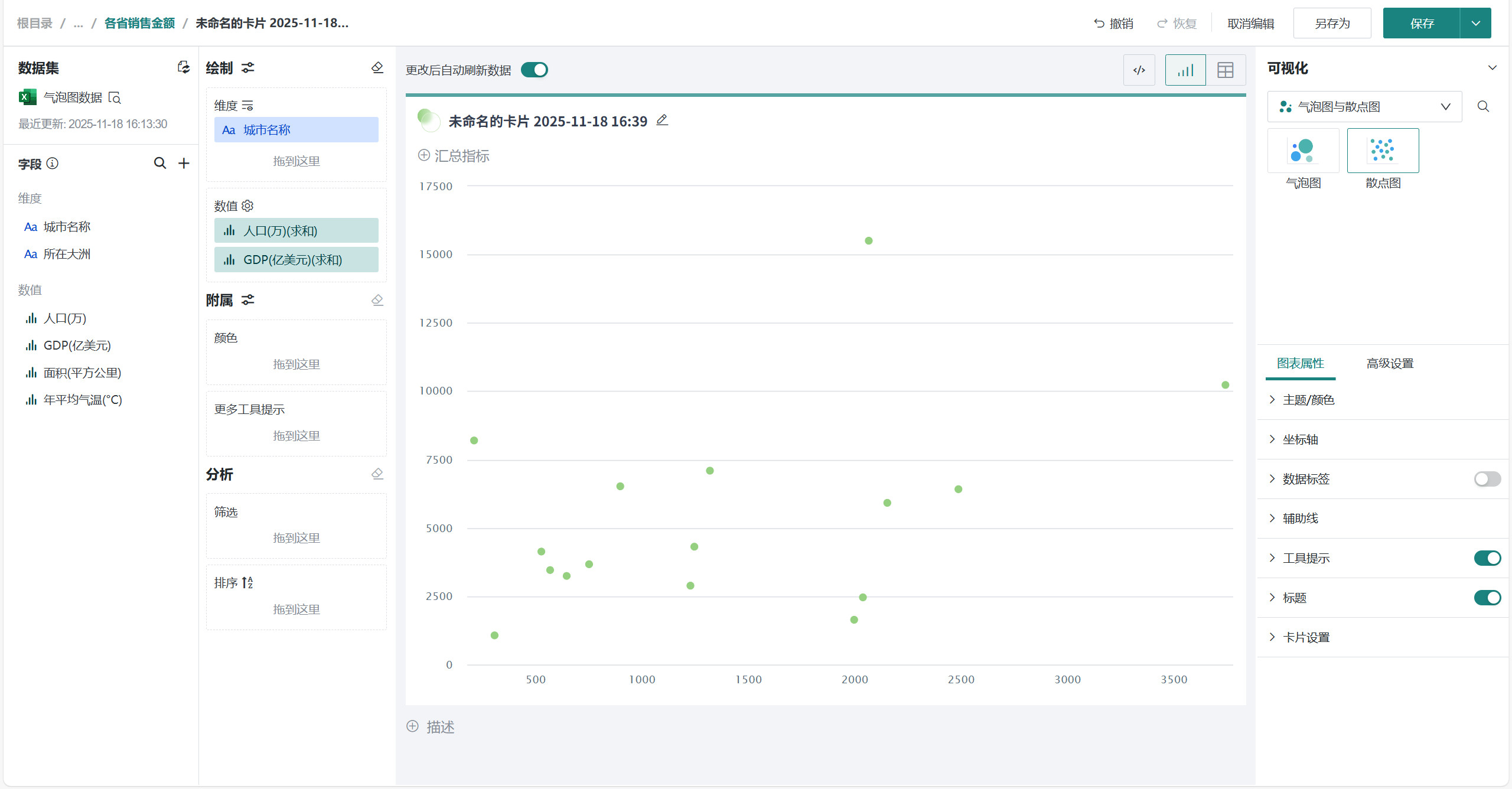 在「可视化」区域中选择「气泡图与散点图」再点击「散点图」,将左侧「字段」区域的「城市名称」拖至「绘制」区域的「维度」,将另两个数值字段(如「人口(万)」和「GDP(亿美元)」)拖至「数值」。