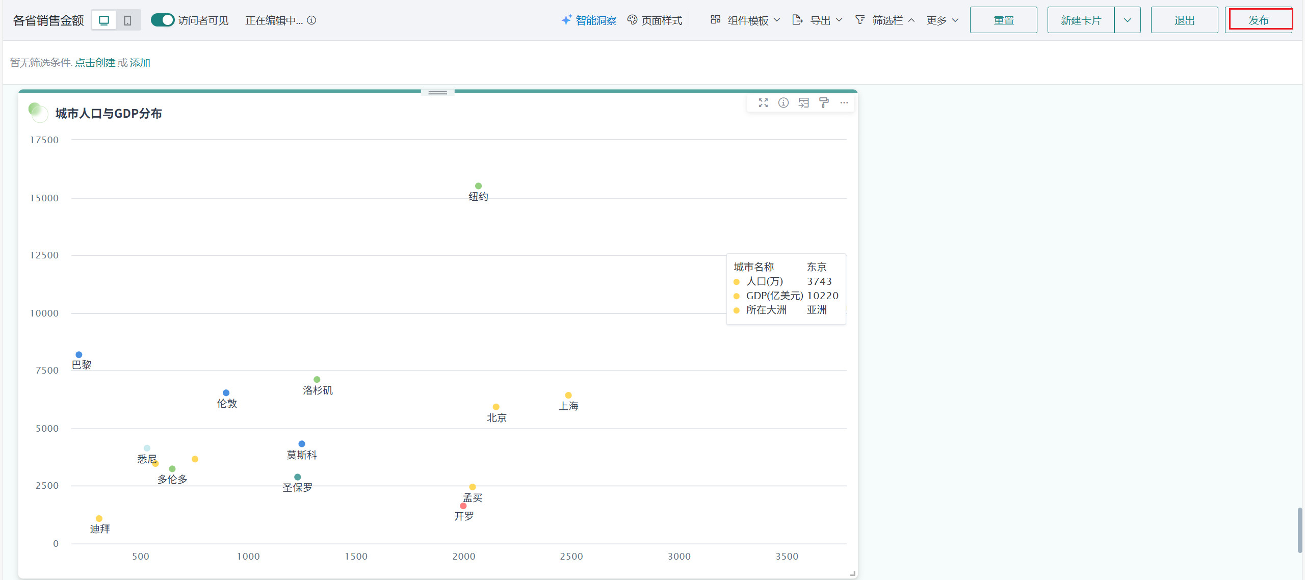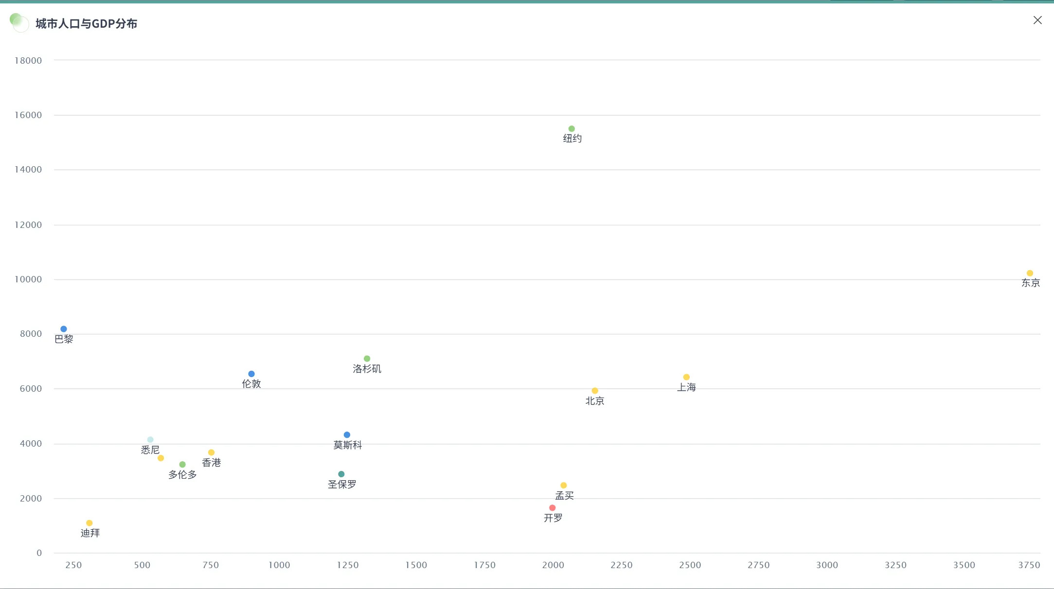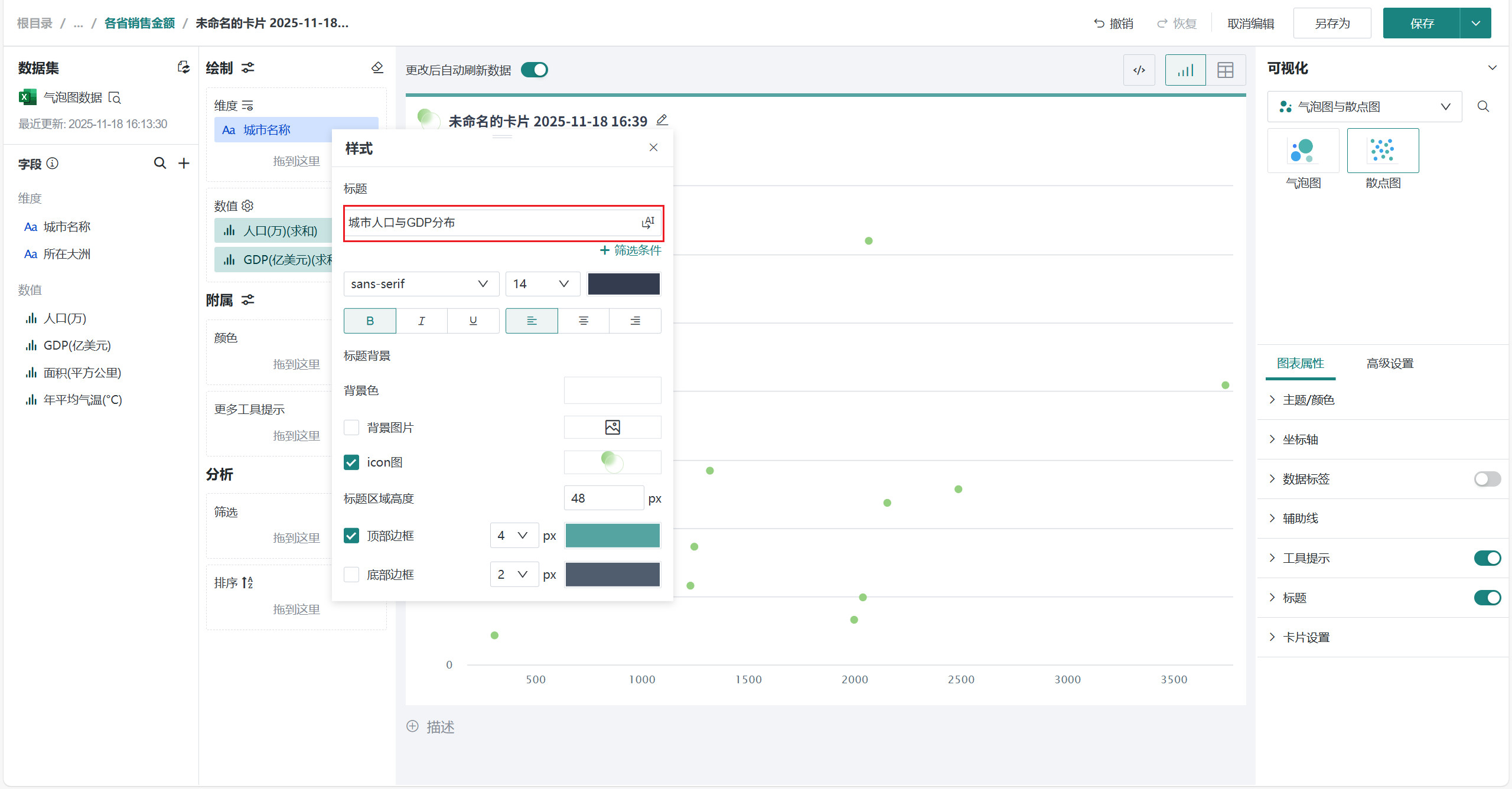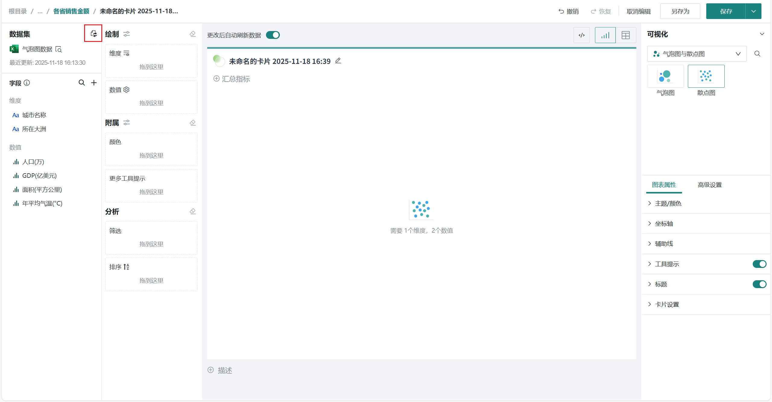 在「可视化」区域中选择「气泡图与散点图」再点击「散点图」,将左侧「字段」区域的「城市名称」拖至「绘制」区域的「维度」,将另两个数值字段(如「人口(万)」和「GDP(亿美元)」)拖至「数值」。