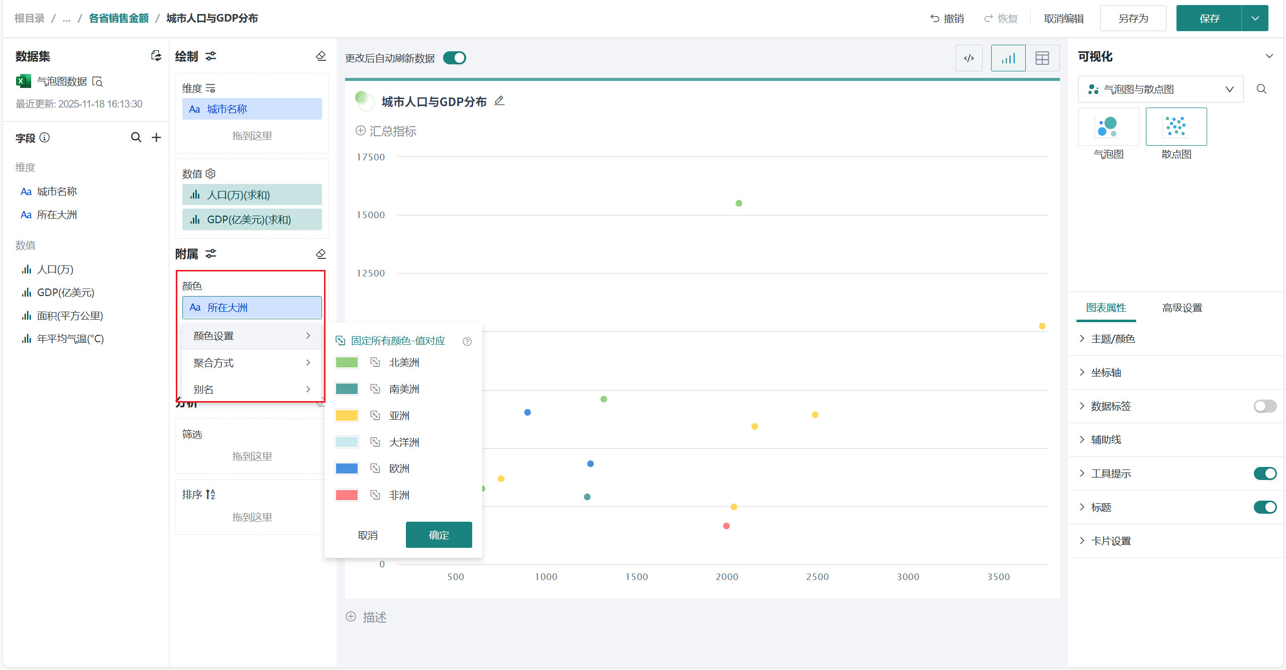 将「所在大洲」字段拖至「颜色」区域,点击字段后选择「颜色设置」,可修改不同大洲对应的颜色,颜色详细配置可参考图表绘制-颜色。