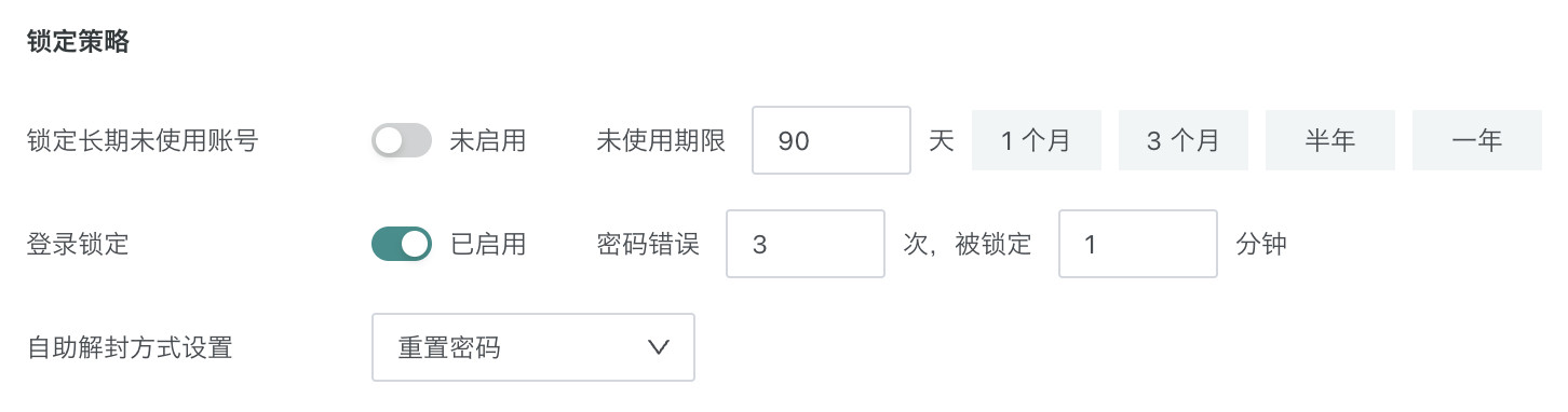 支持设置两种锁定策略,一种是当多次输入错误的账号密码时锁定,另一种是当长期未登录时锁定。