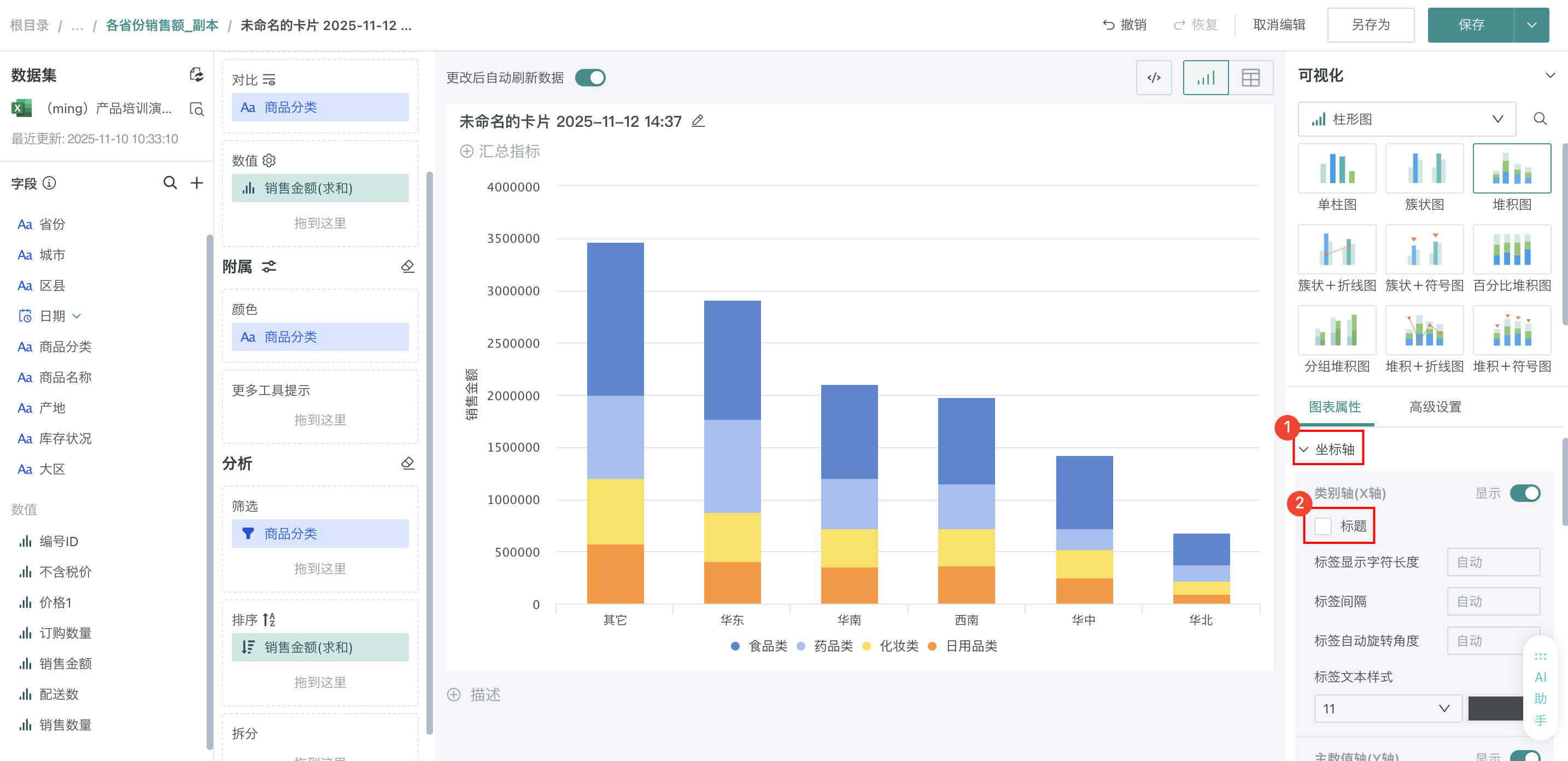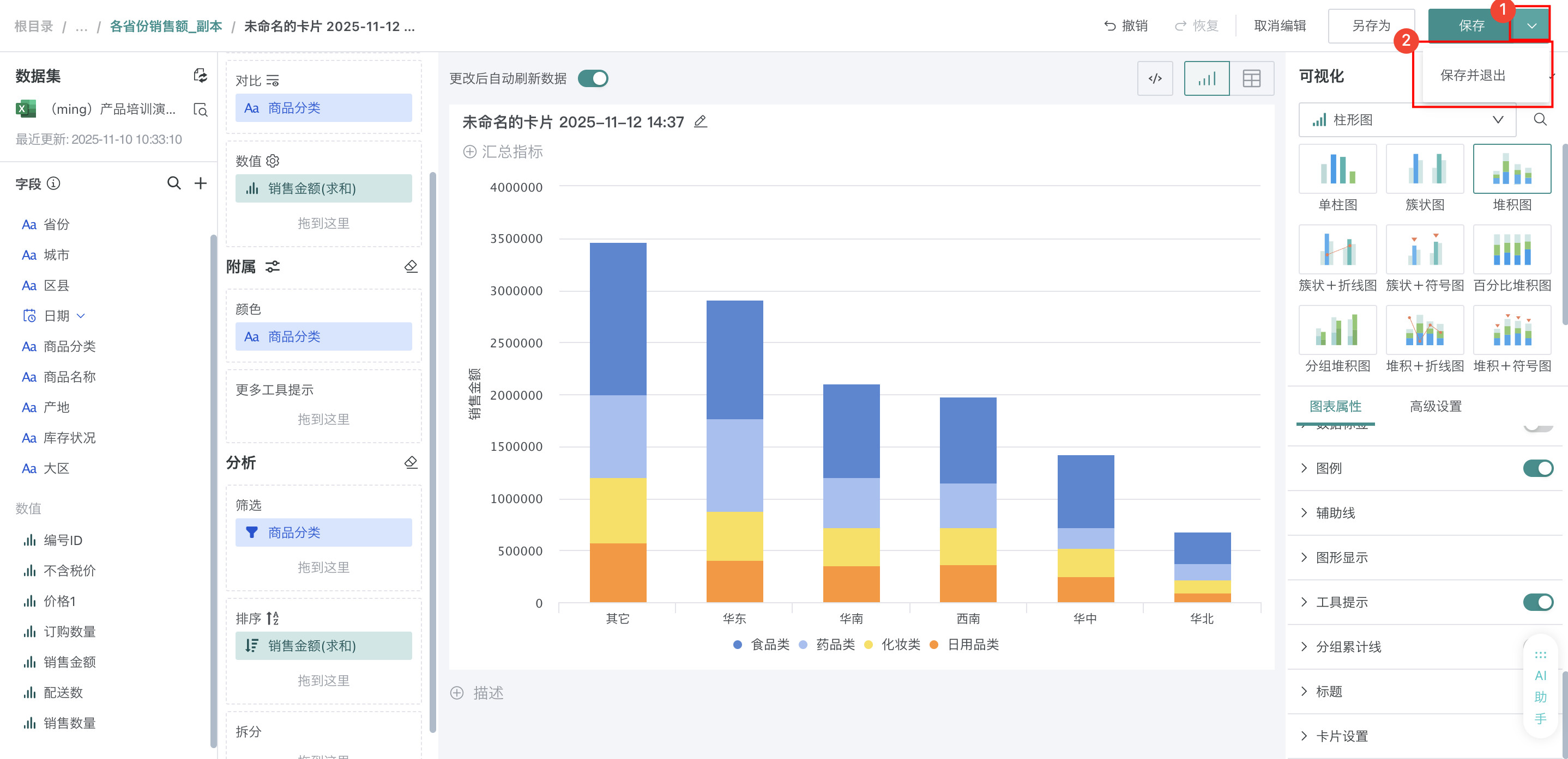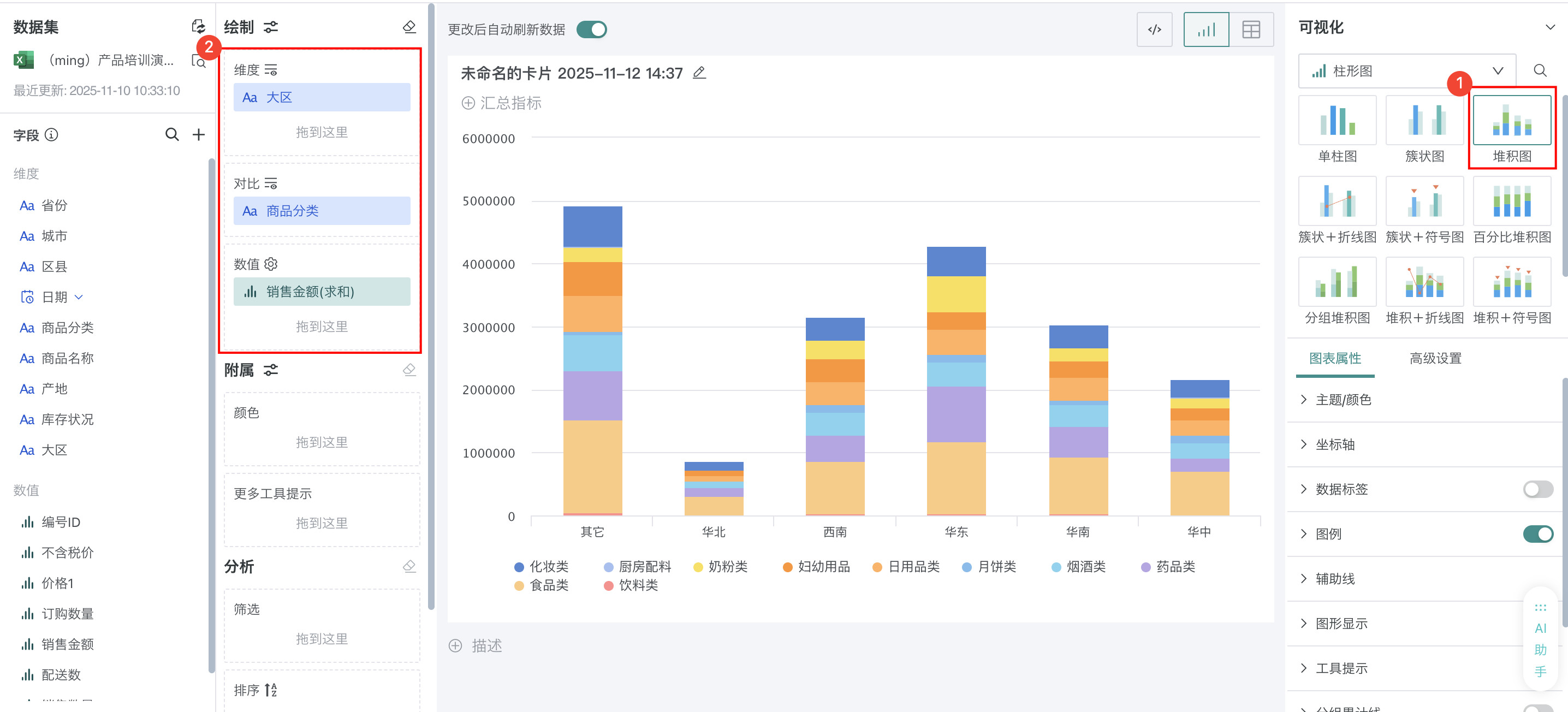 在「可视化」区域中选择「堆积图」,将左侧「数据集」区域的「大区」拖至「绘制」区域的「维度」,「商品分类」拖入「对比」,「销售金额」拖入「数值」。