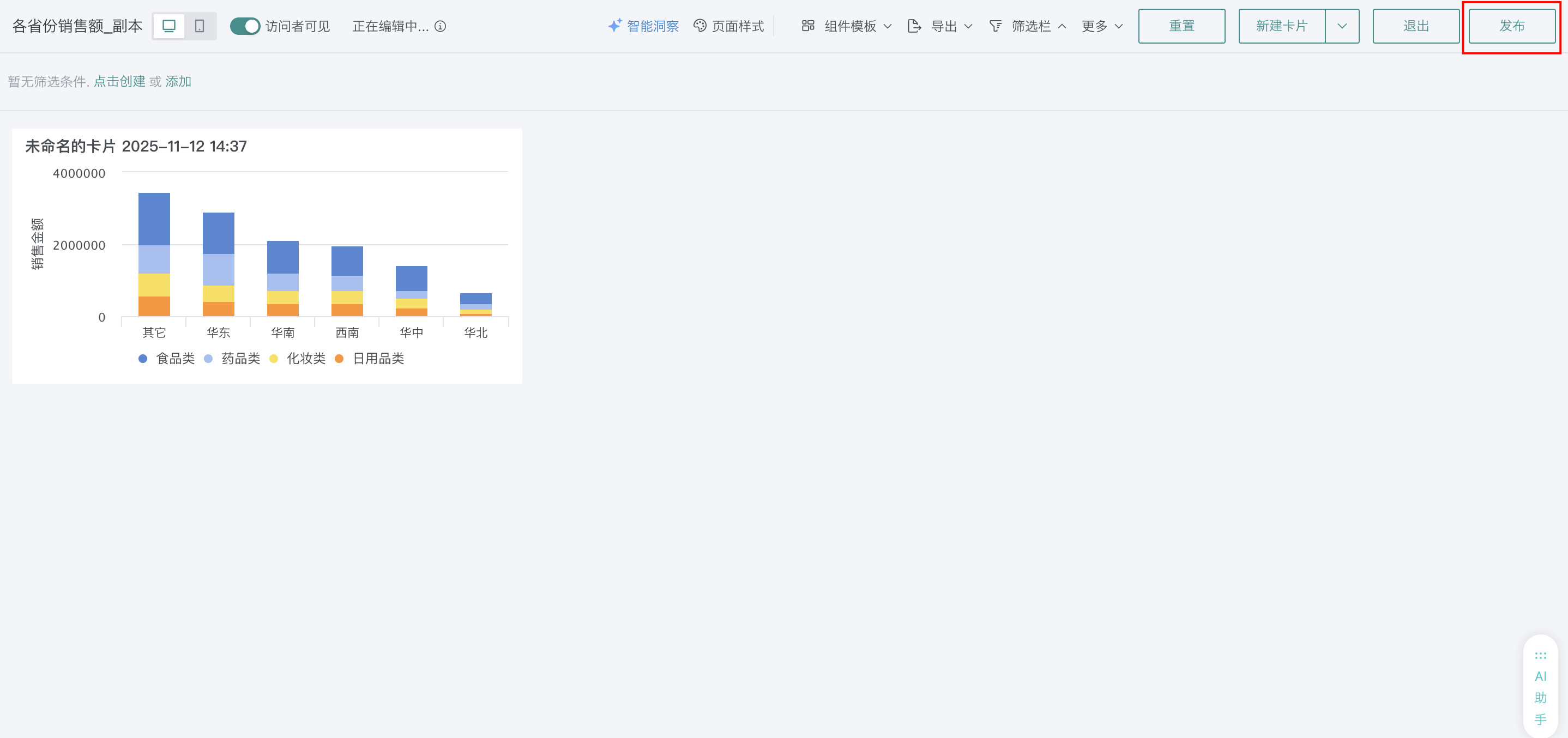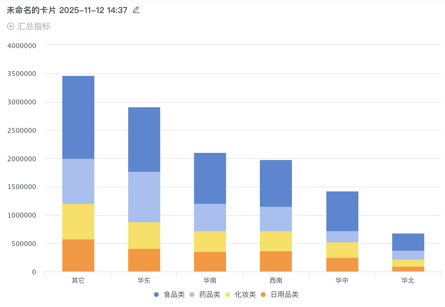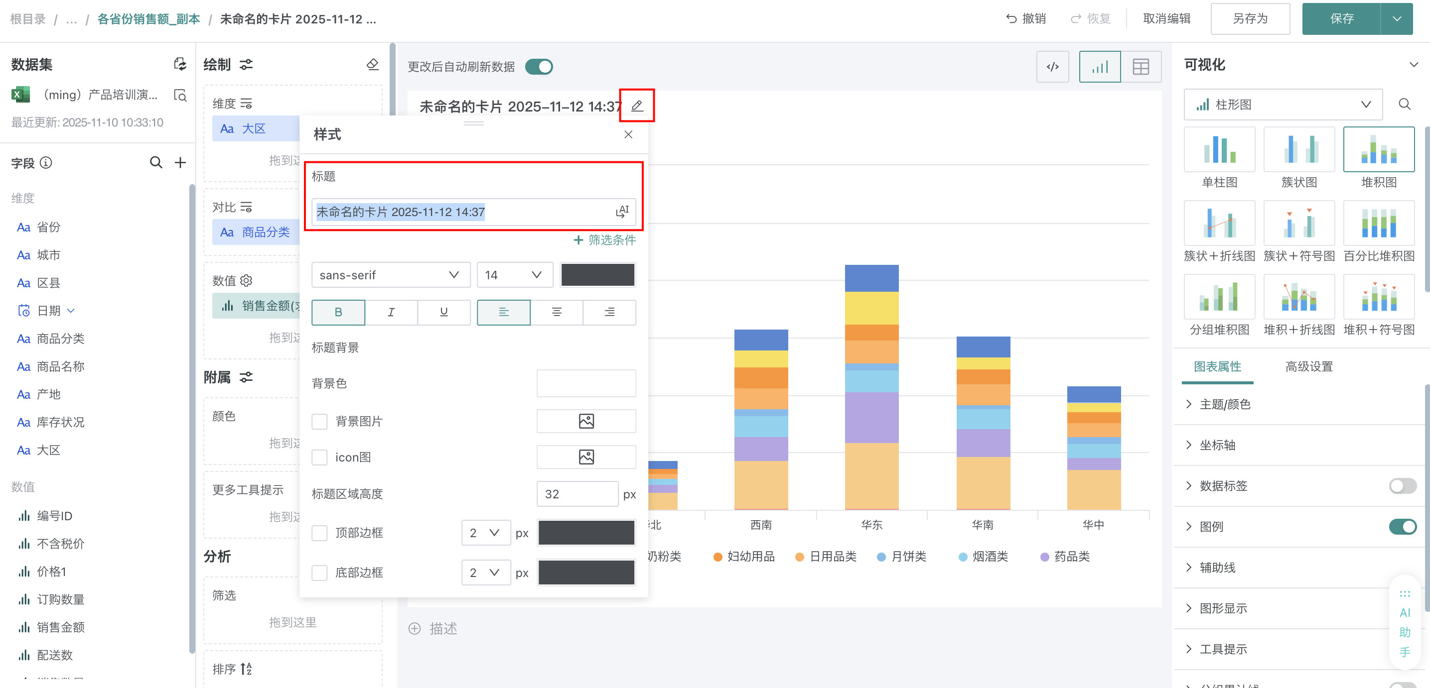 在「可视化」区域中选择「堆积图」,将左侧「数据集」区域的「大区」拖至「绘制」区域的「维度」,「商品分类」拖入「对比」,「销售金额」拖入「数值」。
