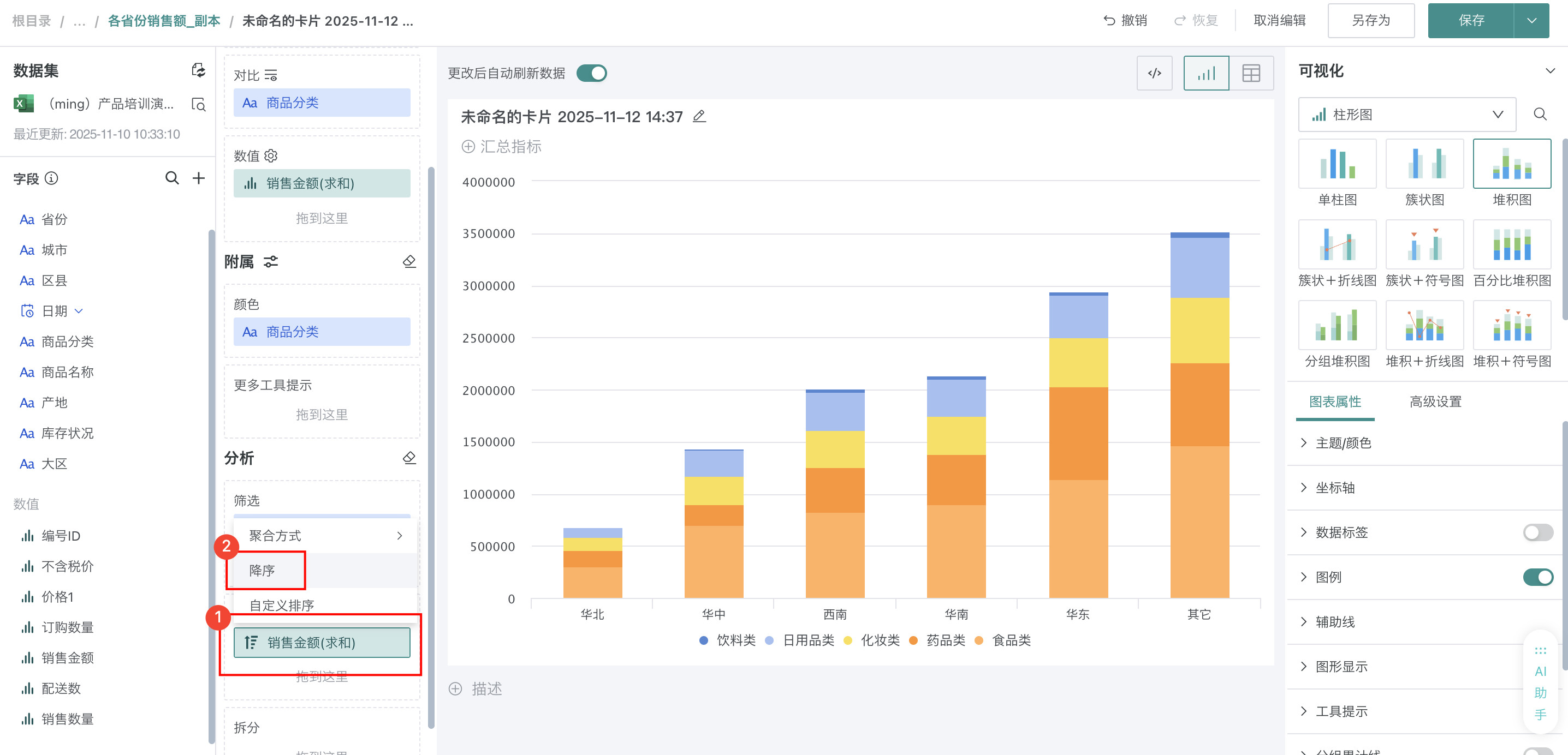 将「销售金额」字段拖至「排序」区域,默认按照「升序」排序,点击「降序」,排序详细配置可参考数据排序。
