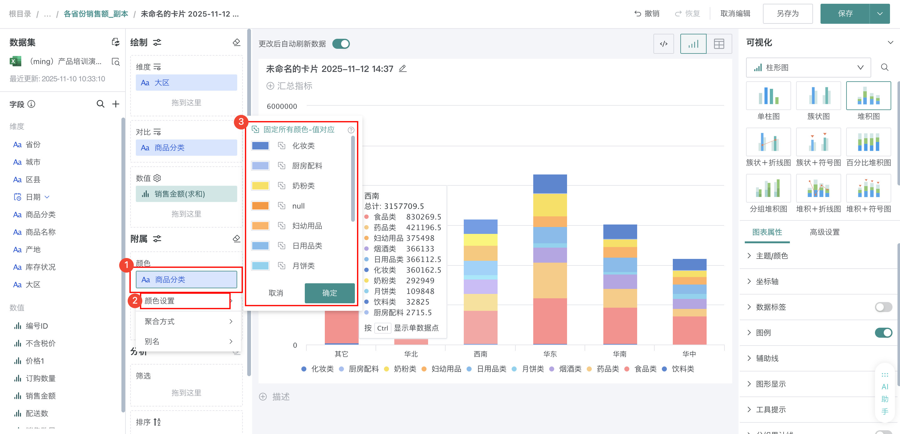 将「商品分类」字段拖至「颜色」区域,点击字段后选择「颜色设置」,可修改不同区域柱子对应的颜色,颜色详细配置可参考图表绘制-颜色。