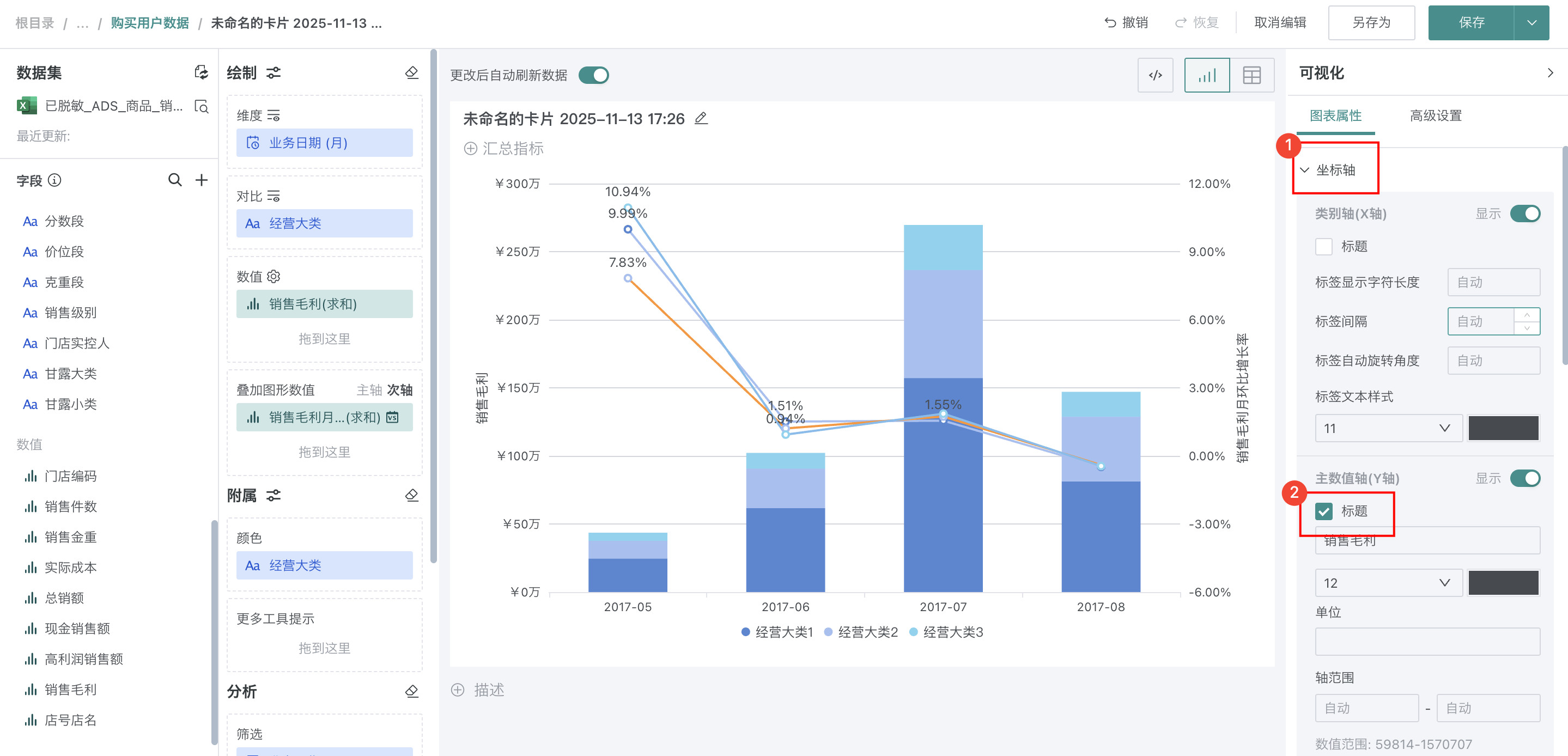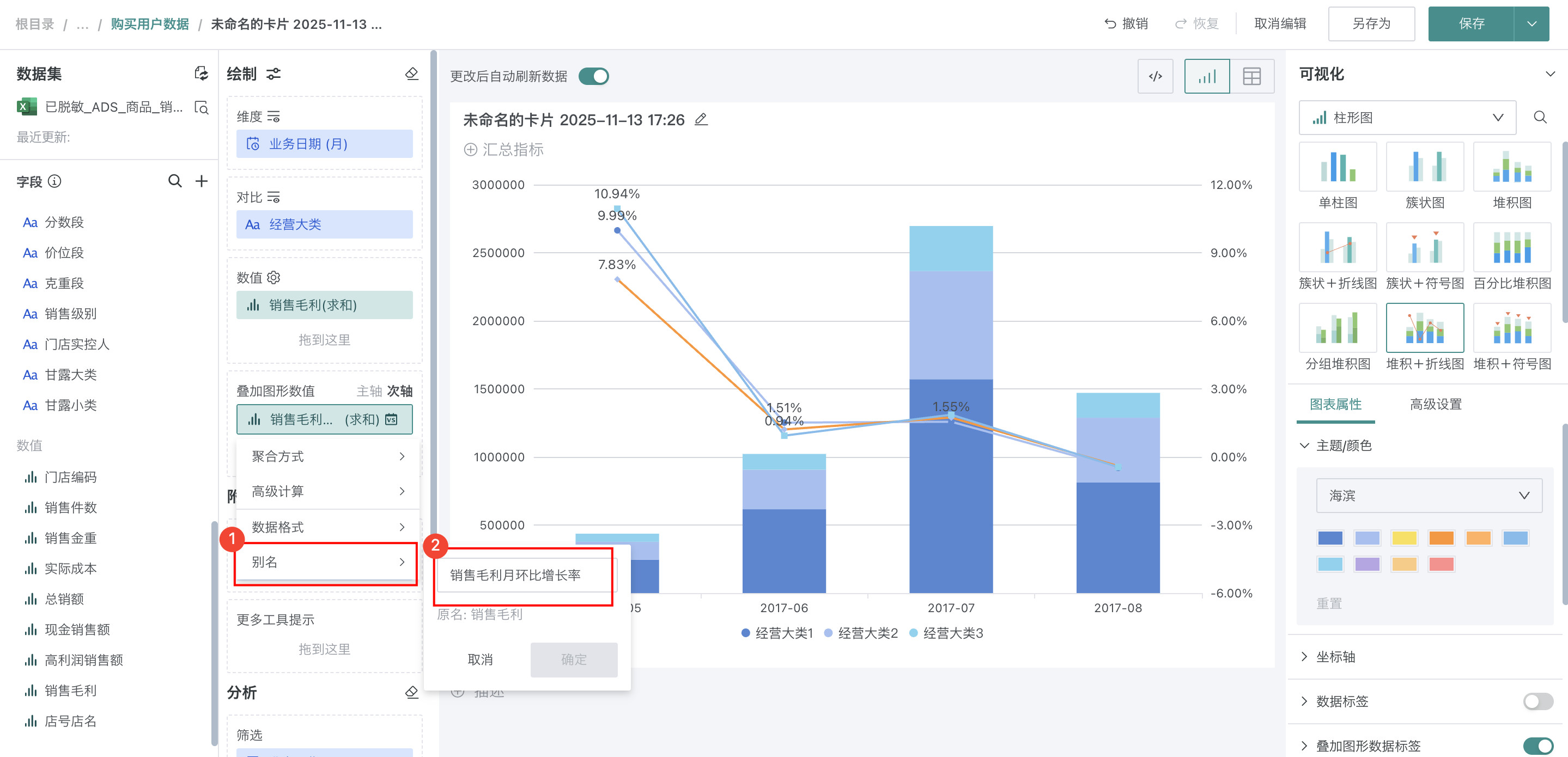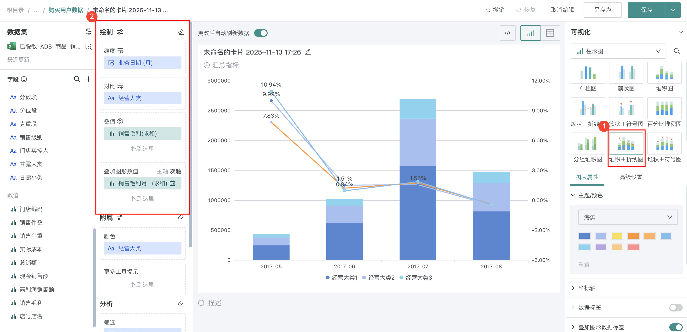 在「可视化」区域中选择「堆积+折线图」,将左侧「数据集」区域的「业务日期(月)」拖至「绘制」区域的「维度」,「经营大类」拖入「对比」,「销售毛利」拖入「数值」。「销售毛利」拖入「叠加图形数值」。