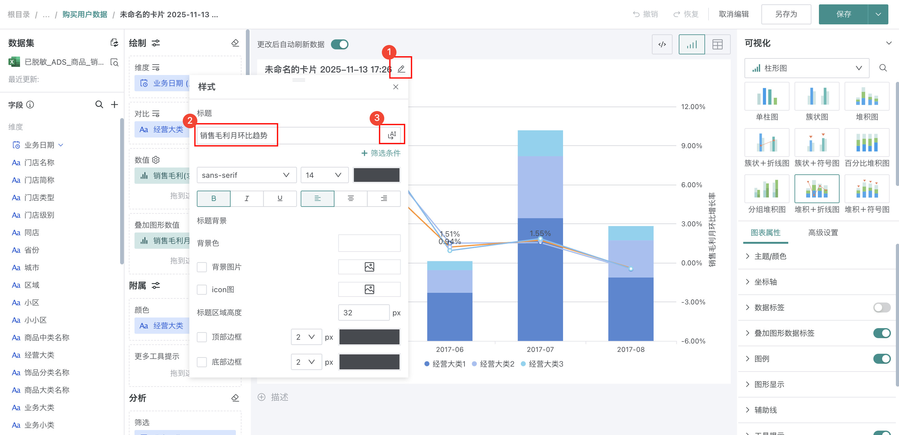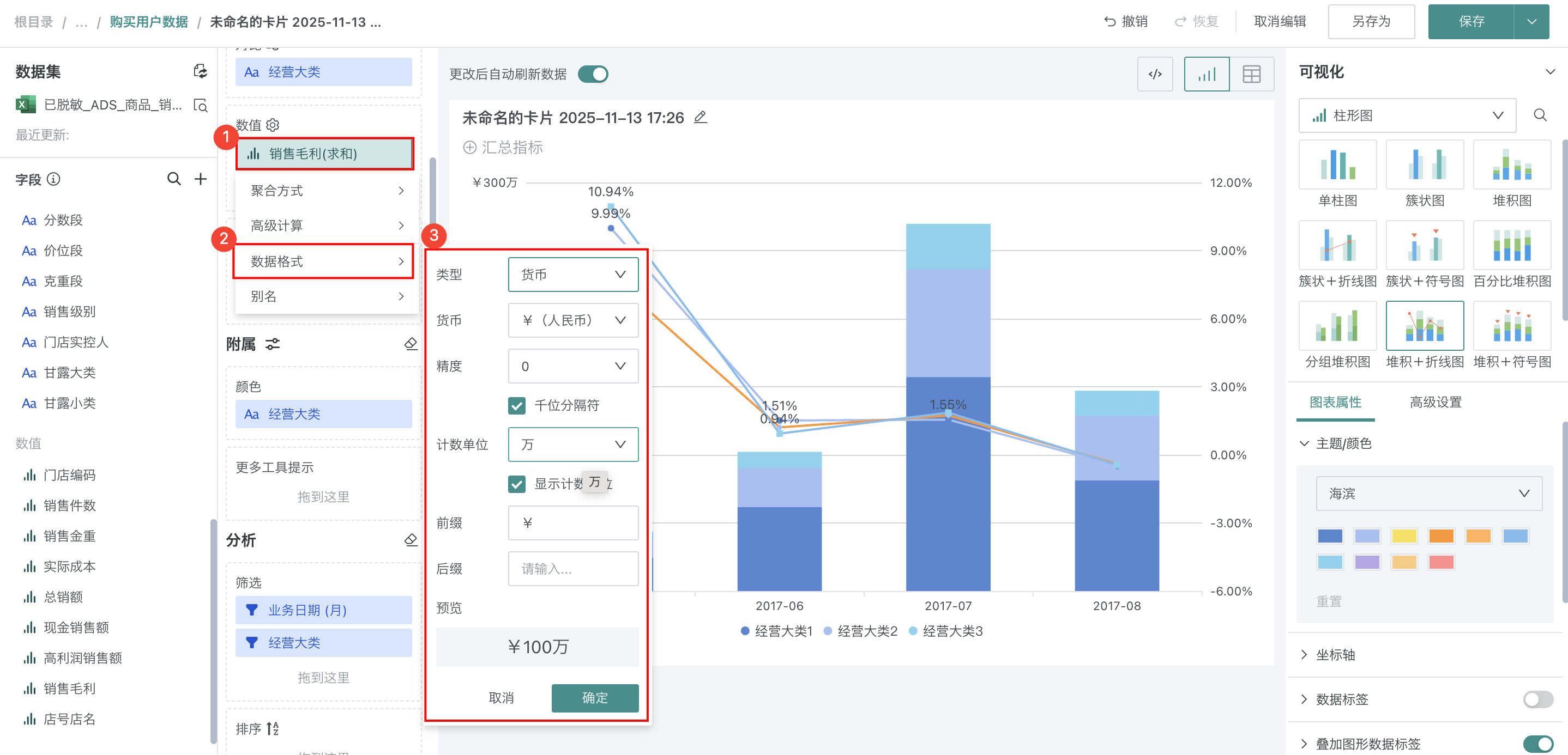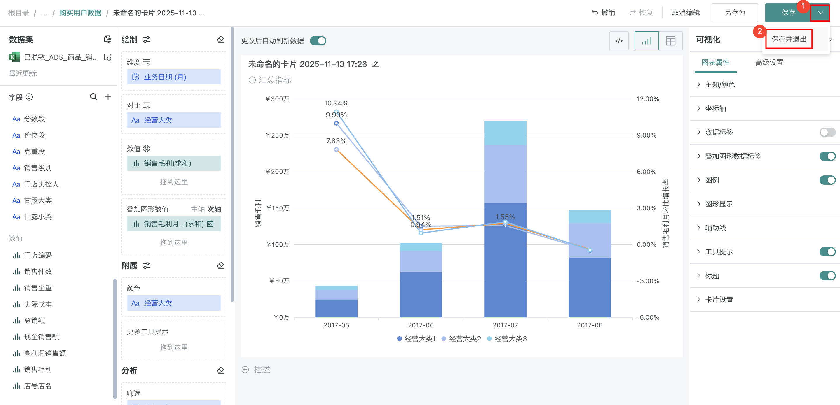 在「可视化」区域中选择「堆积+折线图」,将左侧「数据集」区域的「业务日期(月)」拖至「绘制」区域的「维度」,「经营大类」拖入「对比」,「销售毛利」拖入「数值」。「销售毛利」拖入「叠加图形数值」。