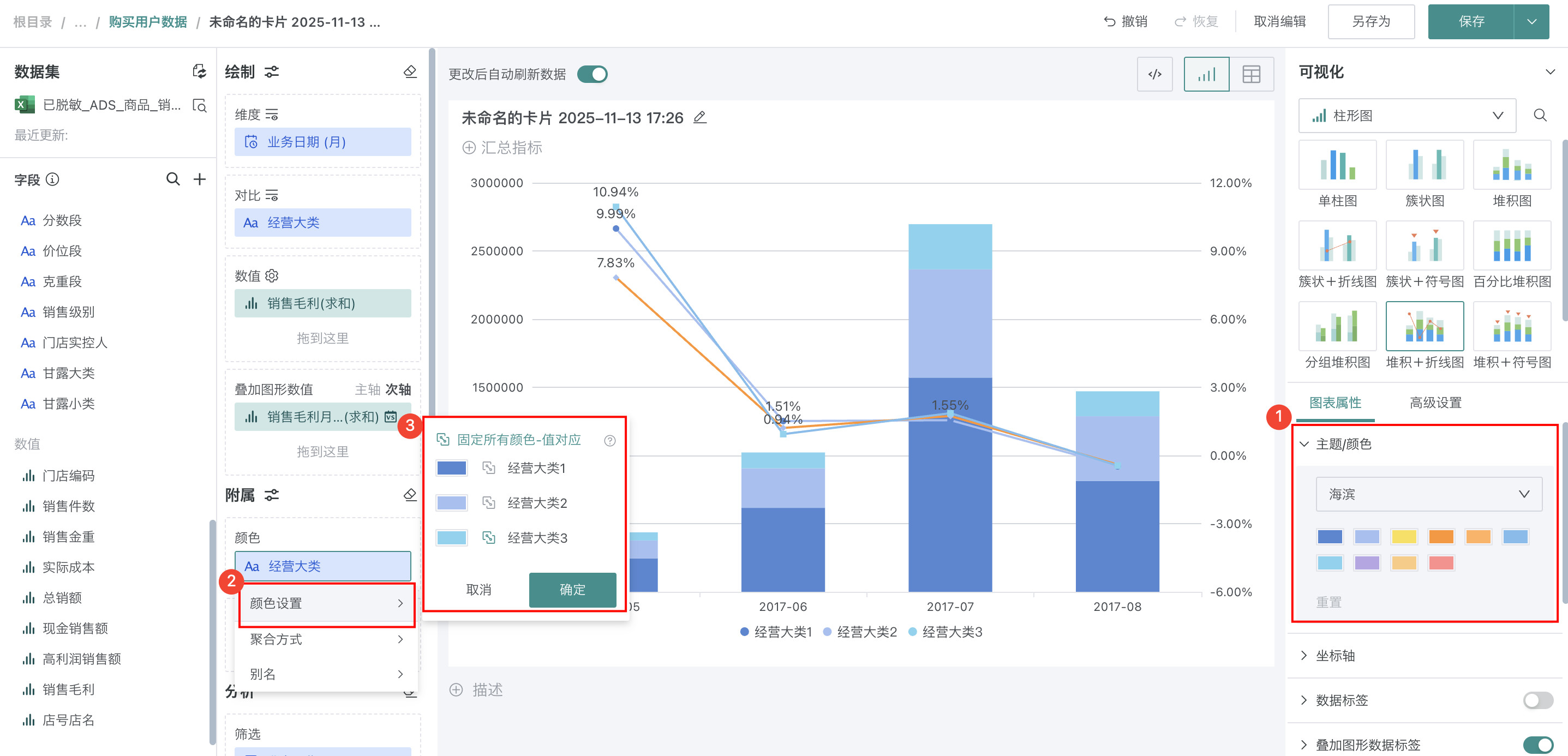 可以先在右侧「主题/颜色」进行选择,再将「经营大类」字段拖至「颜色」区域,点击字段后选择「颜色设置」,可修改不同区域柱子对应的颜色,颜色详细配置可参考图表绘制-颜色。