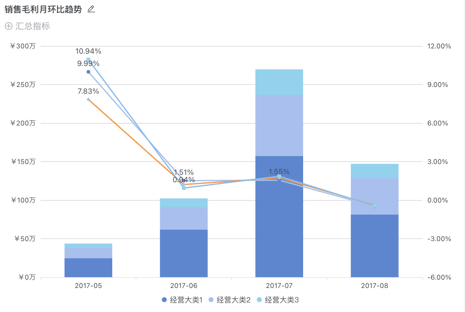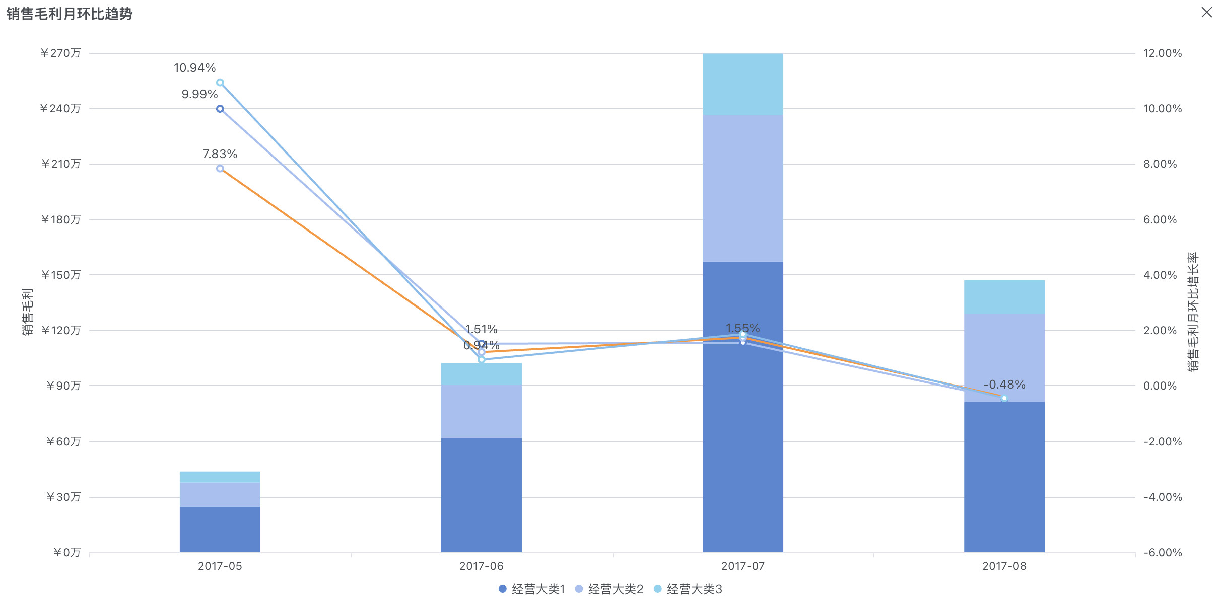 例如,不同经营类别的月销售毛利在当月总销售毛利的占比及销售毛利月环比增长率趋势,如下图所示:
