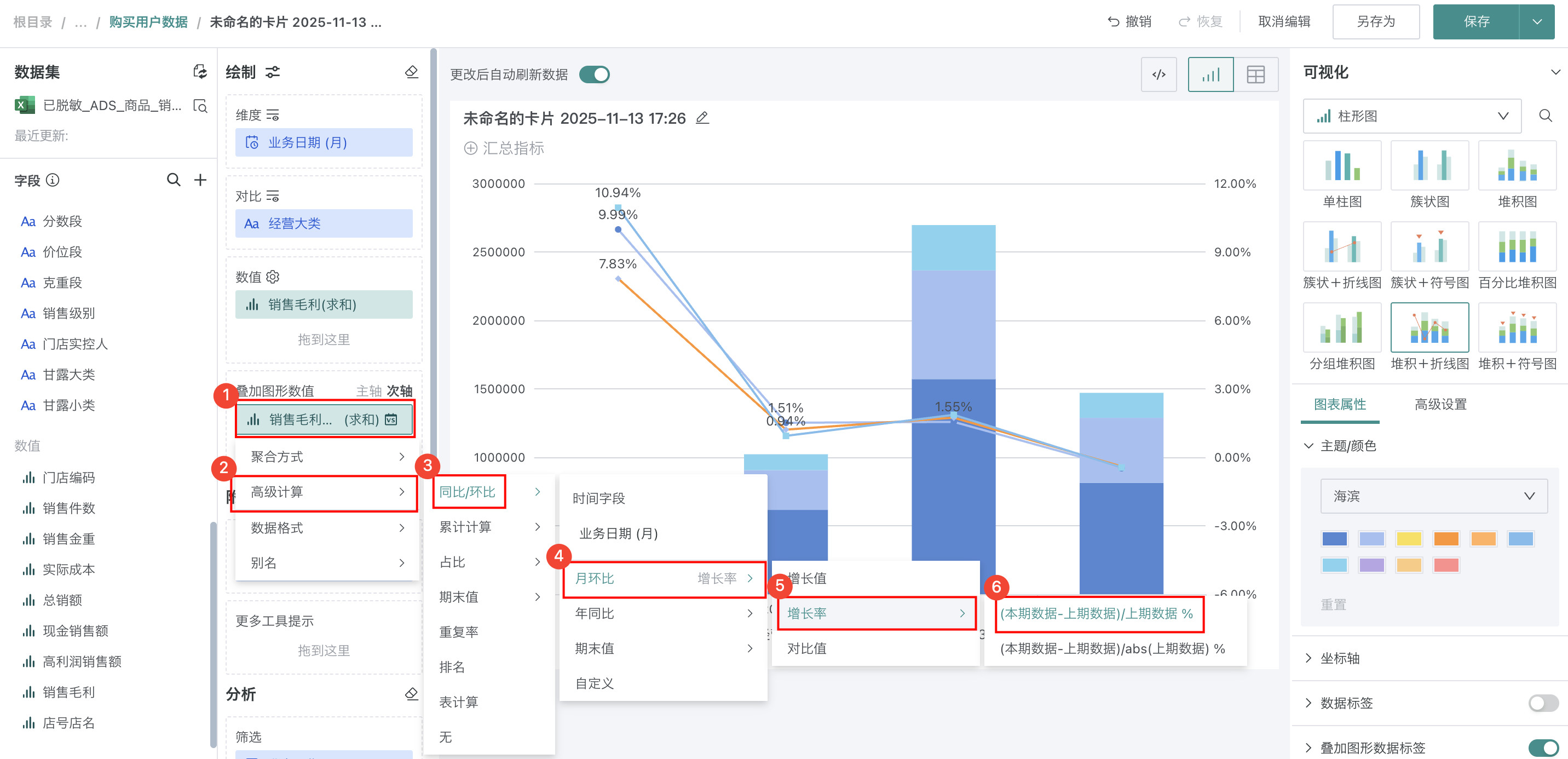 依次点击「高级计算>同比/环比>月环比>增长率>(本期数据-上期数据)/上期数据%」。