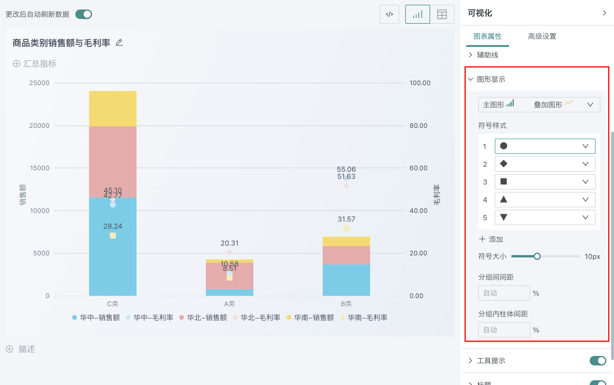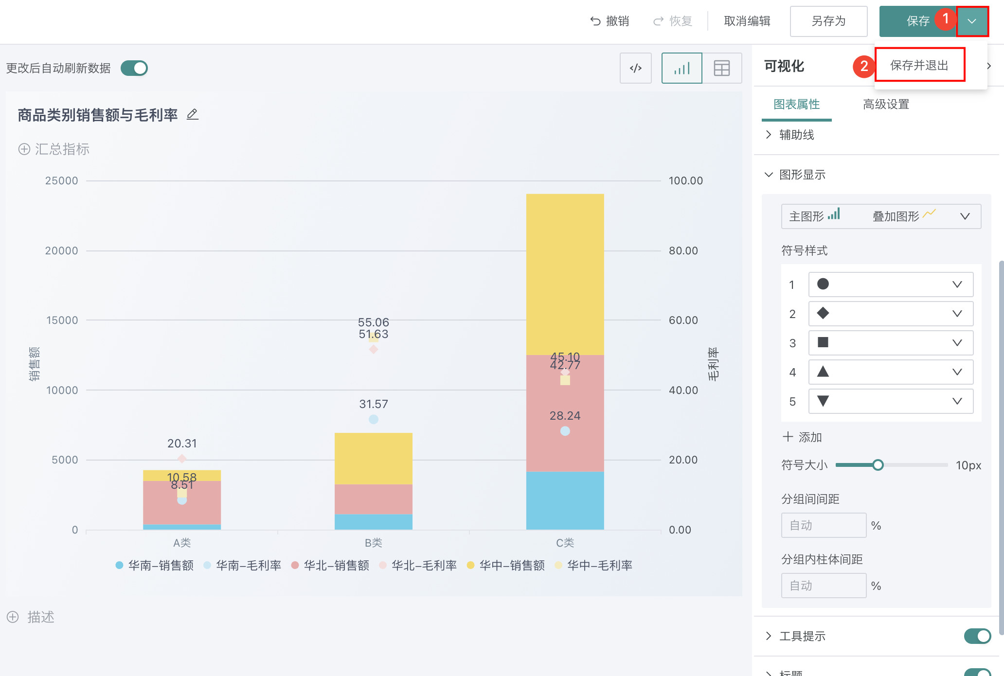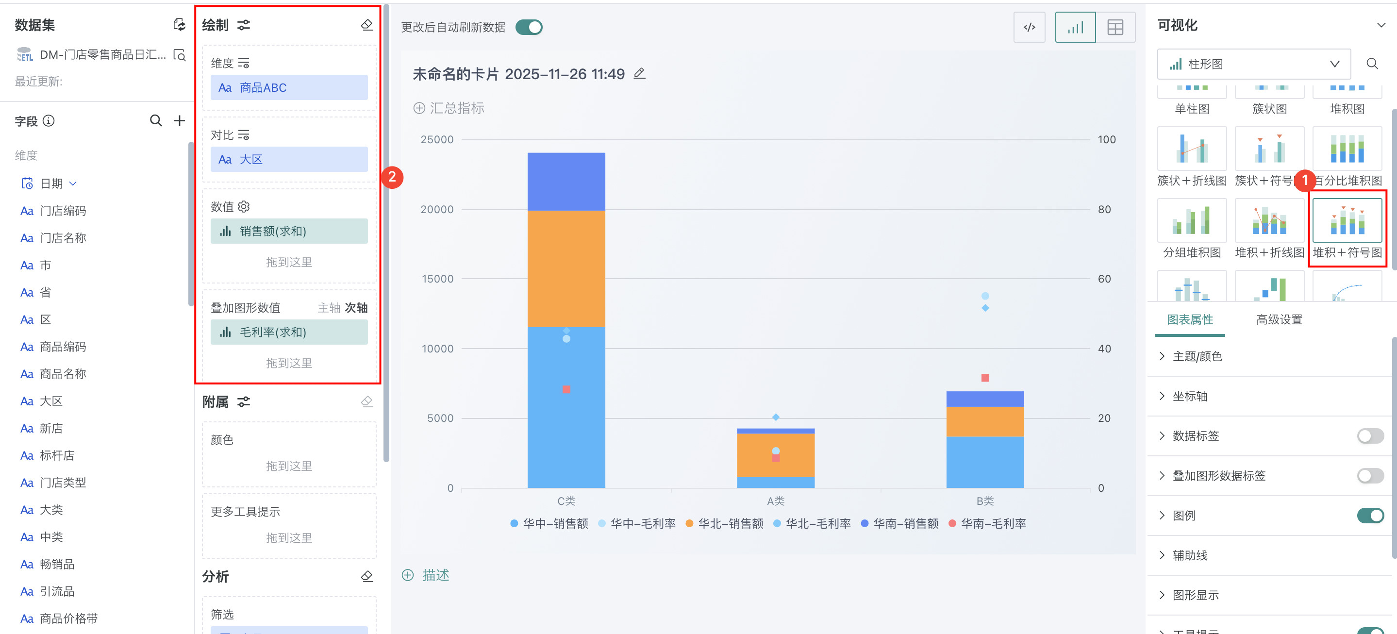 在「可视化」区域中选择「堆积+符号图」,将左侧「数据集」区域的「商品ABC」拖至「绘制」区域的「维度」,「大区」拖至「对比」,「销售额」拖至「数值」,「叠加图形数值」拖入「毛利率」。