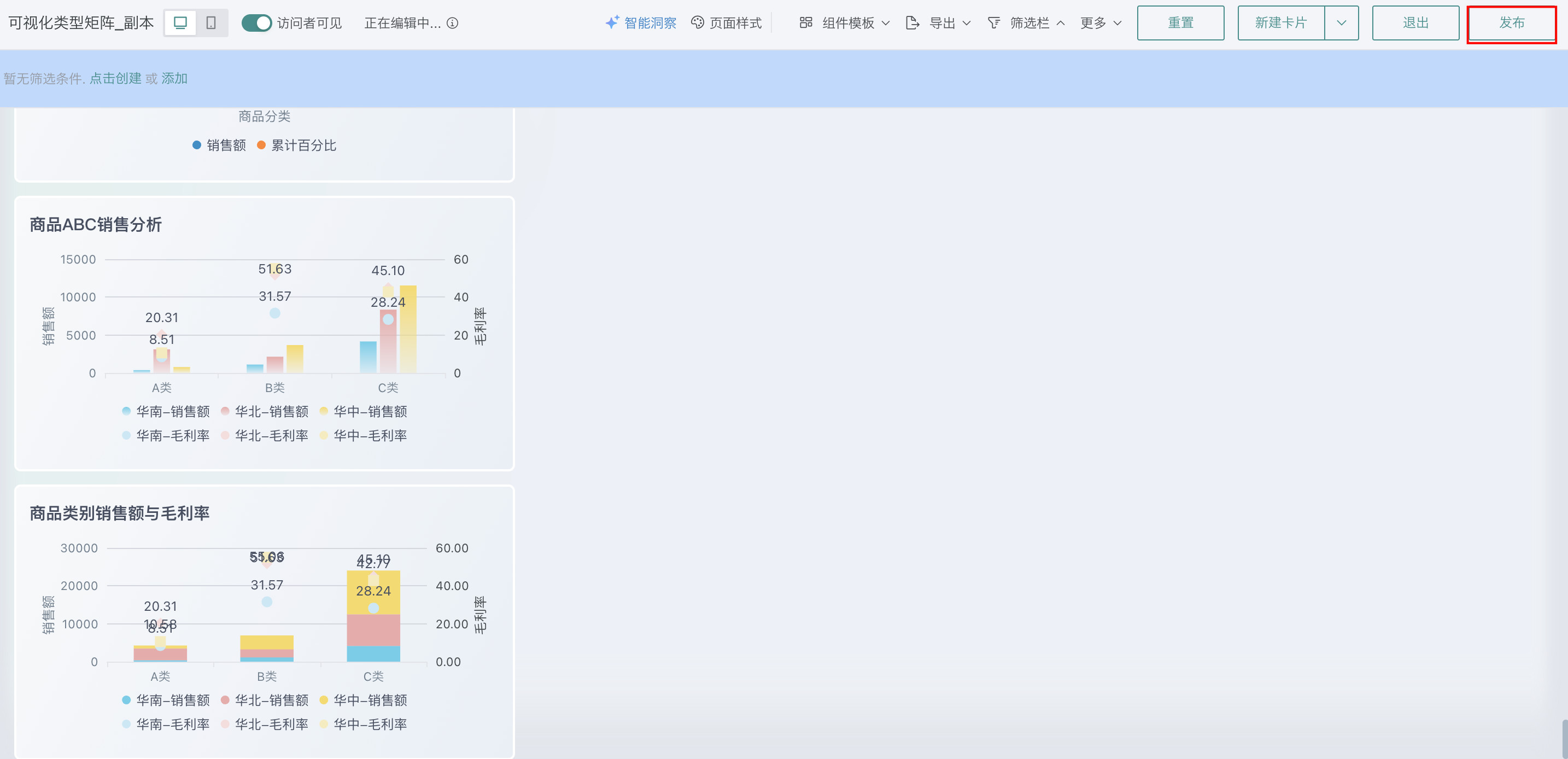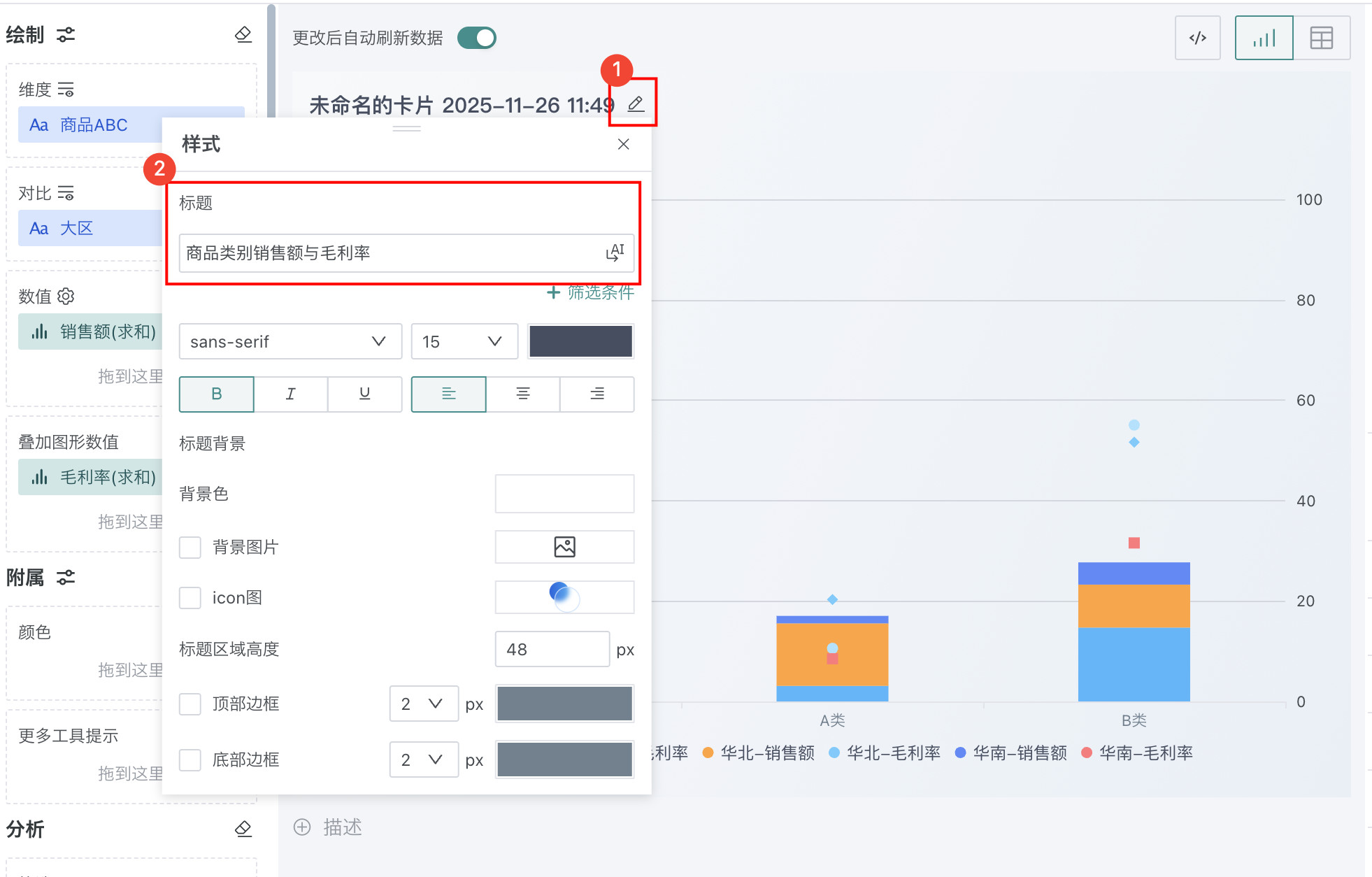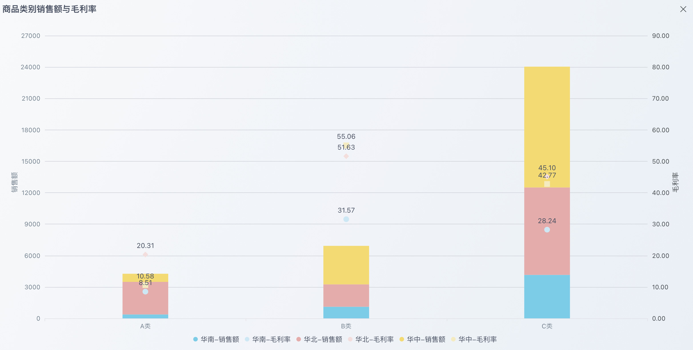 在「可视化」区域中选择「堆积+符号图」,将左侧「数据集」区域的「商品ABC」拖至「绘制」区域的「维度」,「大区」拖至「对比」,「销售额」拖至「数值」,「叠加图形数值」拖入「毛利率」。