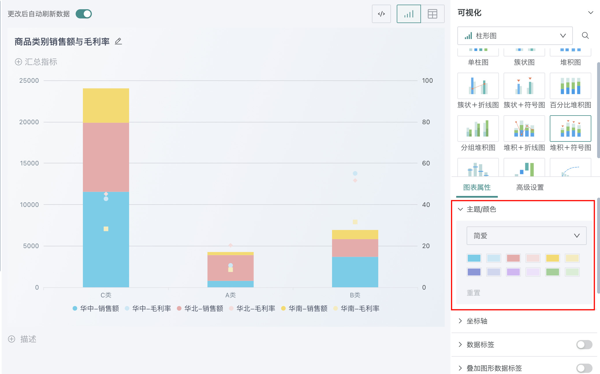 在「图表属性」区域的「主题/颜色」中,可以根据需求和喜好进行选择。