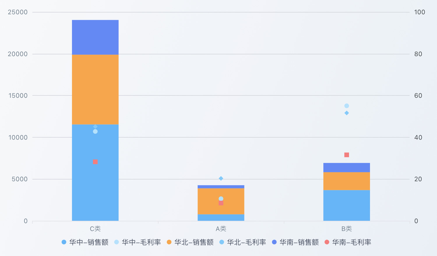 - 信息密度高,综合性强:在一个图表空间内同时展示整体构成、总量对比和另一关键指标的趋势,避免了多个图表分散注意力的麻烦。