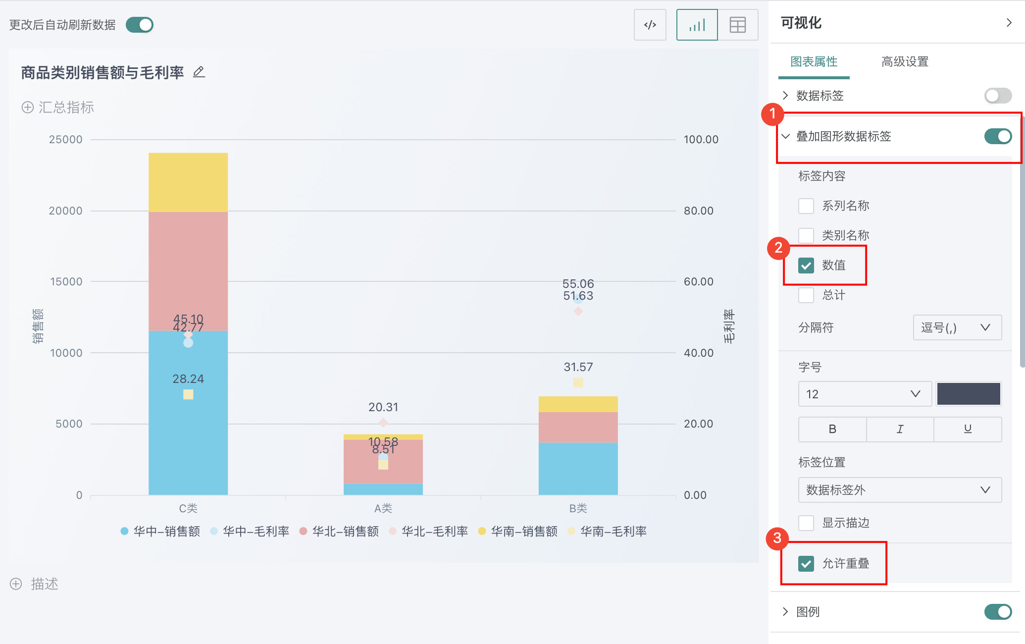 开启后,勾选「数值」会显示各大区毛利率值,还可以设置数值颜色、字号、位置等,勾选「允许重叠」,保证每个数值都能显示出来。