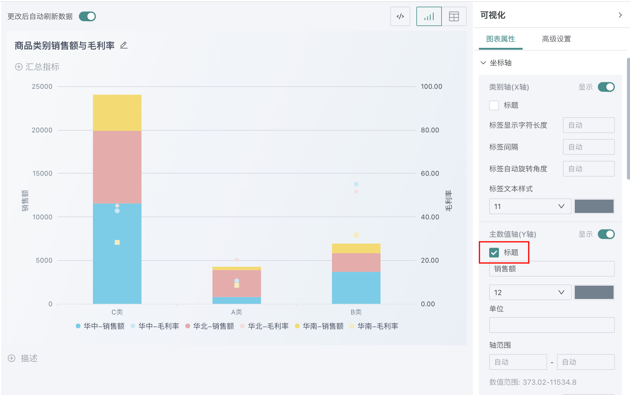 在「图表属性」区域的「坐标轴」中,可以勾选并设置标题名称、字号、颜色等。