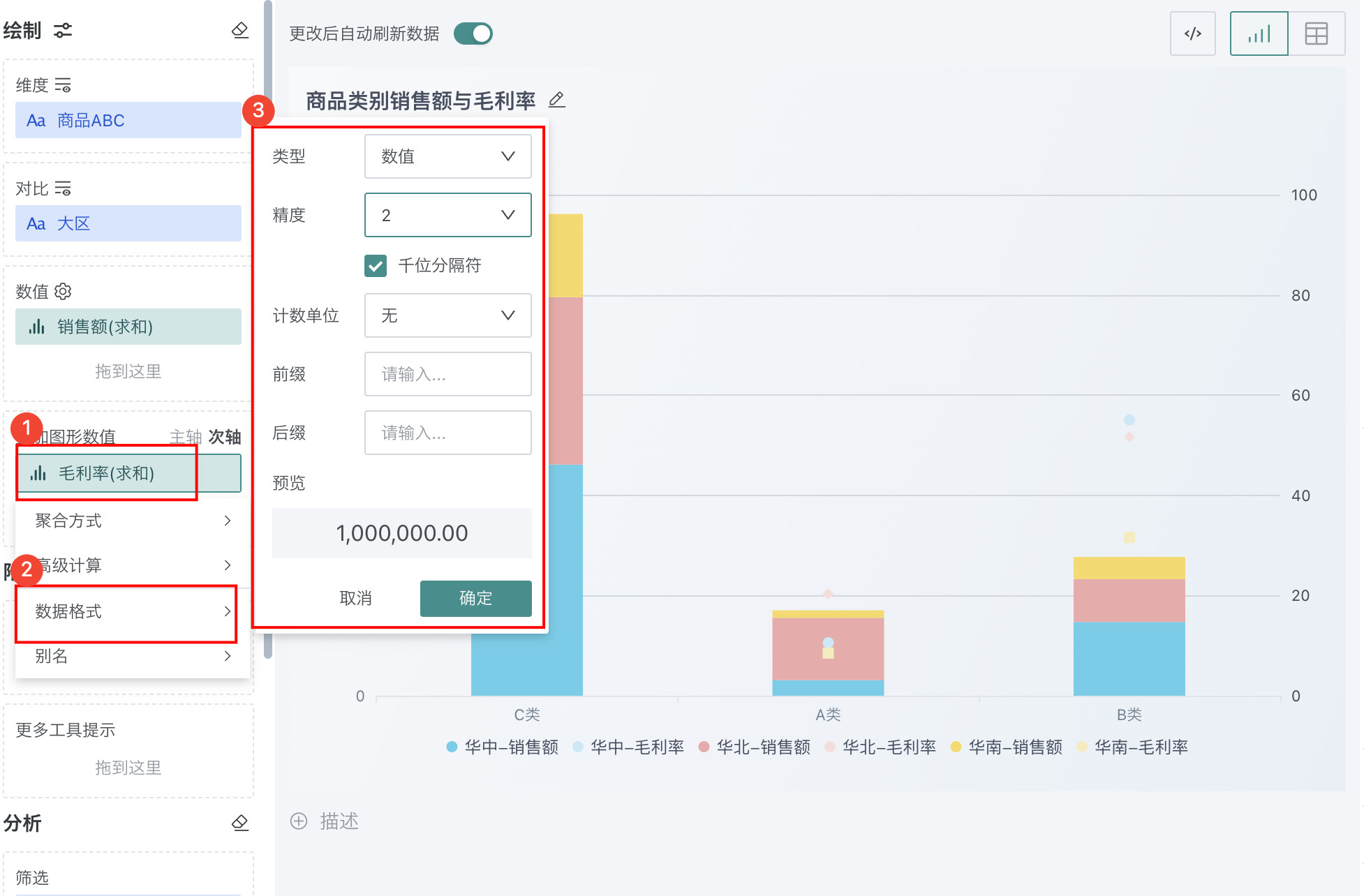 点击「毛利率>数据格式」,「类型」选择「数值」,「精度」选择「2」,「计数单位」选择「无」,点击「确定」。
