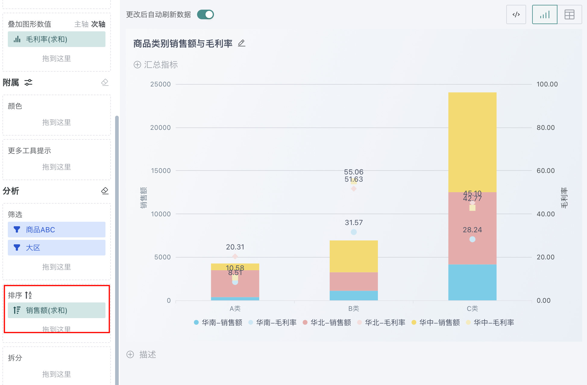 将「销售额」拖至「分析」区域的「排序」中,图表将按照销售额升序呈现。若想降序或者自定义排序,可点击「销售额」进行设置。