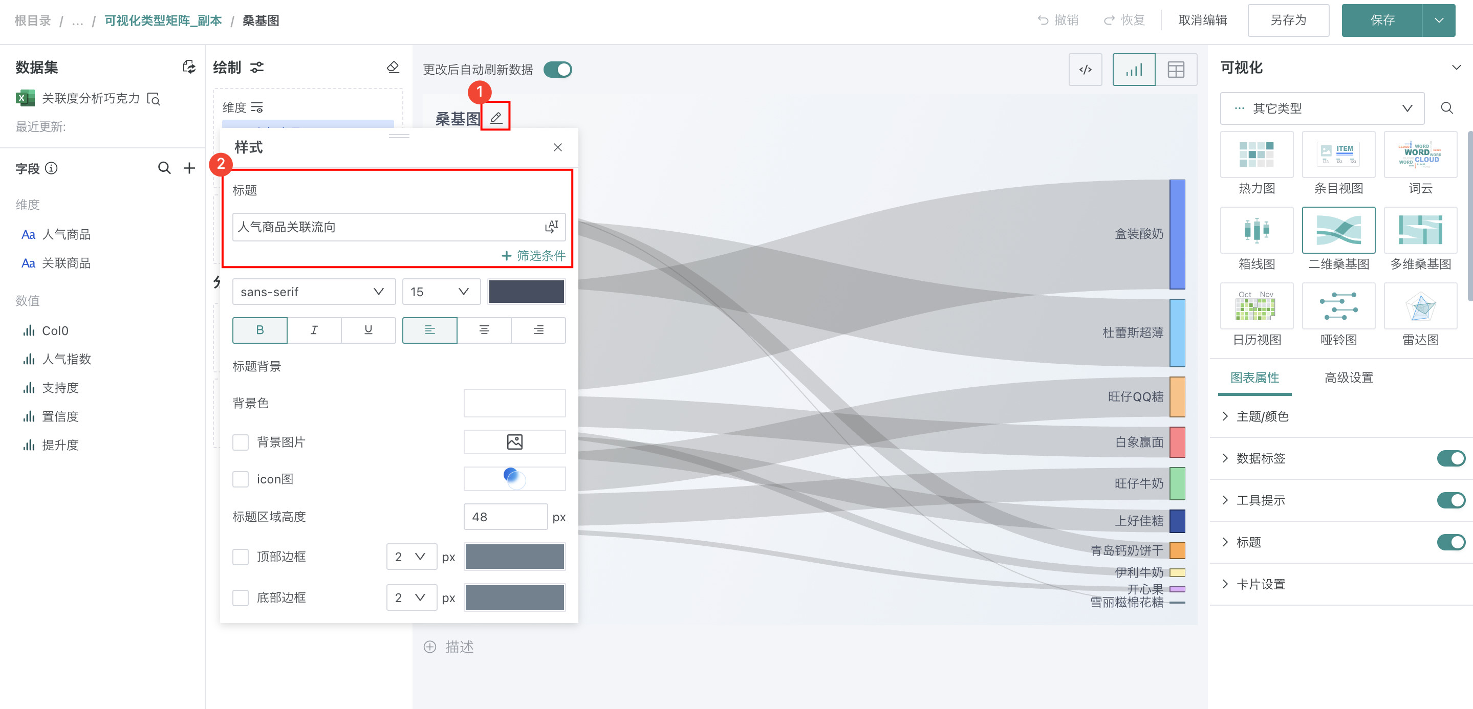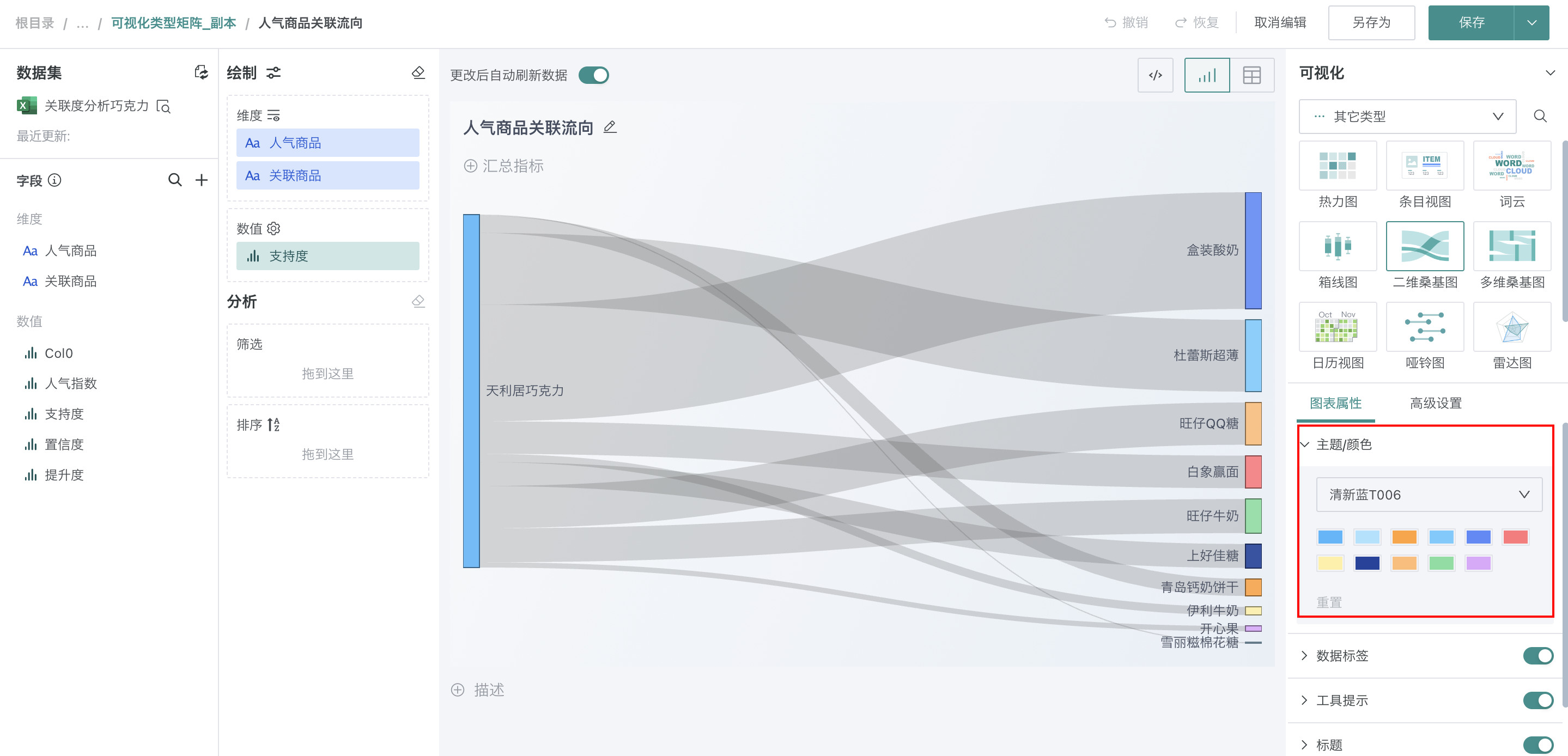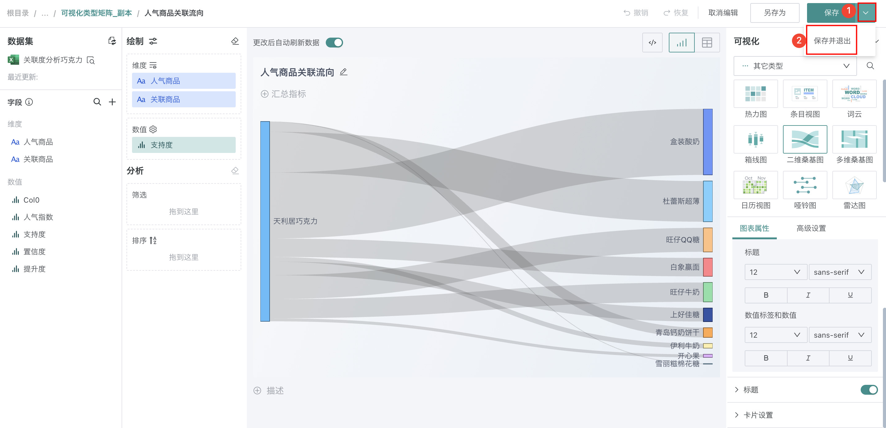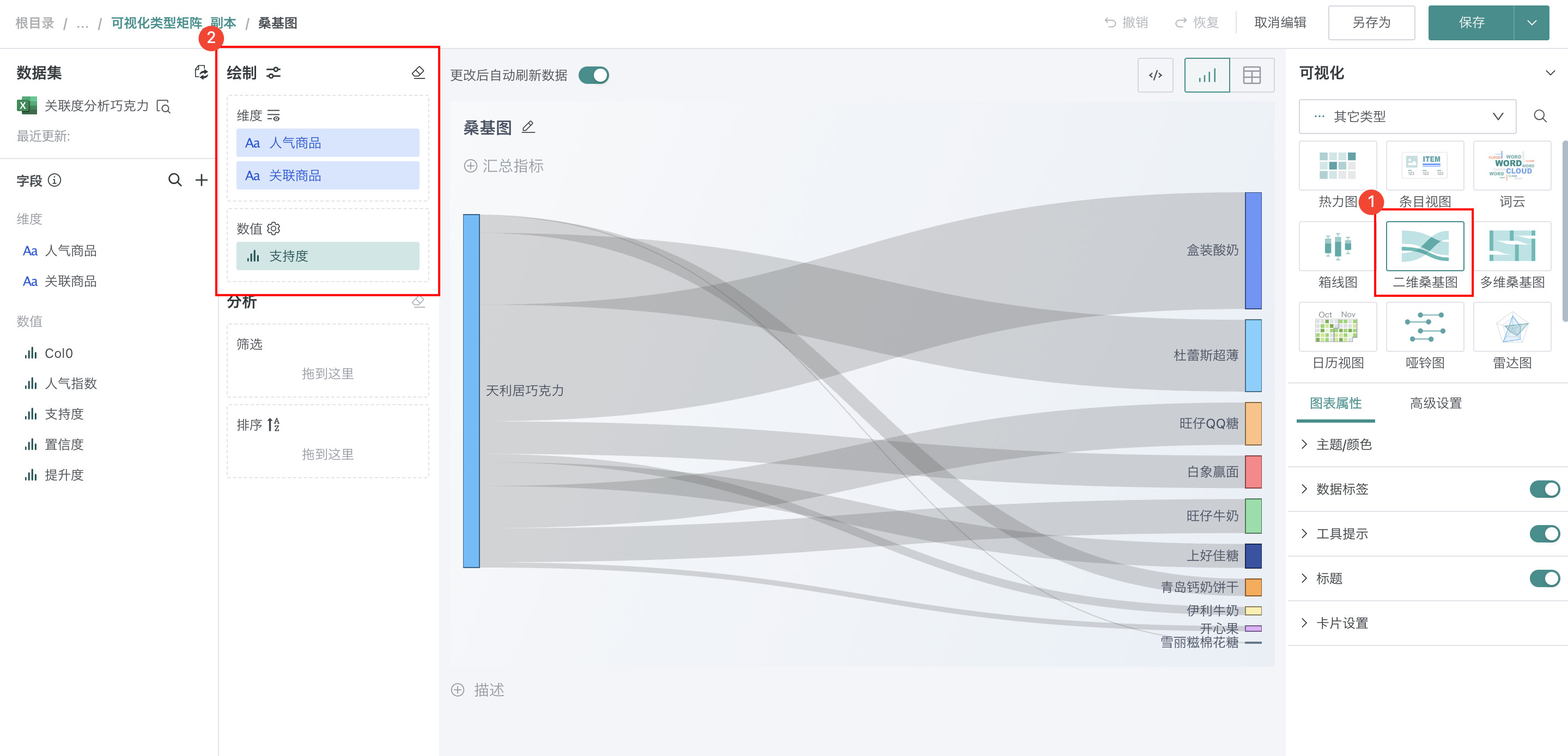 在「可视化」区域中选择「二维桑基图」,将左侧「数据集」区域的「人气商品」和「关联商品」拖至「绘制」区域的「维度」,「支持度」拖至「数值」。