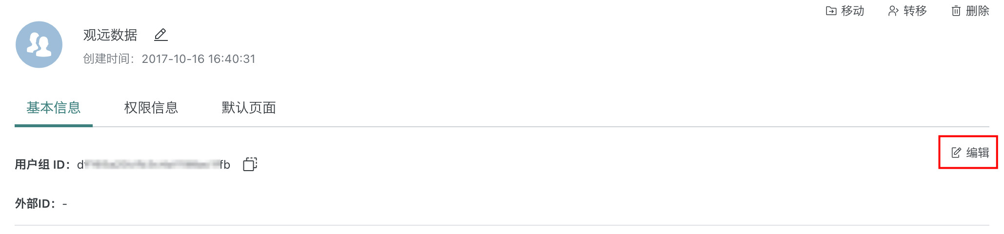 如果用户在产品使用早期创建了很多用户组,后期又启用了账户同步功能,希望能将部分用户关联到这些手工创建的用户组时,可以给手工创建的用户组配置账户同步ID。进入用户组详情页,点击基本信息的编辑按钮,进入编辑状态,可以维护外部ID信息,并保存。