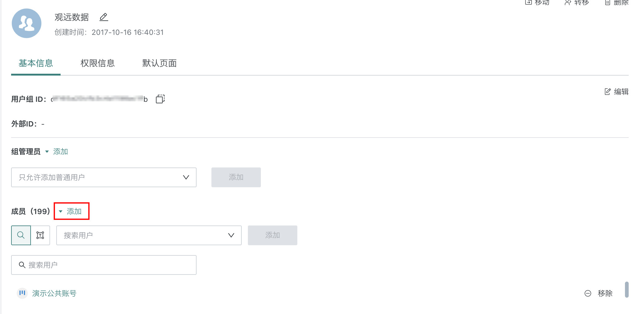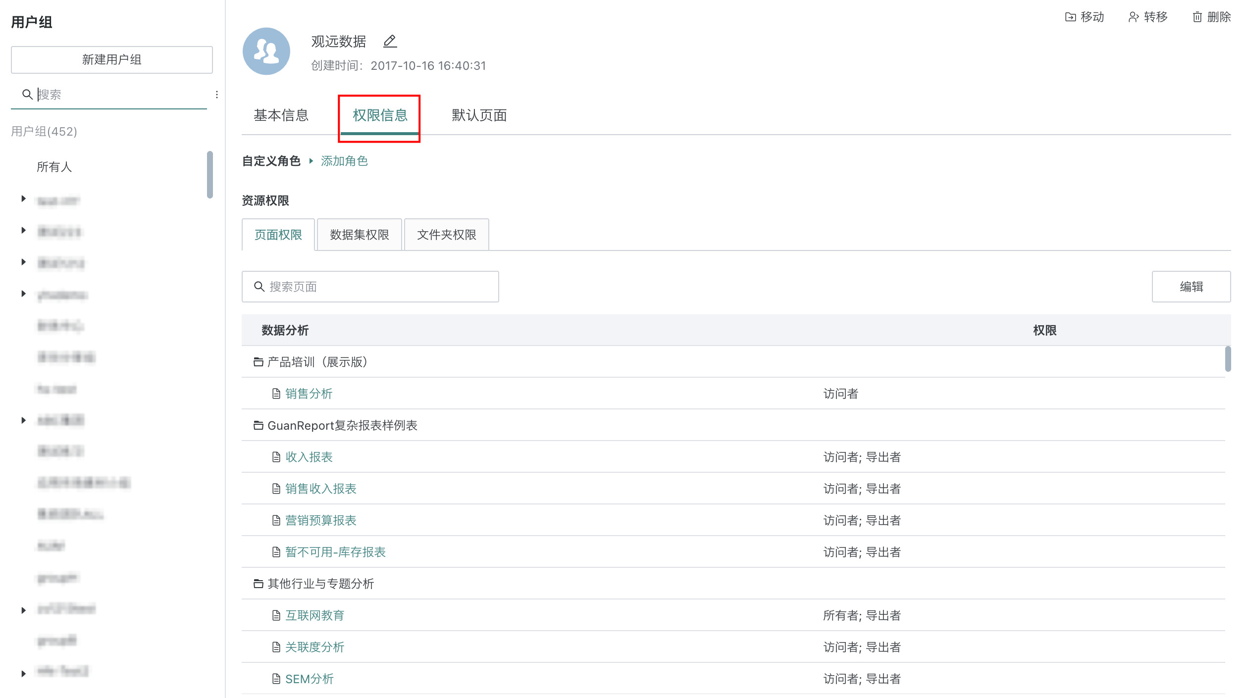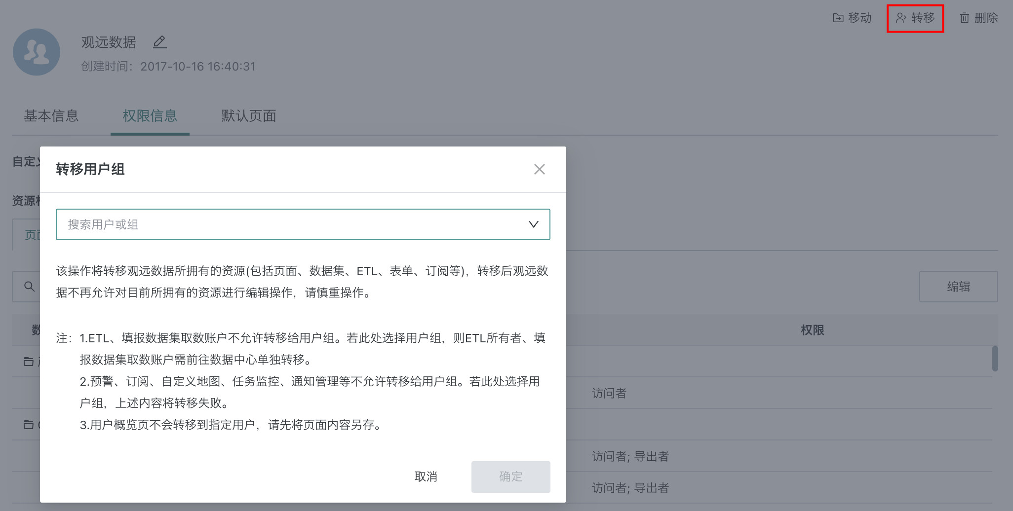 点击「转移」按钮,可将该用户组所拥有的资源(卡片、页面、数据集、ETL、数据账户)转移到其他用户组,转移后该用户组不再允许对目前所拥有的资源进行编辑操作。