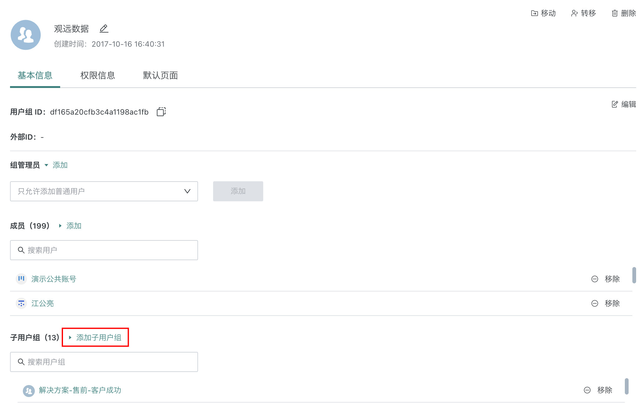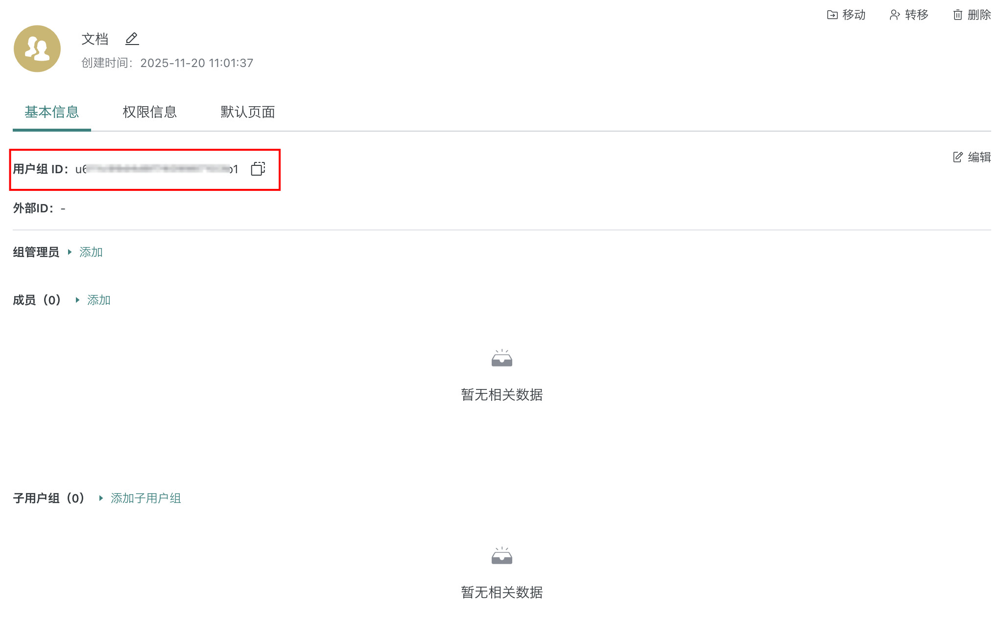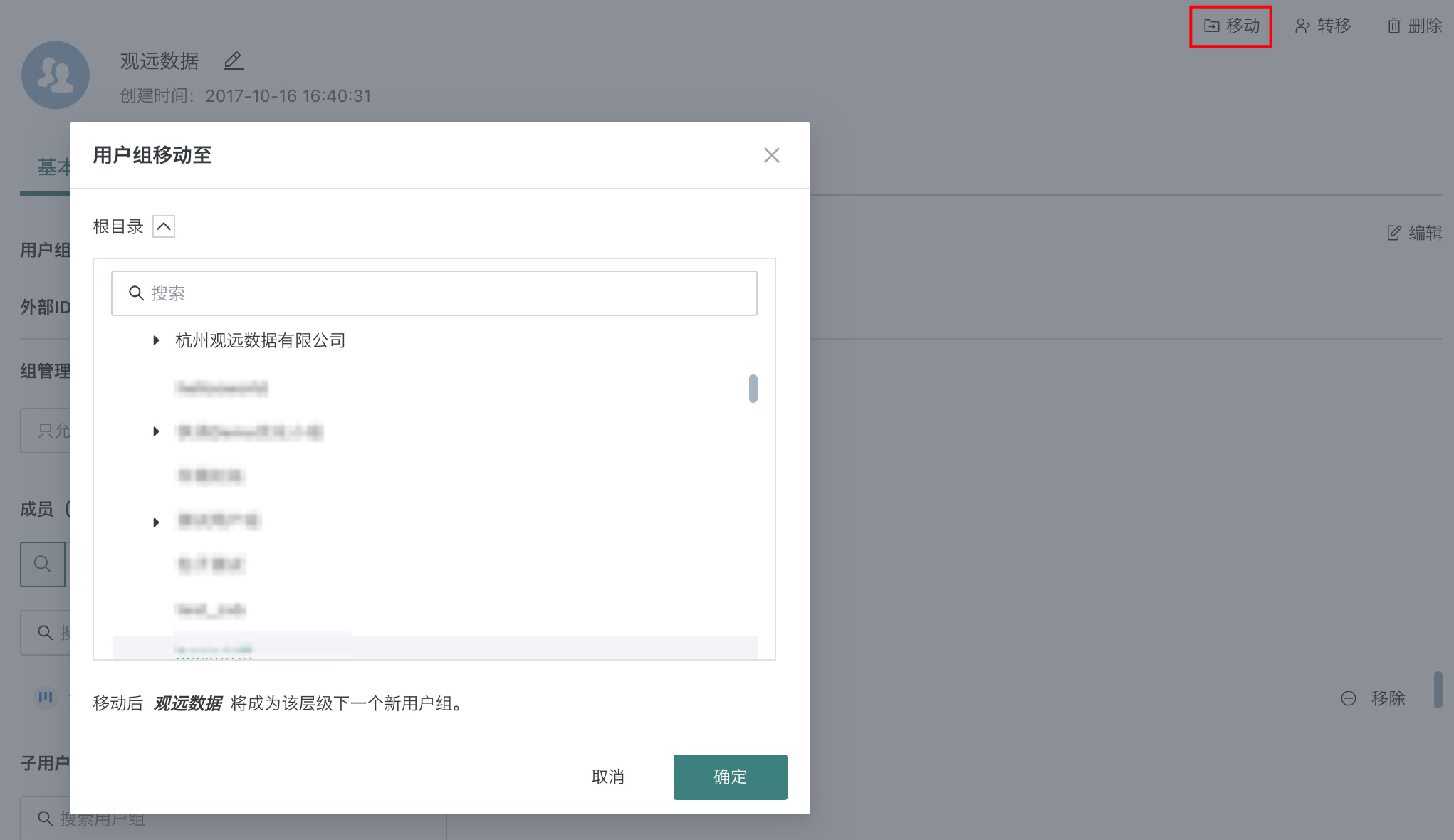 点击用户组详情页面右上角的「移动」按钮,可移动用户组,从而达到修改组织层级结构的目的。